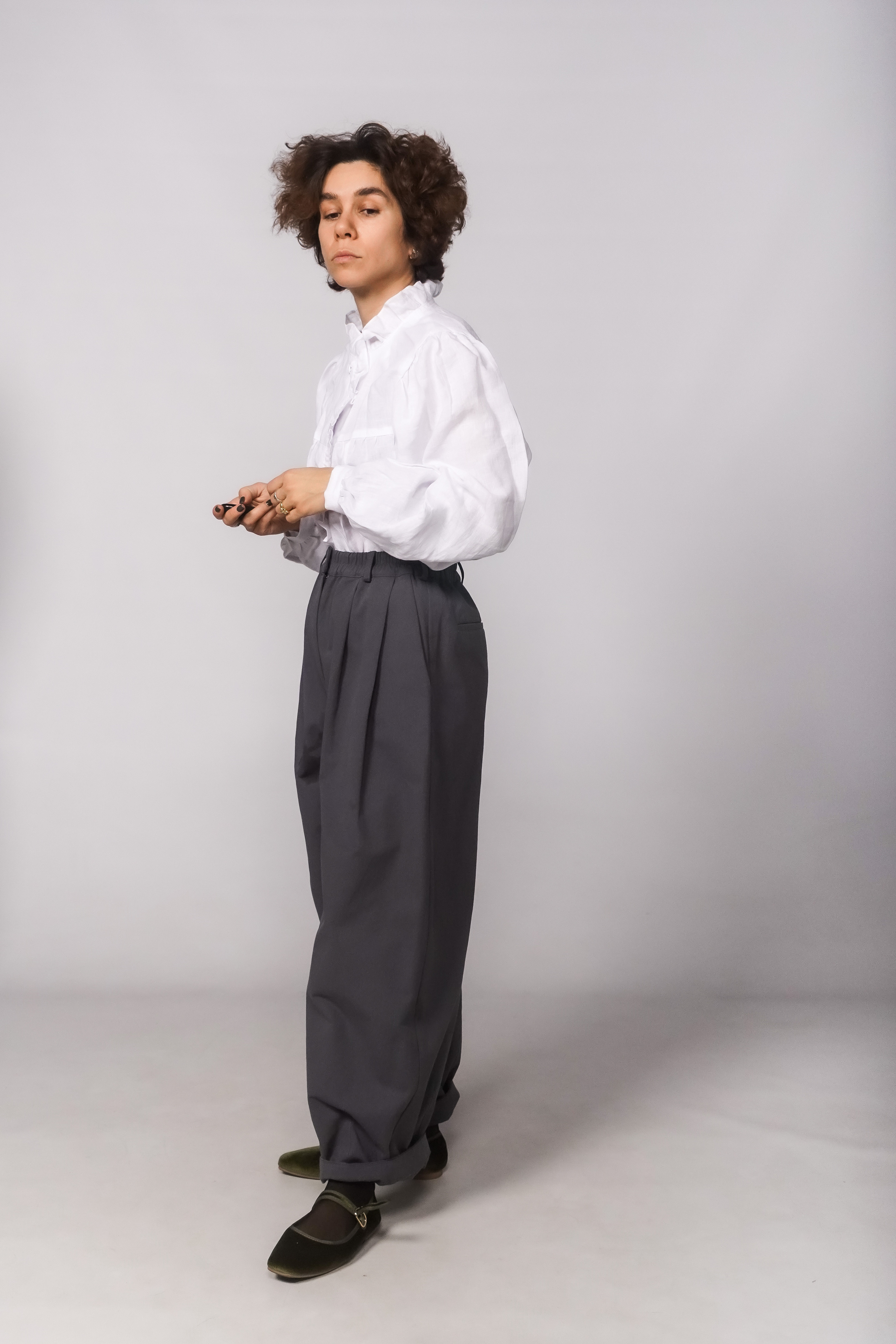 Брюки-бананы из плотной джинсы, есть карманы. Пояс на резинке.
