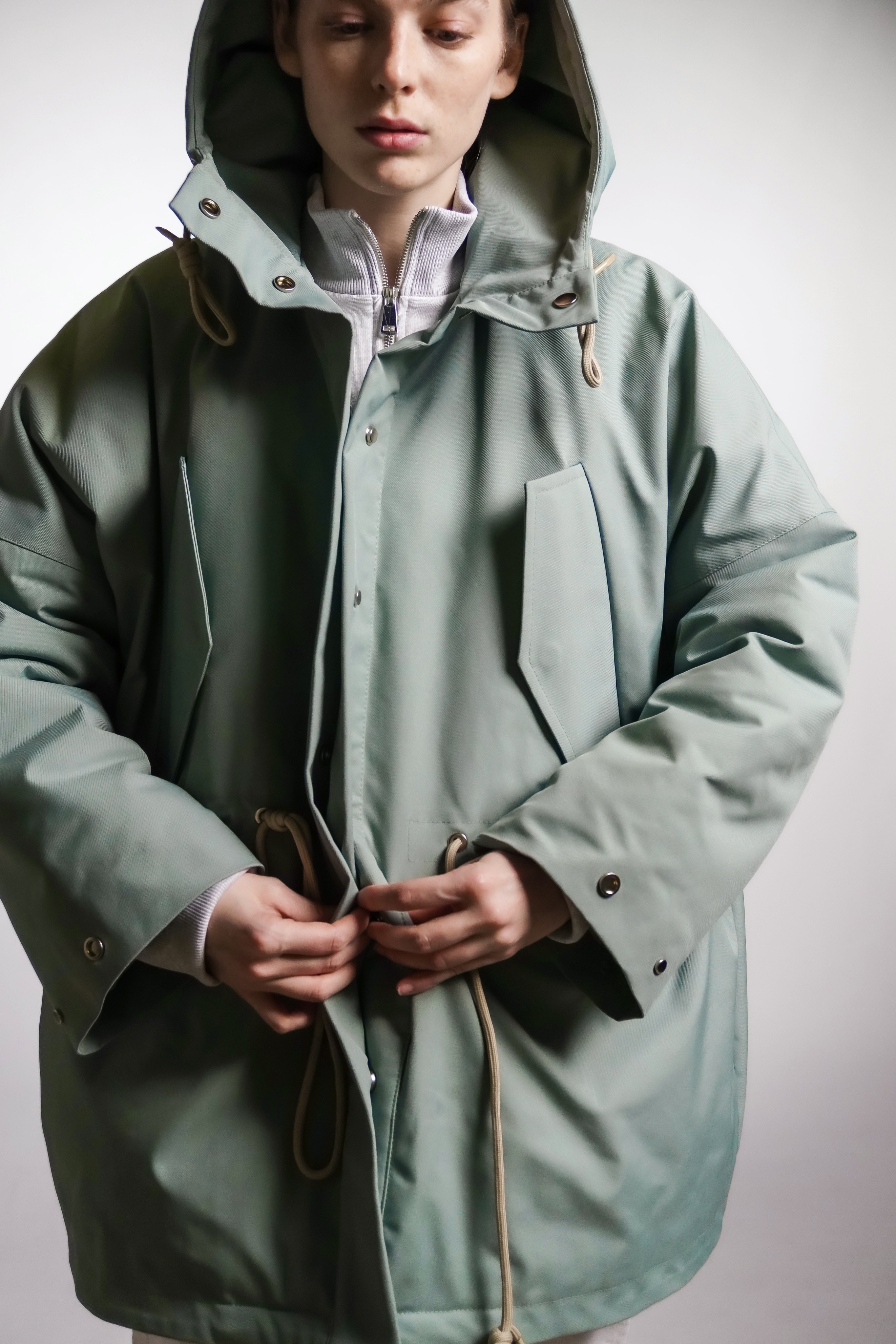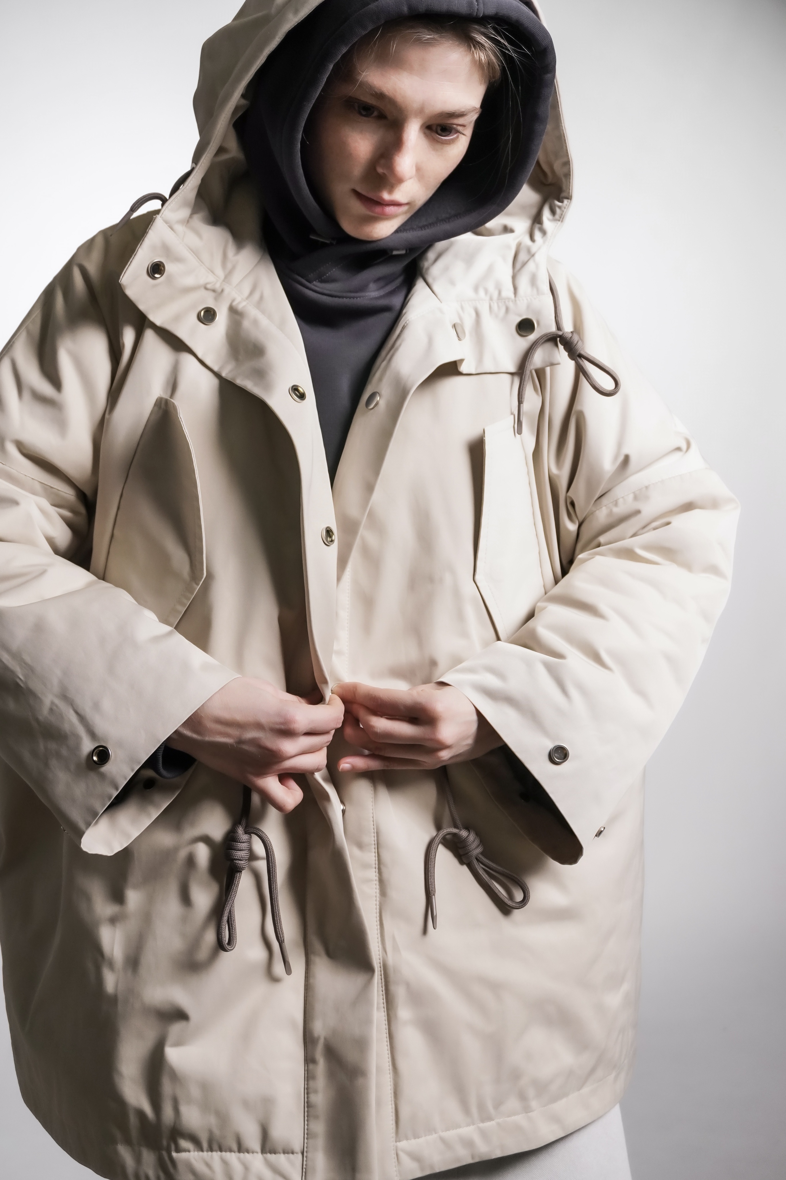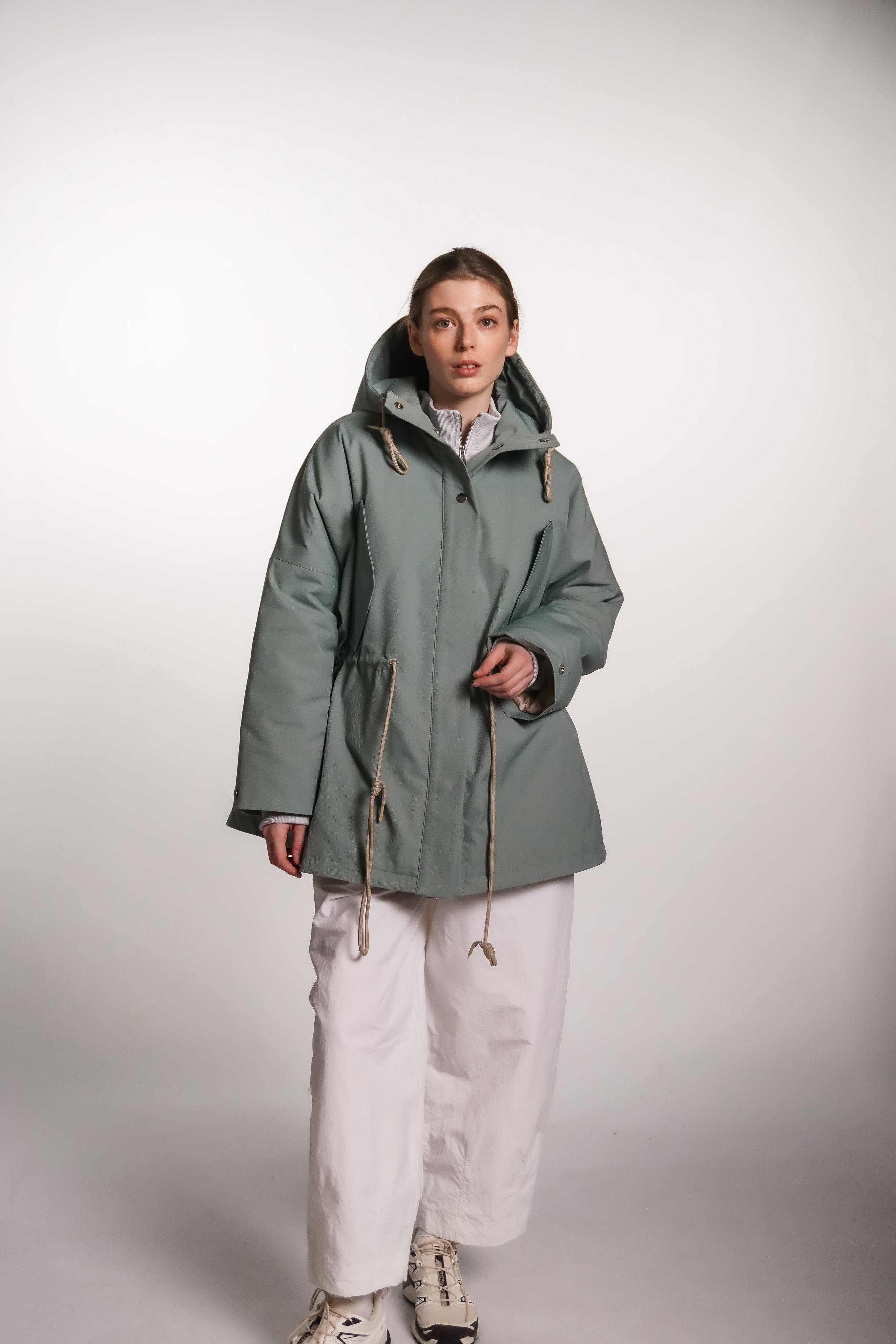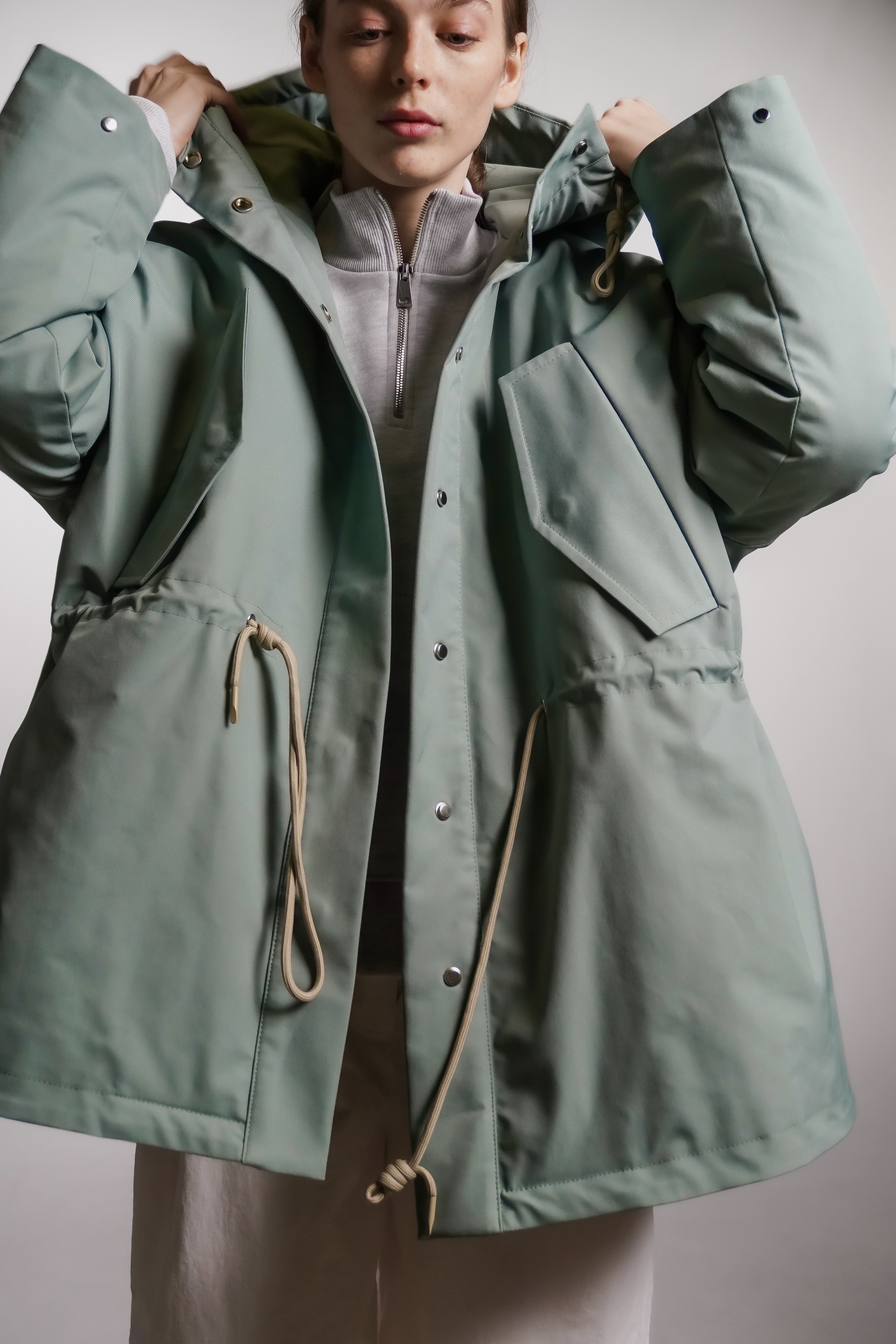 Парка из водоотталкивающей ткани с пропиткой. Изделие идет на подкладке и с утеплителем, кулисками можно регулировать посадку. Застегивается на кнопки. Есть капюшон и карманы.