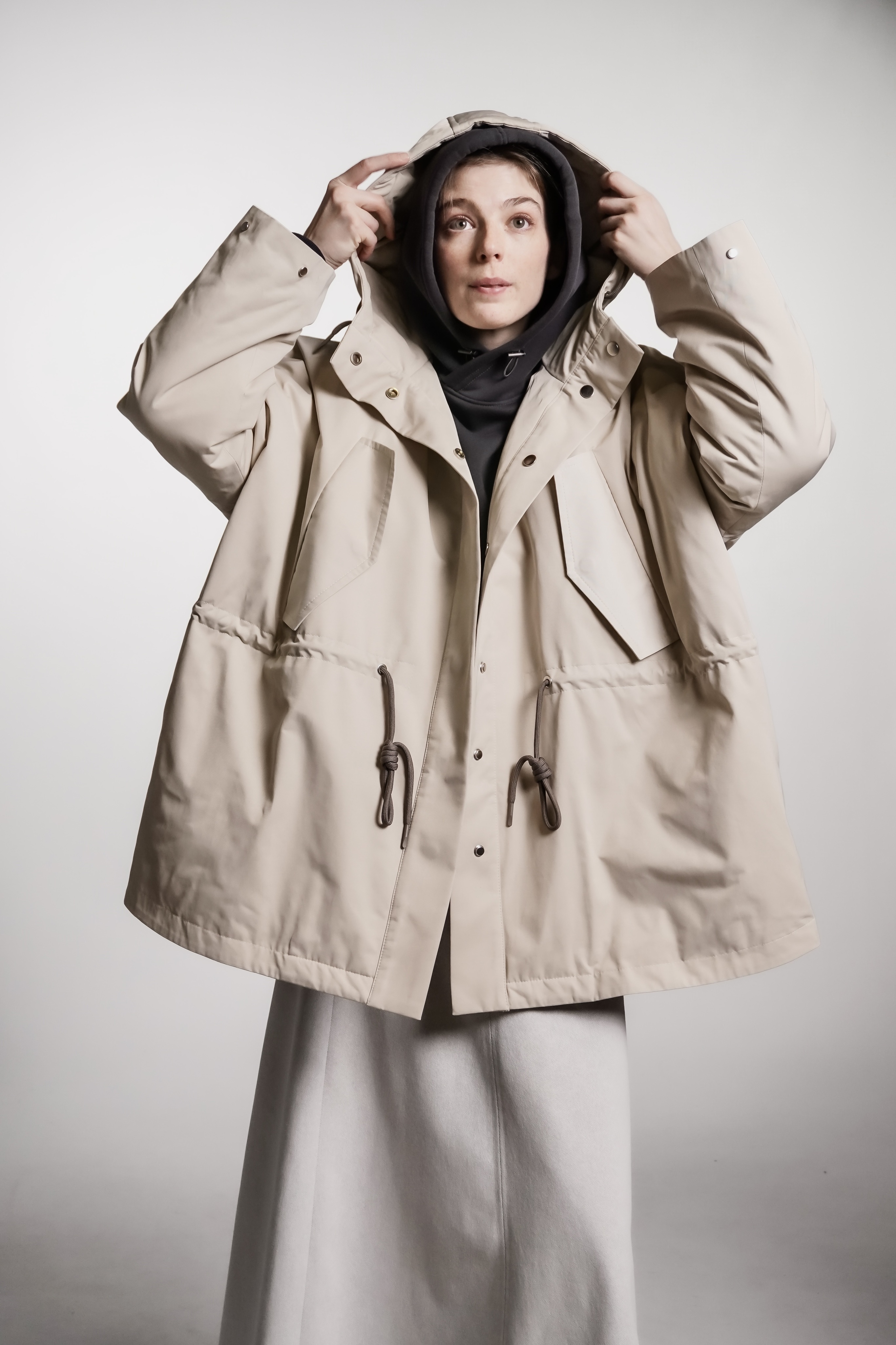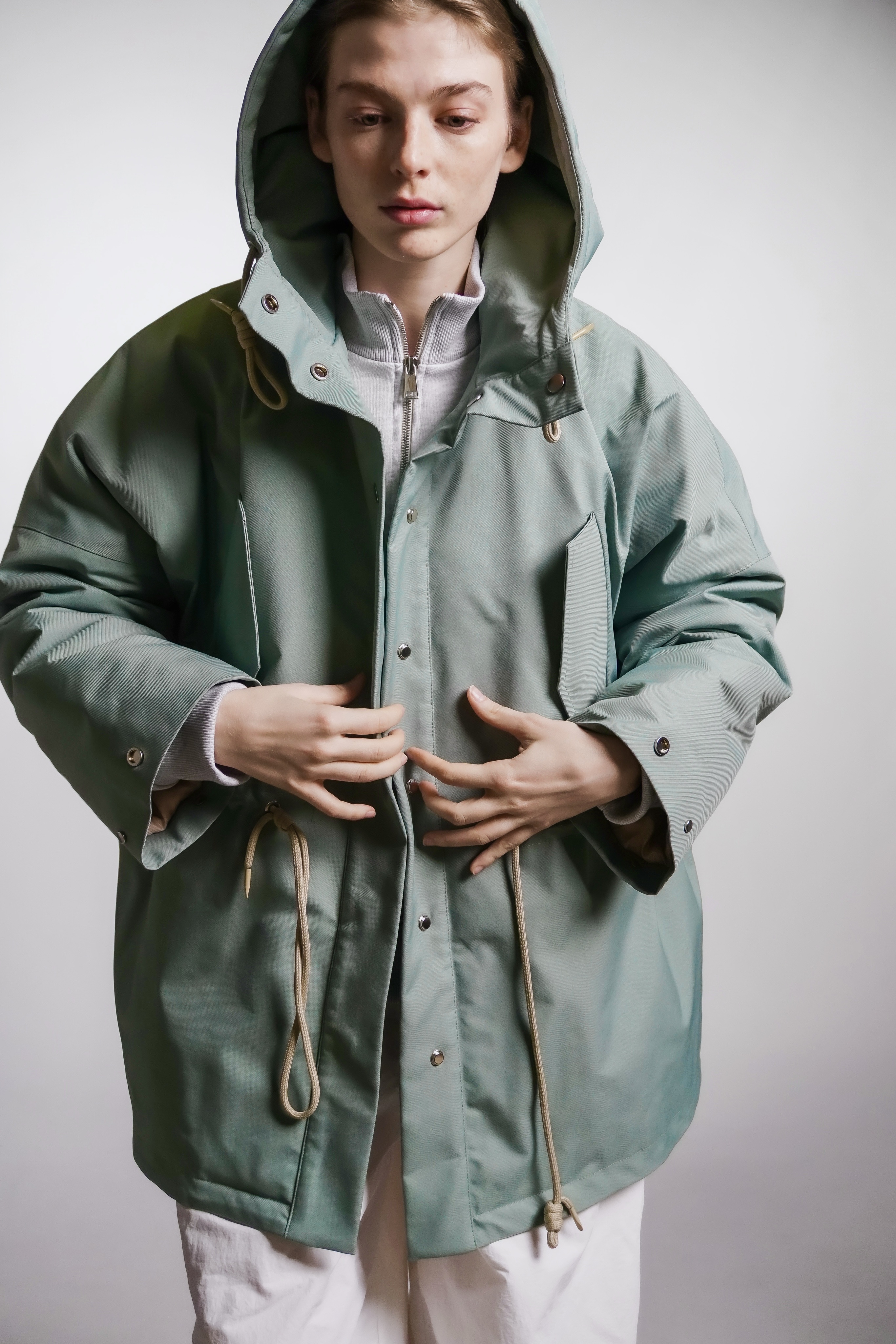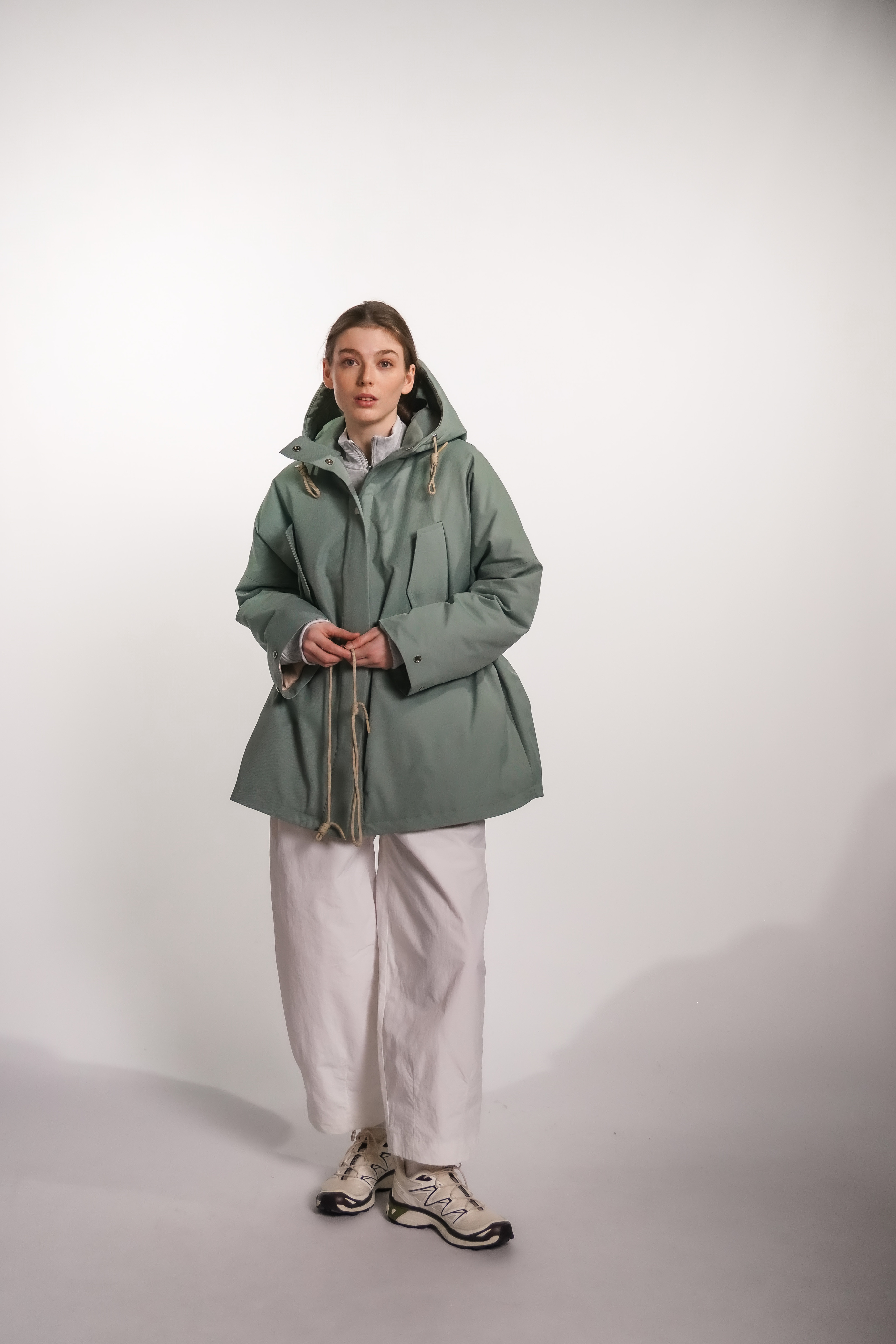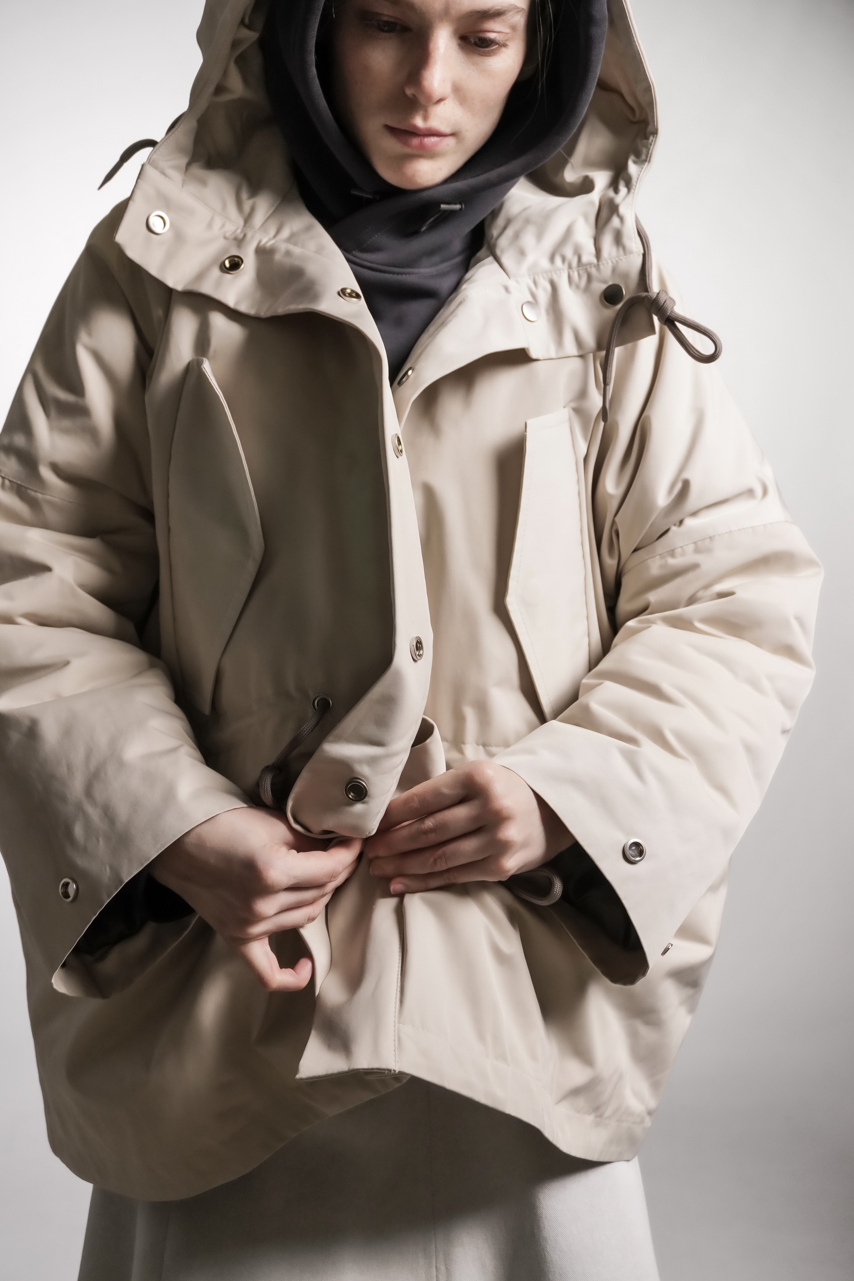 Парка из водоотталкивающей ткани с пропиткой. Изделие идет на подкладке и с утеплителем, кулисками можно регулировать посадку. Застегивается на кнопки. Есть капюшон и карманы.