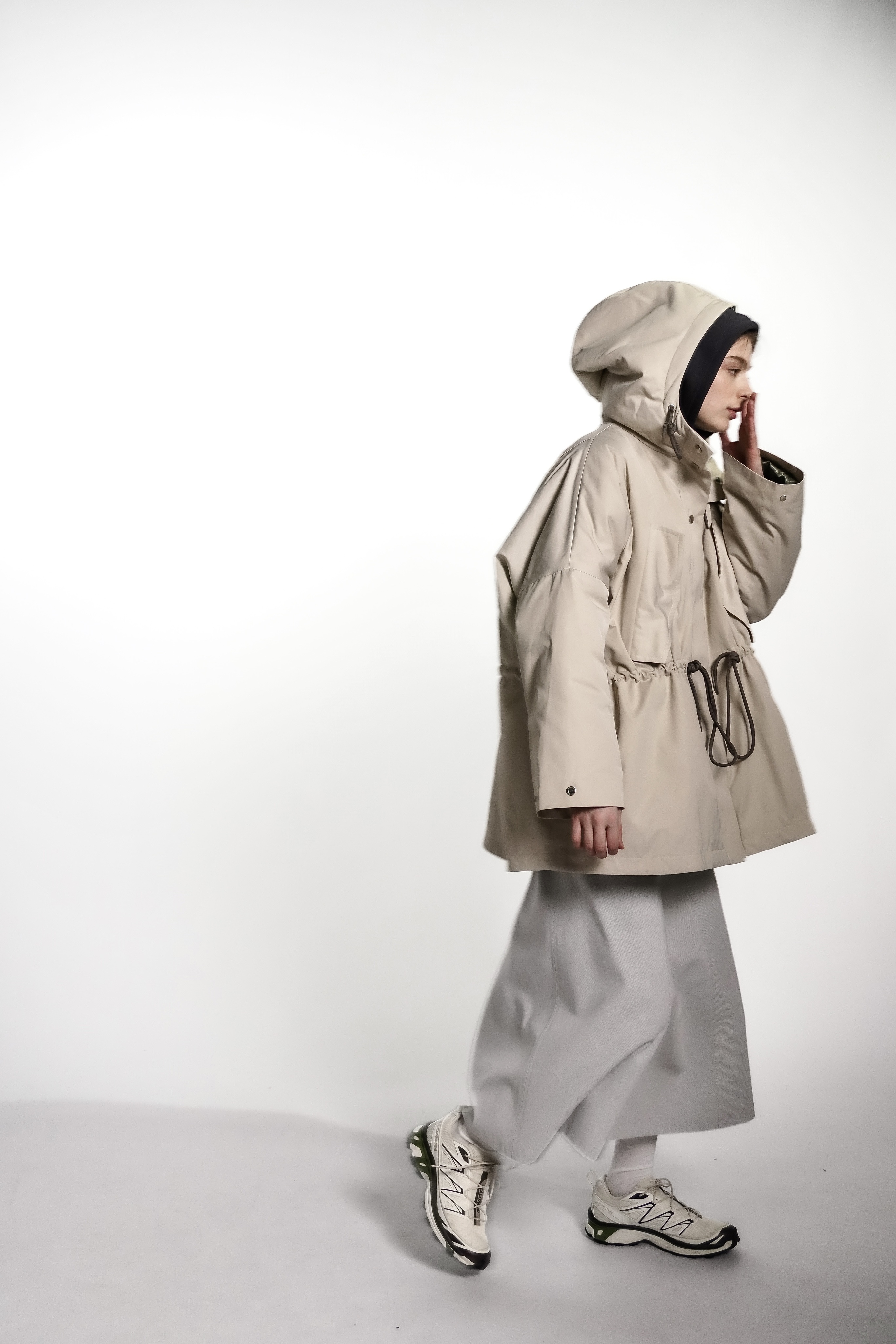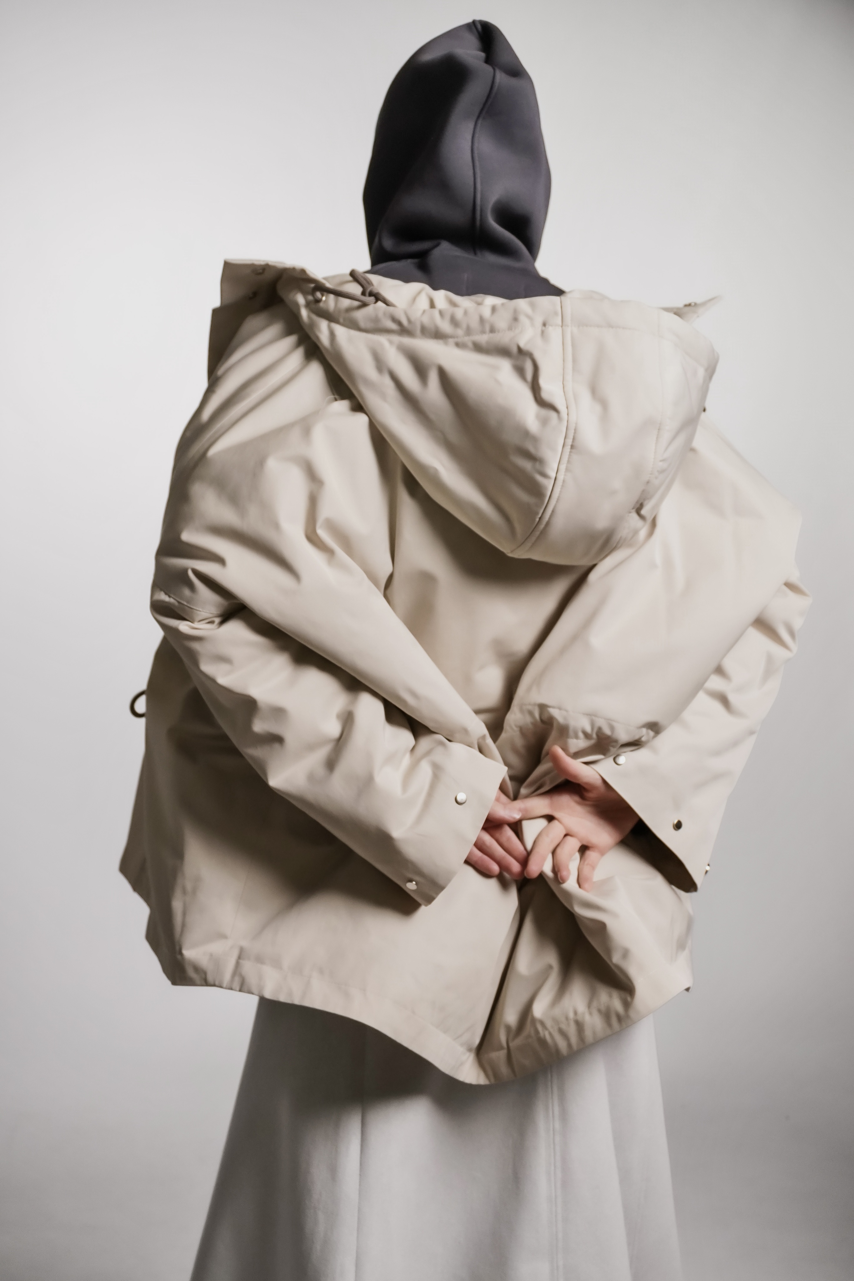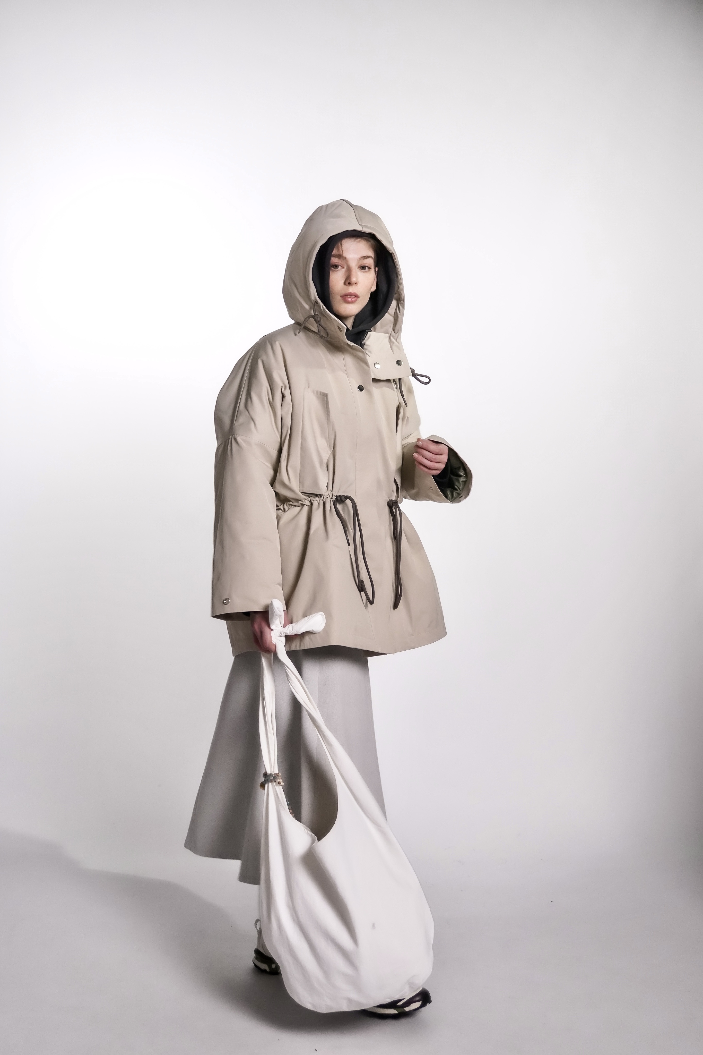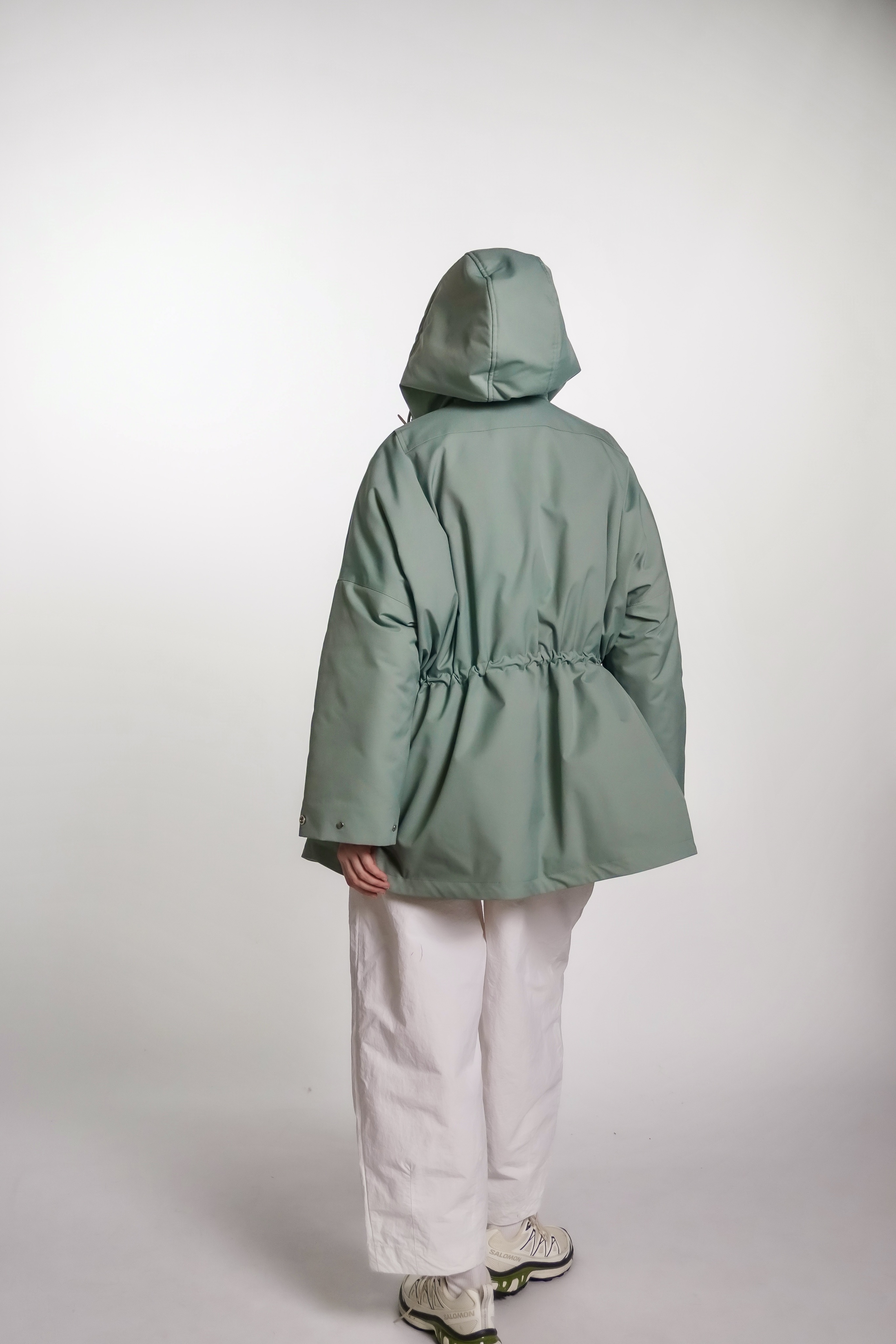 Парка из водоотталкивающей ткани с пропиткой. Изделие идет на подкладке и с утеплителем, кулисками можно регулировать посадку. Застегивается на кнопки. Есть капюшон и карманы.