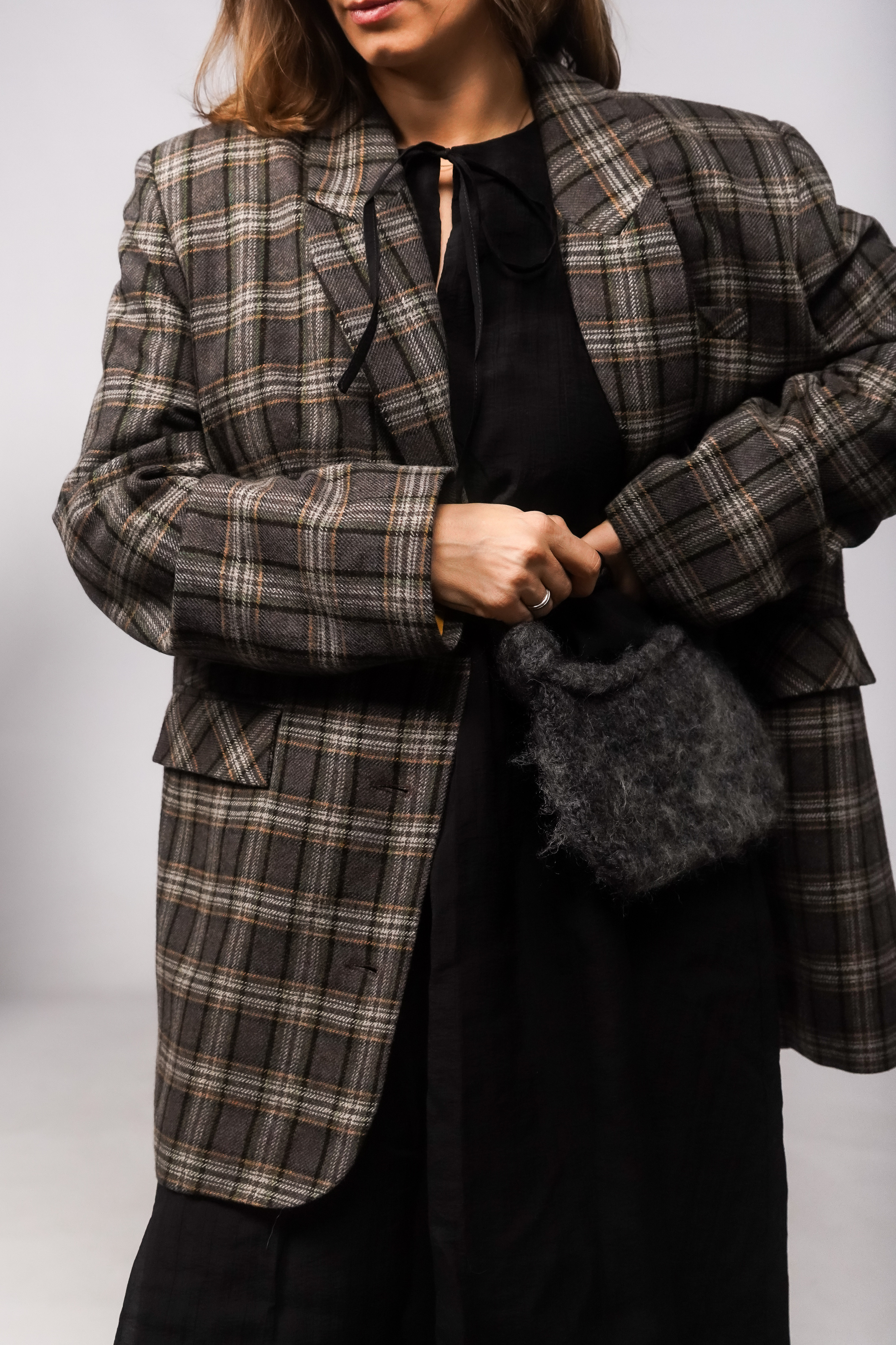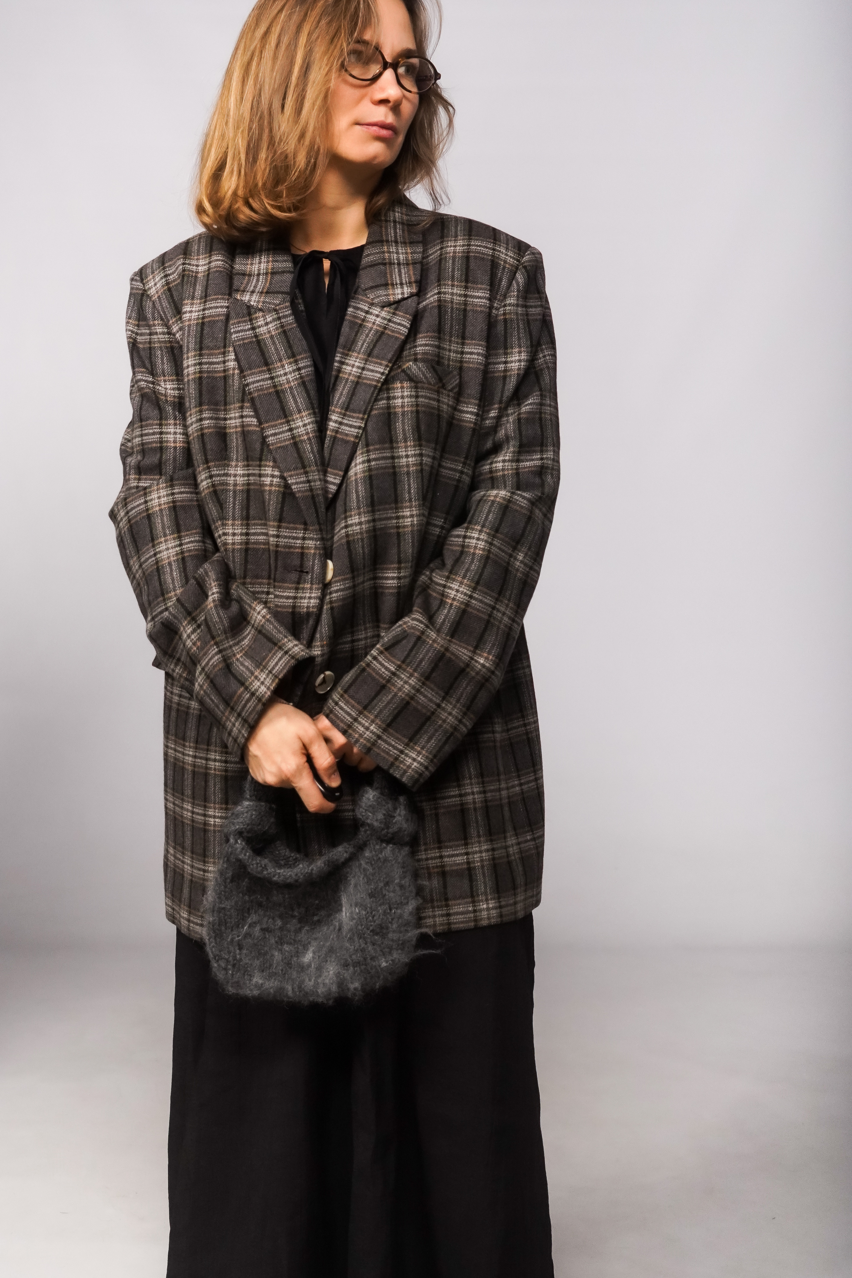 Пиджак однобортный свободного кроя из итальянской смесовой шерсти с контрастной подкладкой. Есть карманы.