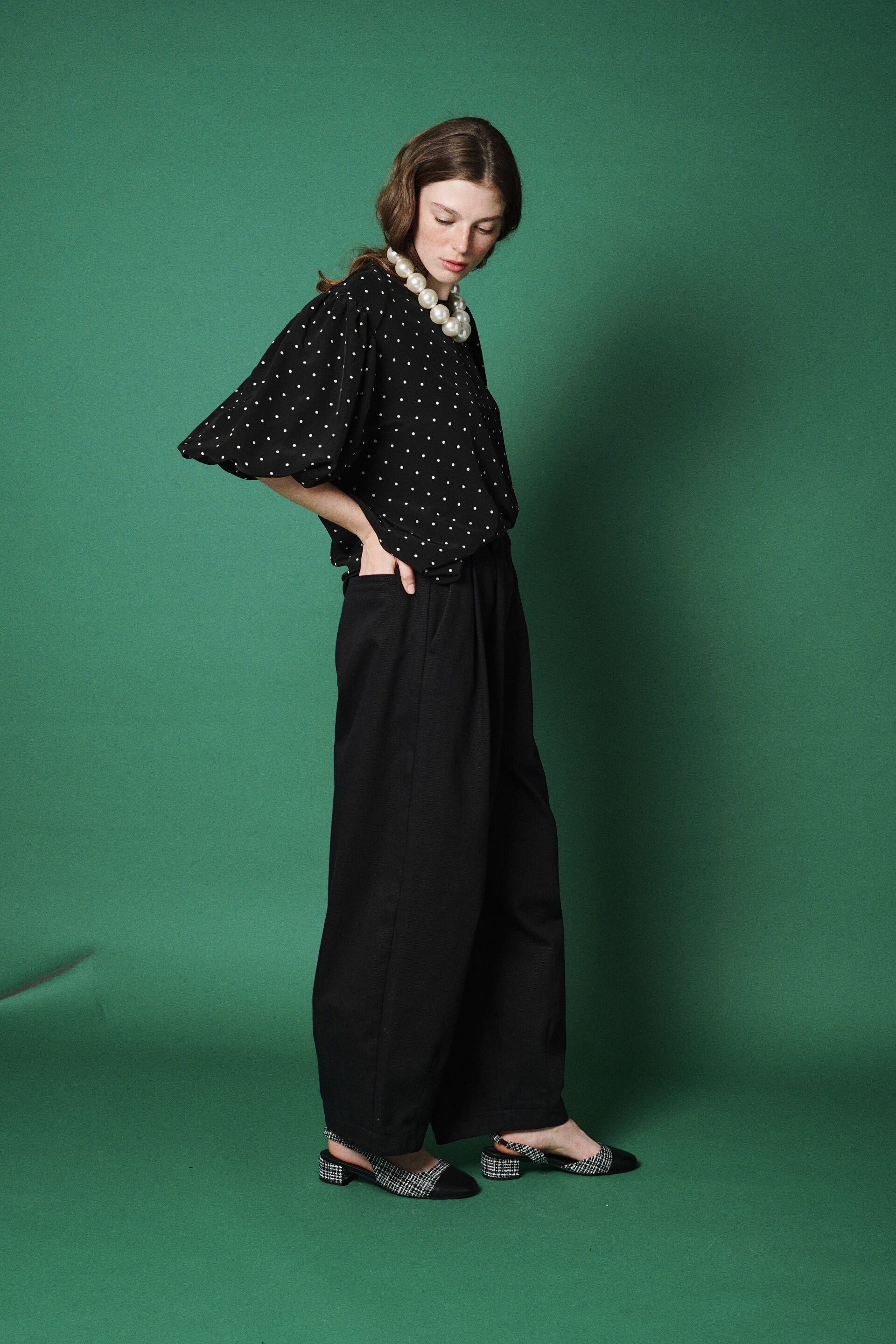 Брюки-бананы из плотной джинсы, есть карманы. Пояс на резинке.