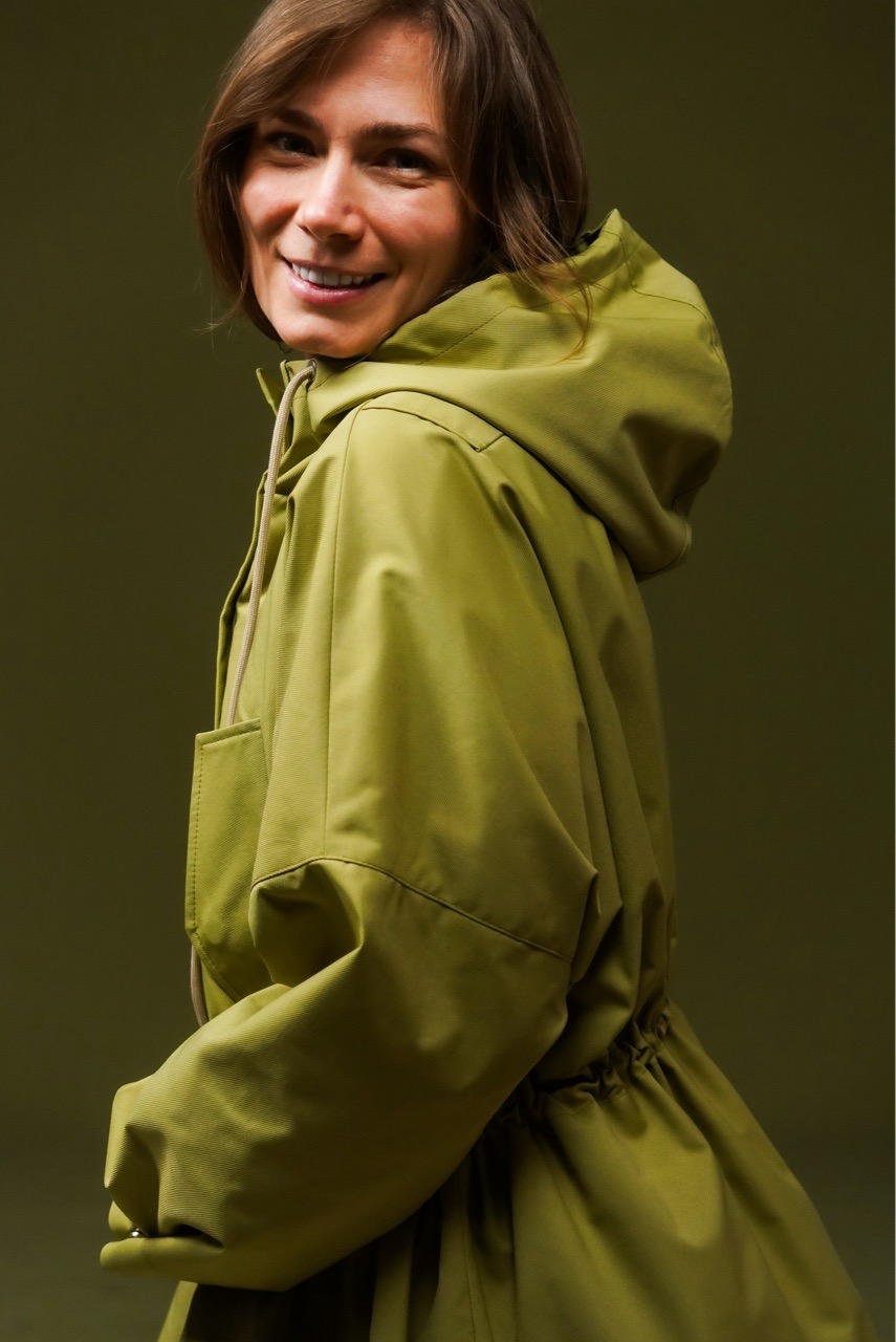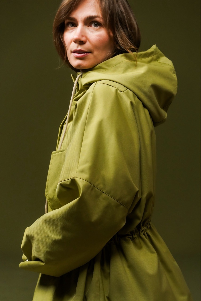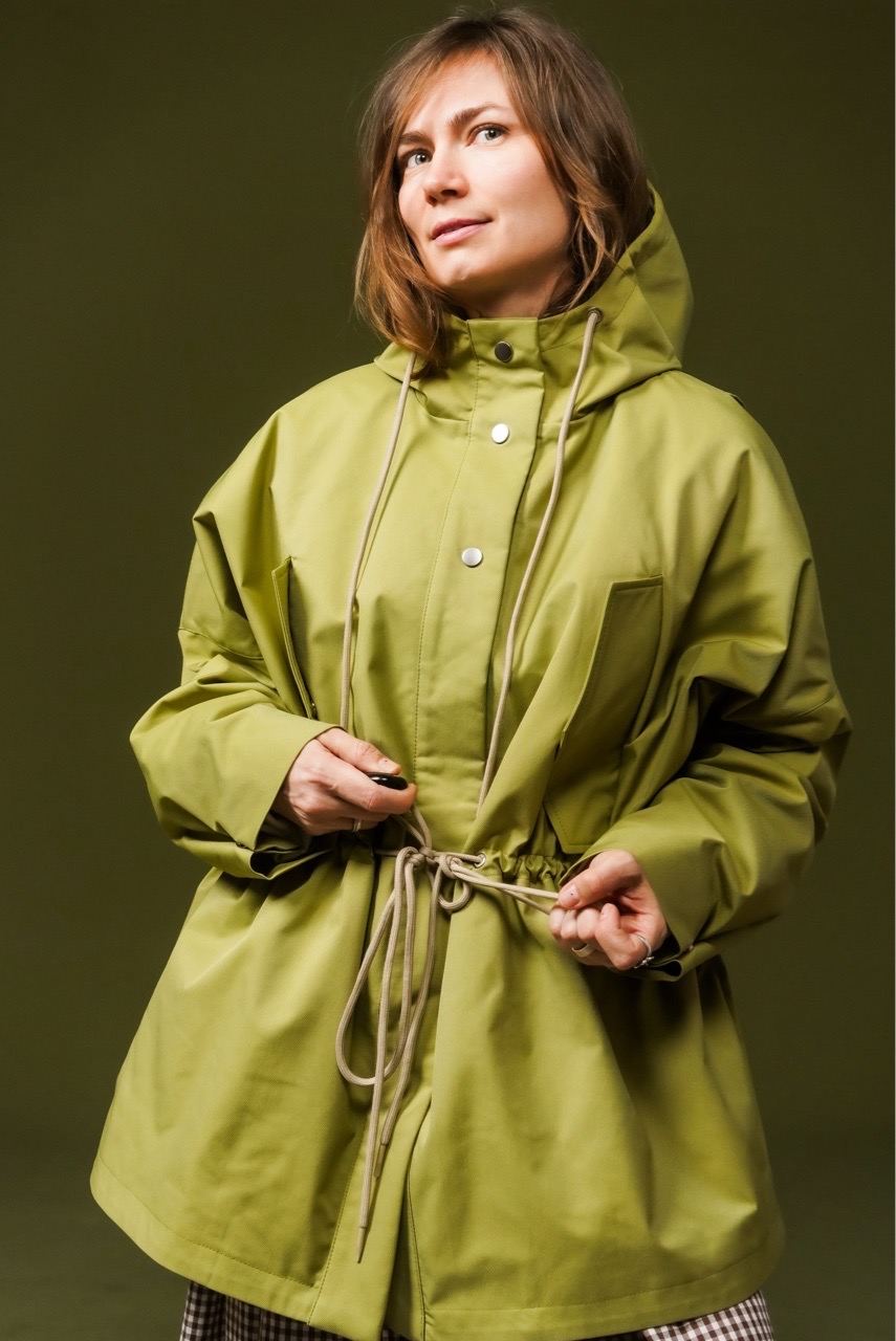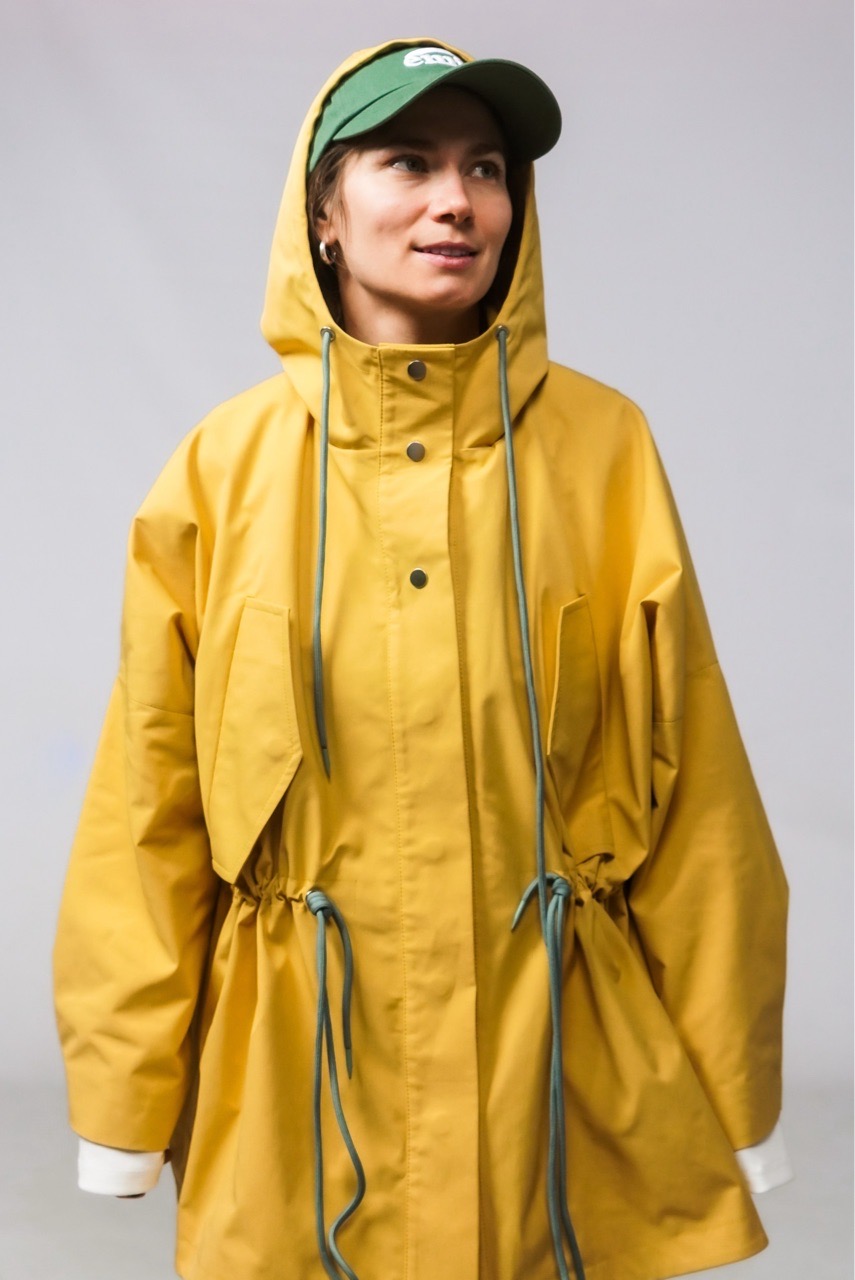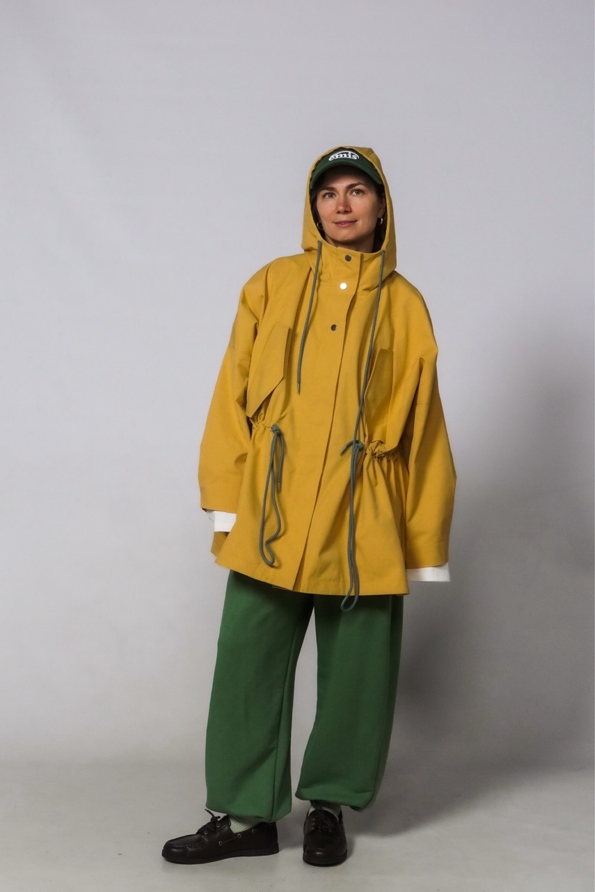 Парка из водоотталкивающей ткани с пропиткой. Изделие идет на подкладке, кулисками можно регулировать посадку. Застегивается на кнопки. Есть капюшон и карманы.
