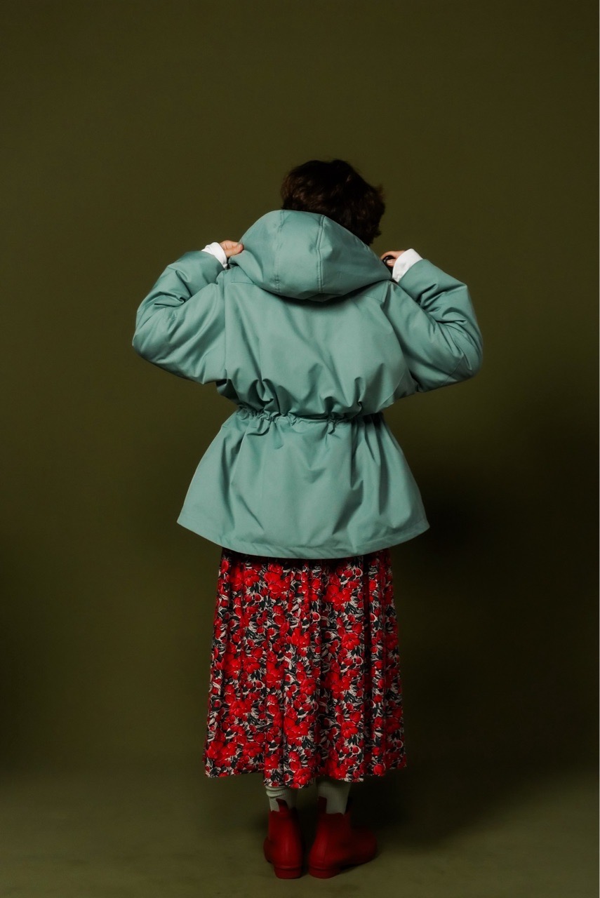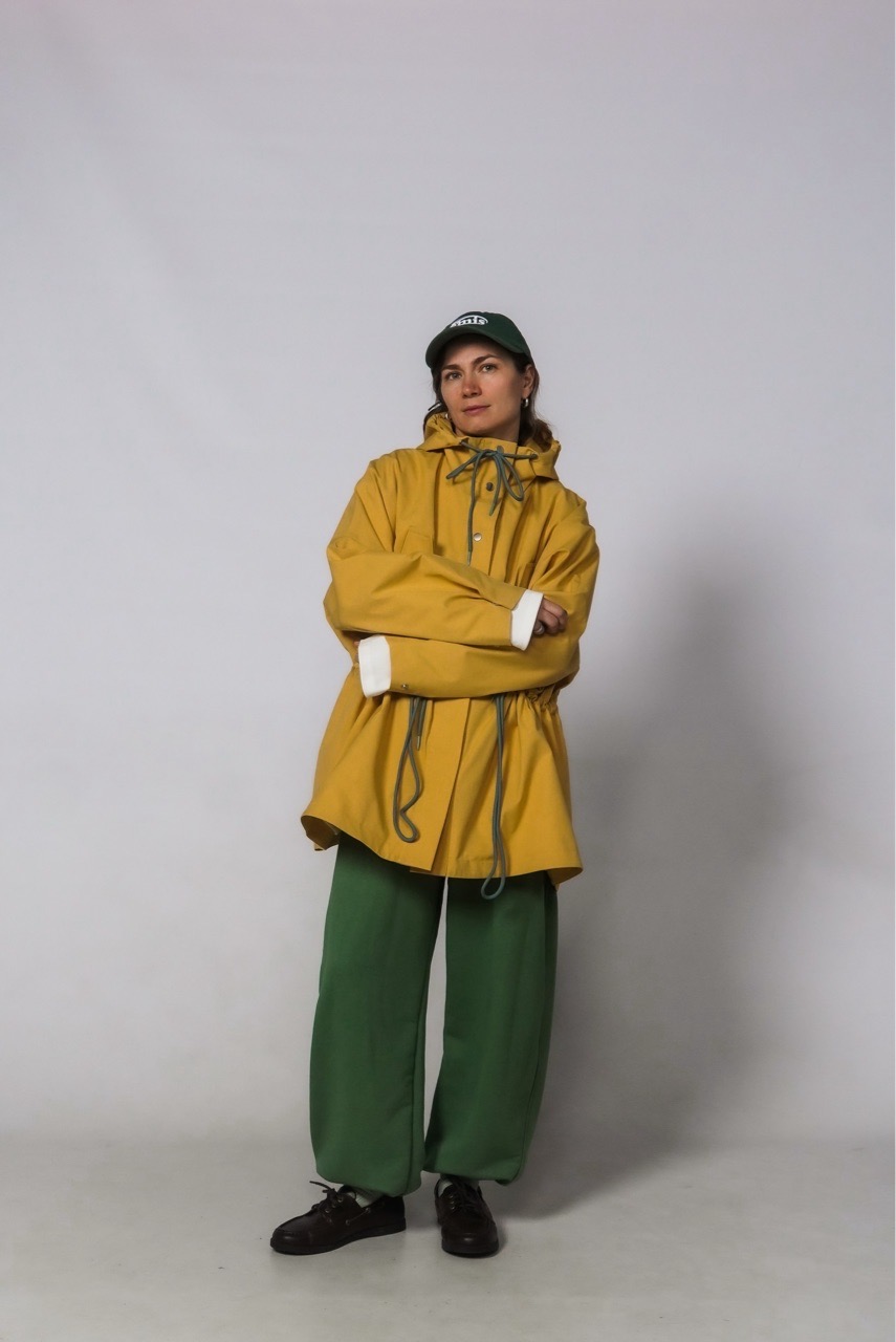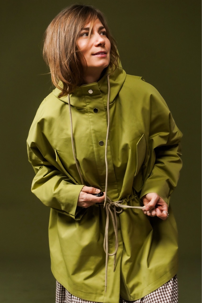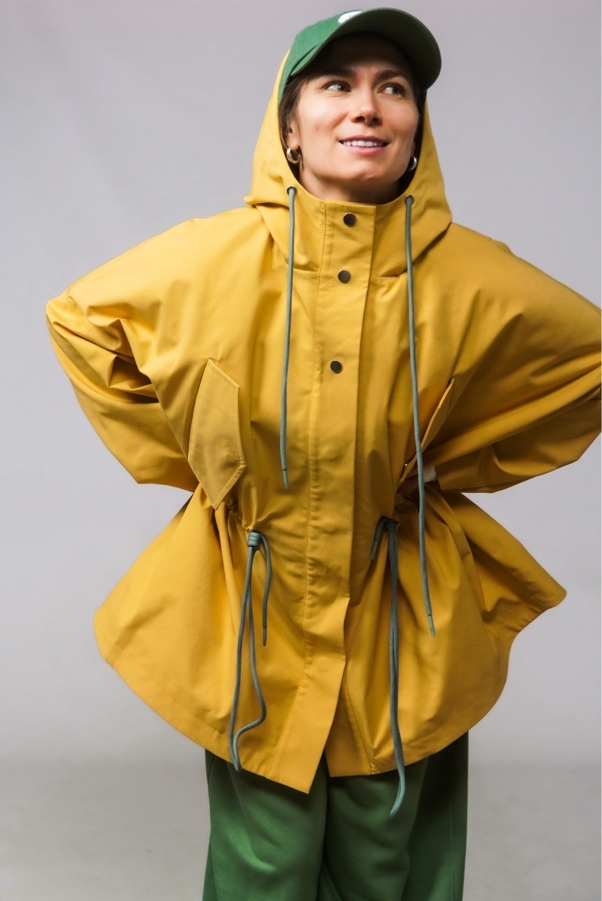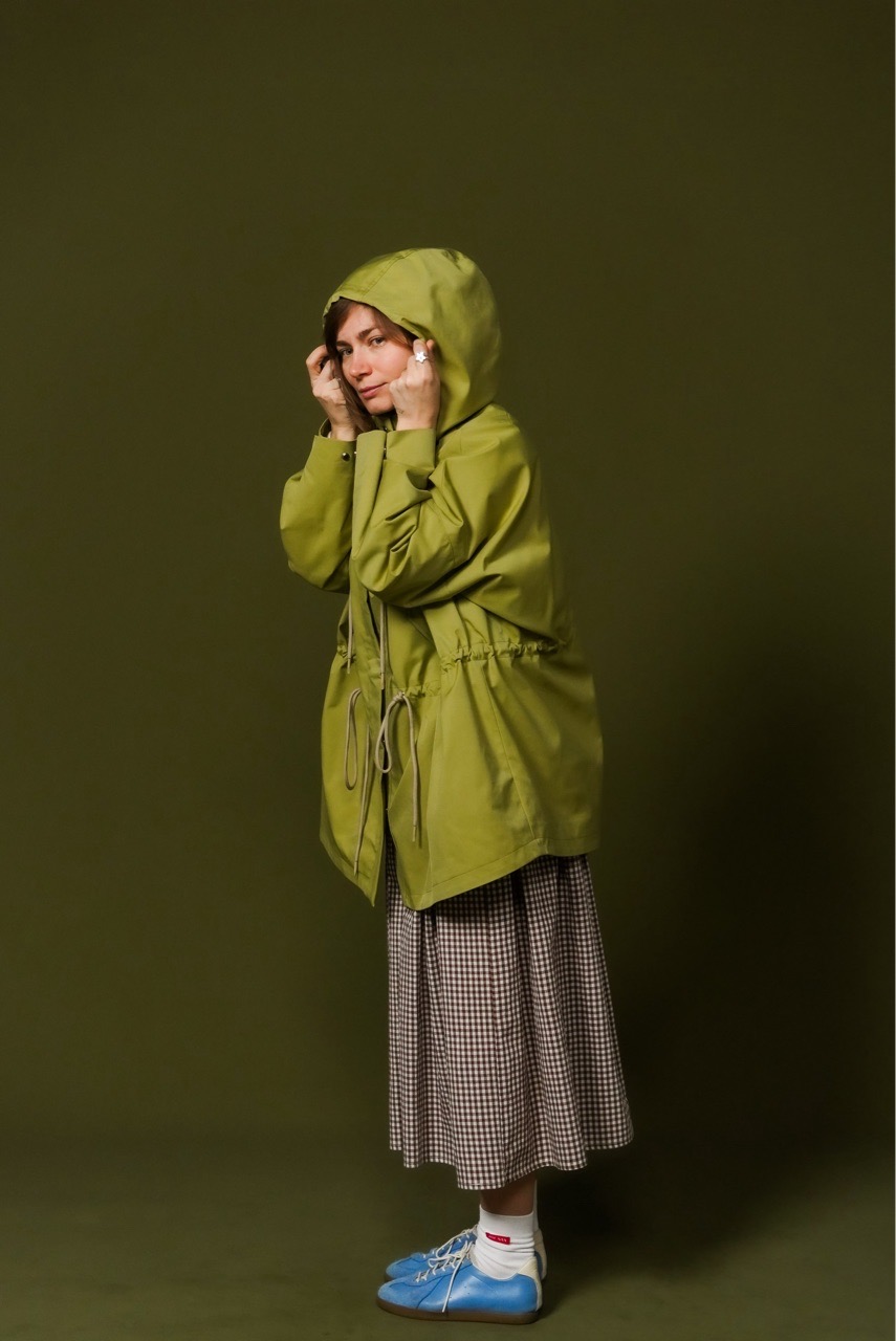 Парка из водоотталкивающей ткани с пропиткой. Изделие идет на подкладке, кулисками можно регулировать посадку. Застегивается на кнопки. Есть капюшон и карманы.