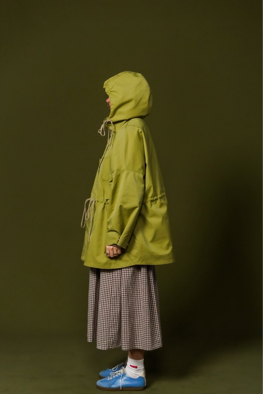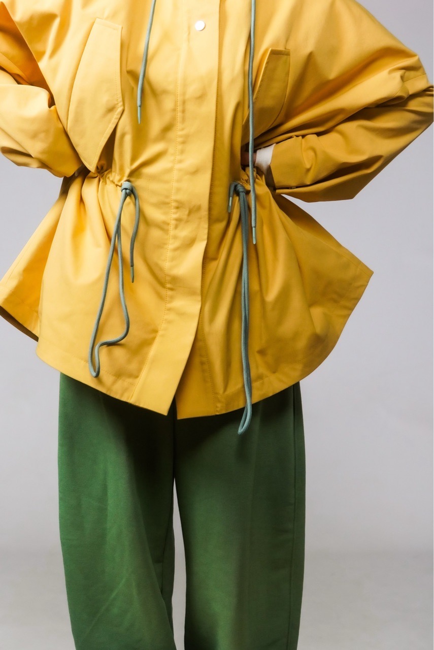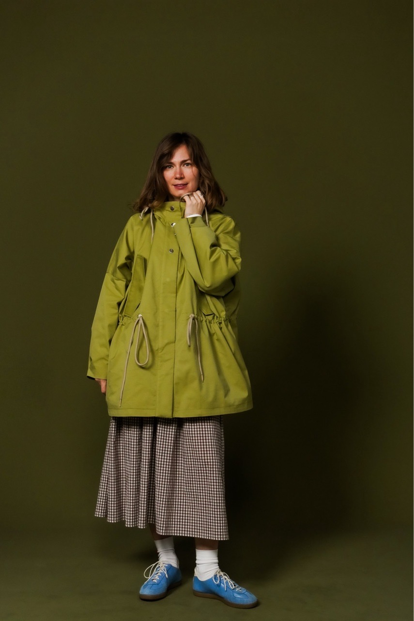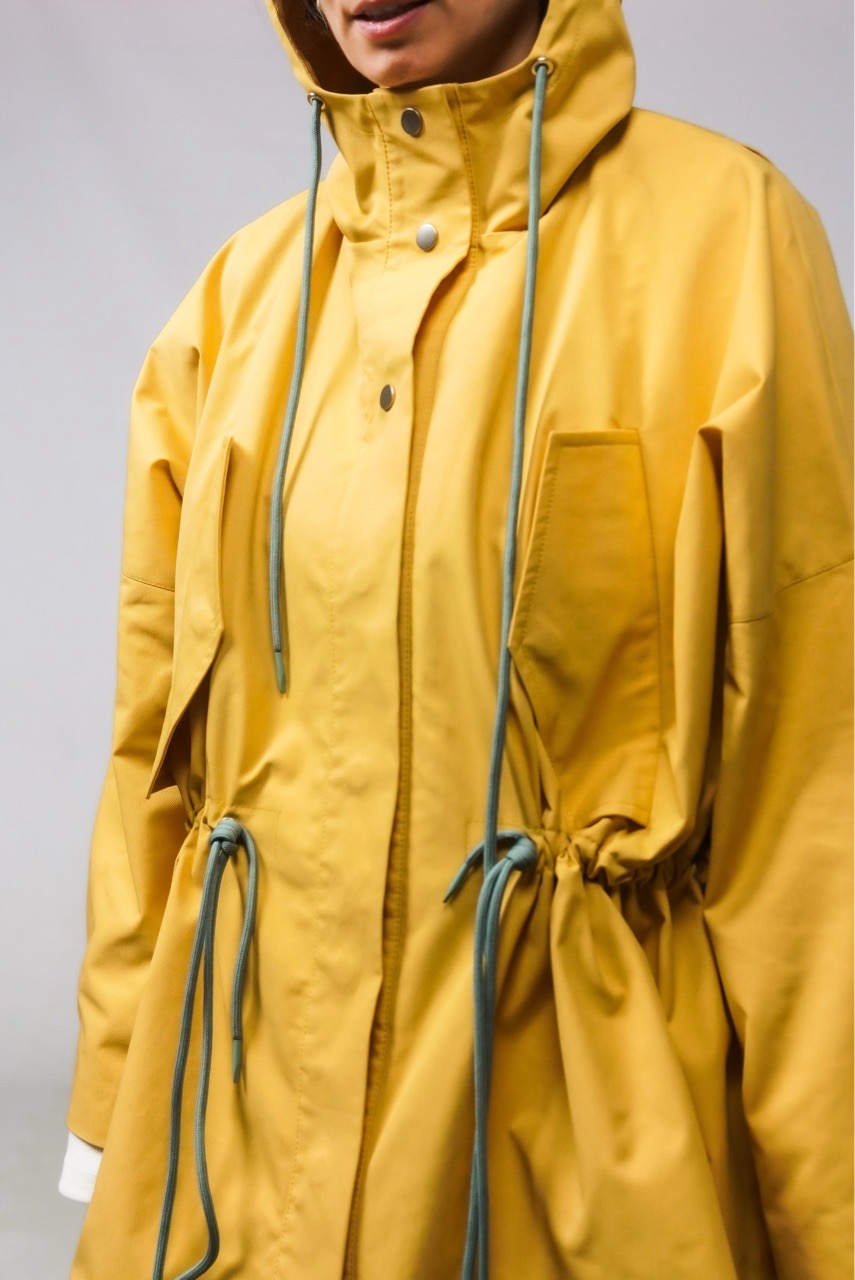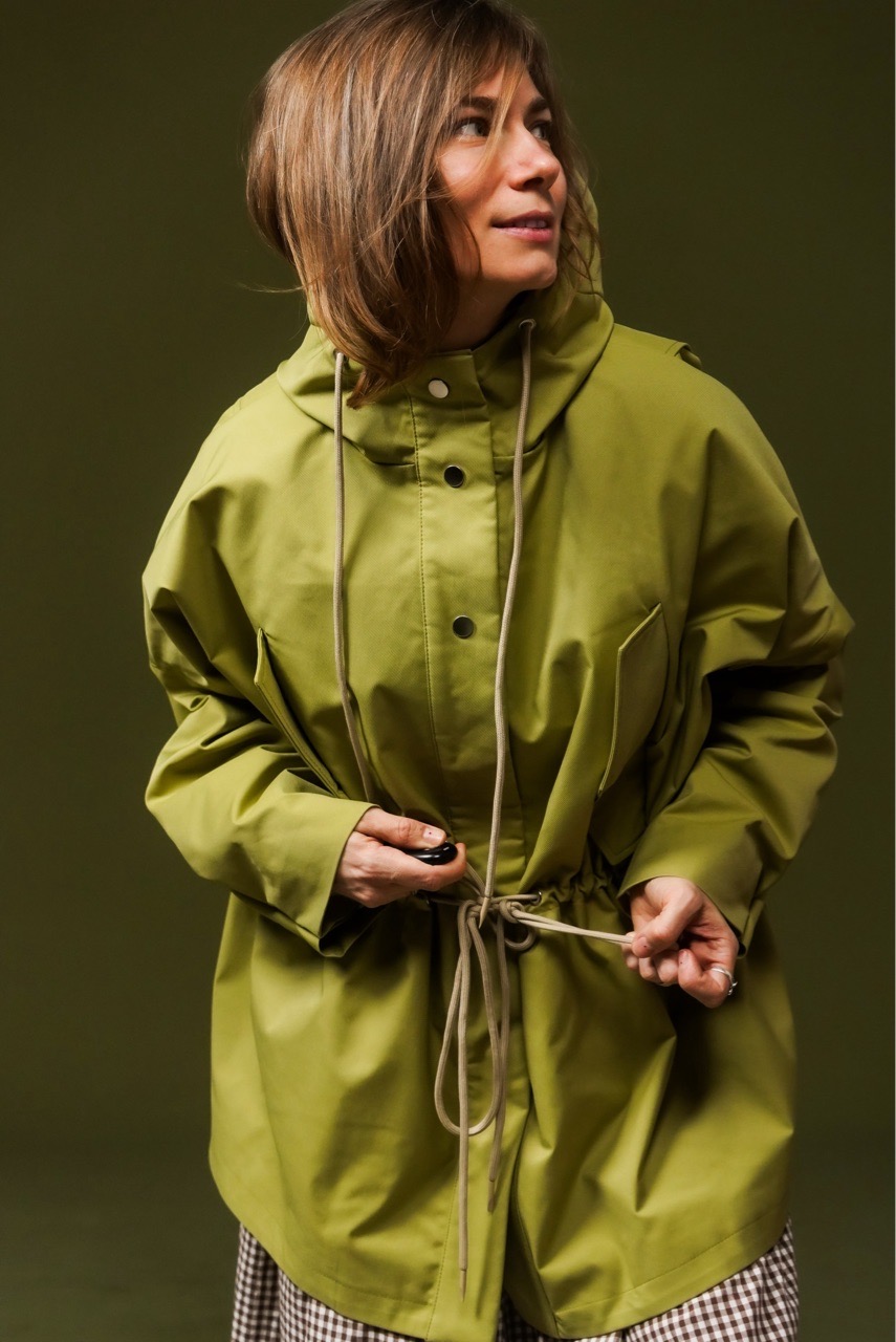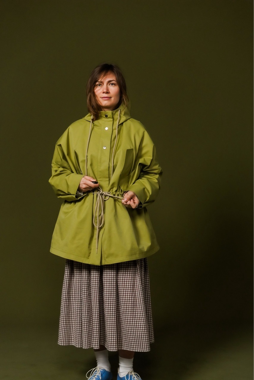 Парка из водоотталкивающей ткани с пропиткой. Изделие идет на подкладке, кулисками можно регулировать посадку. Застегивается на кнопки. Есть капюшон и карманы.