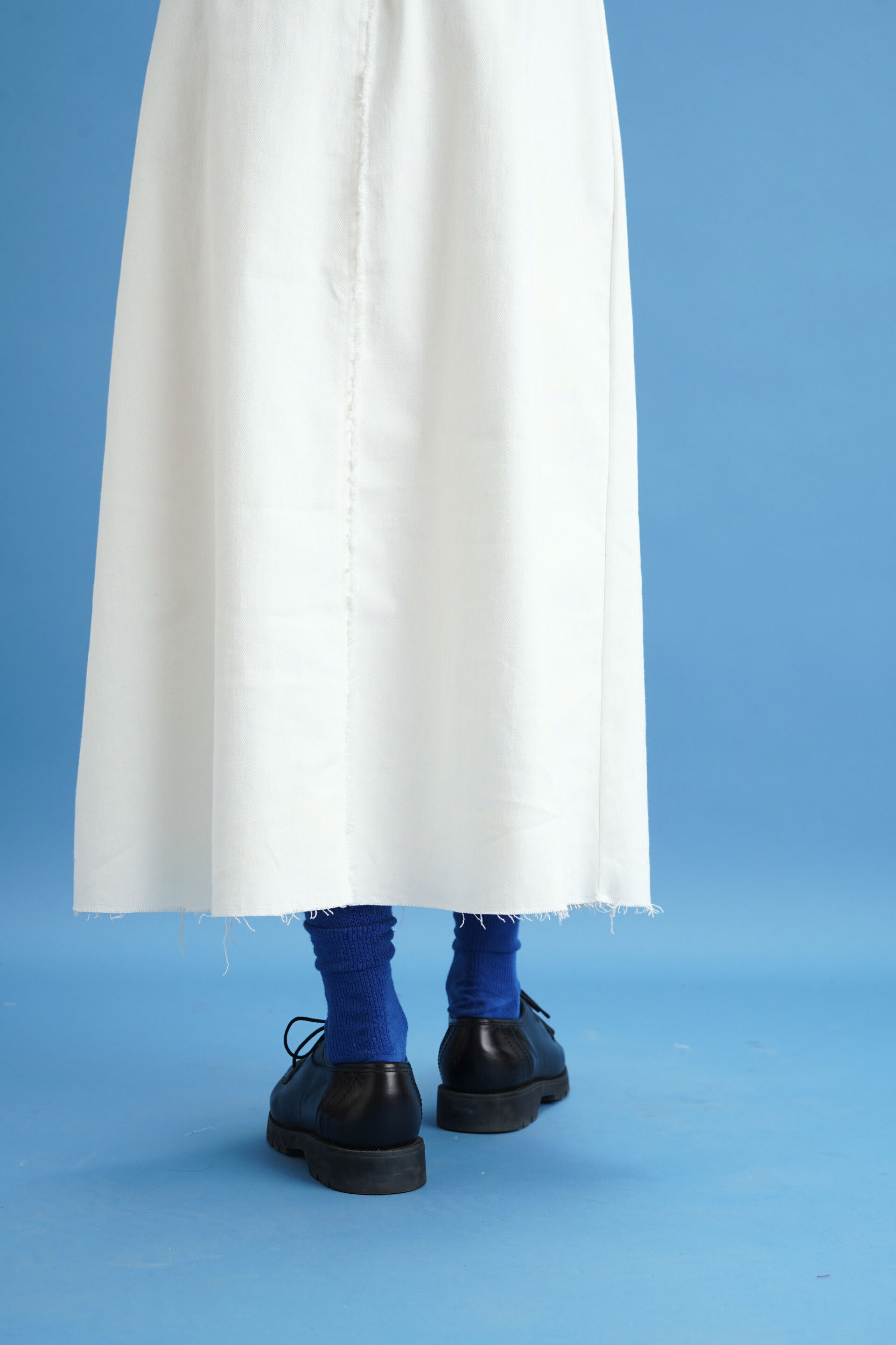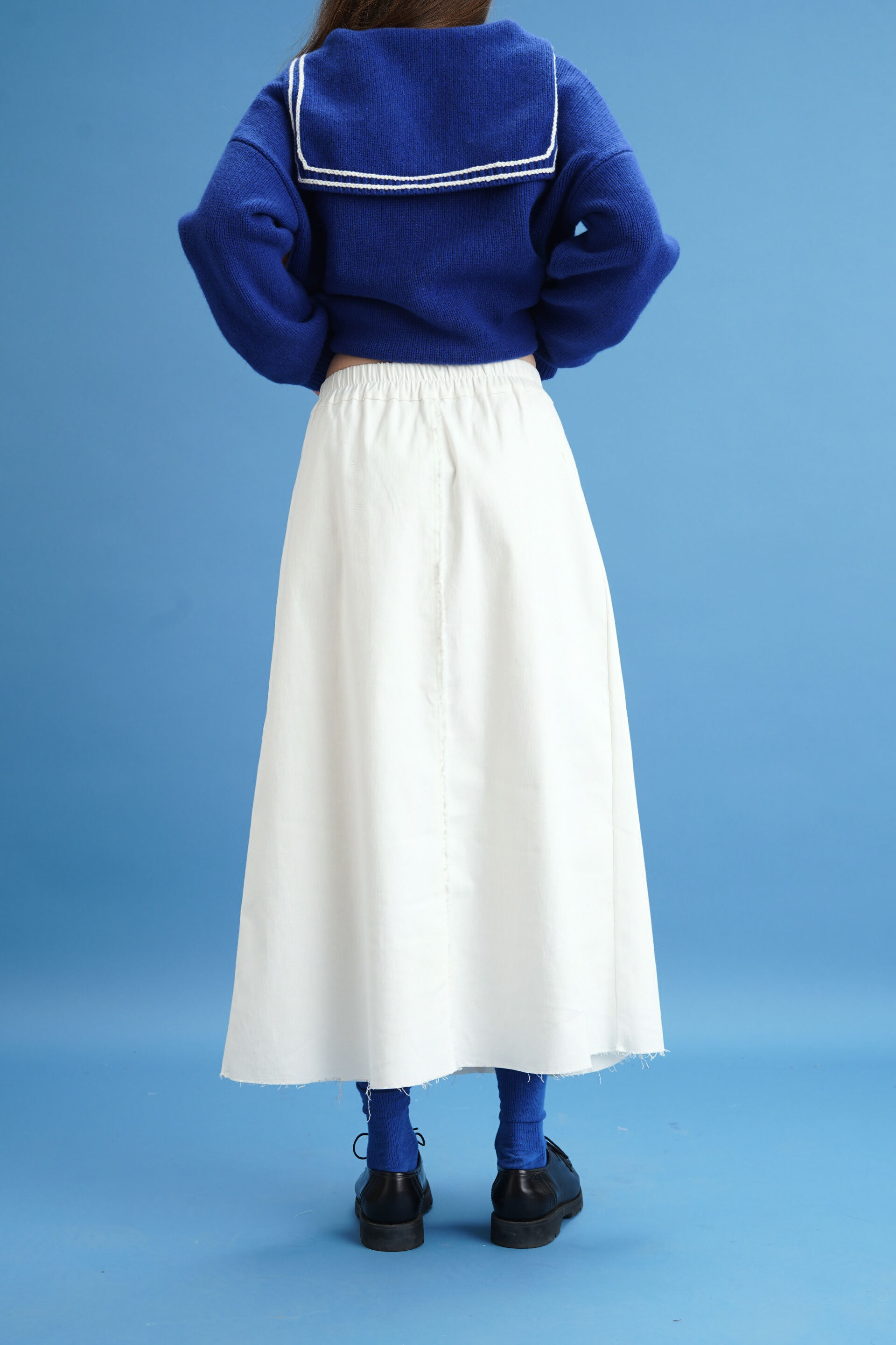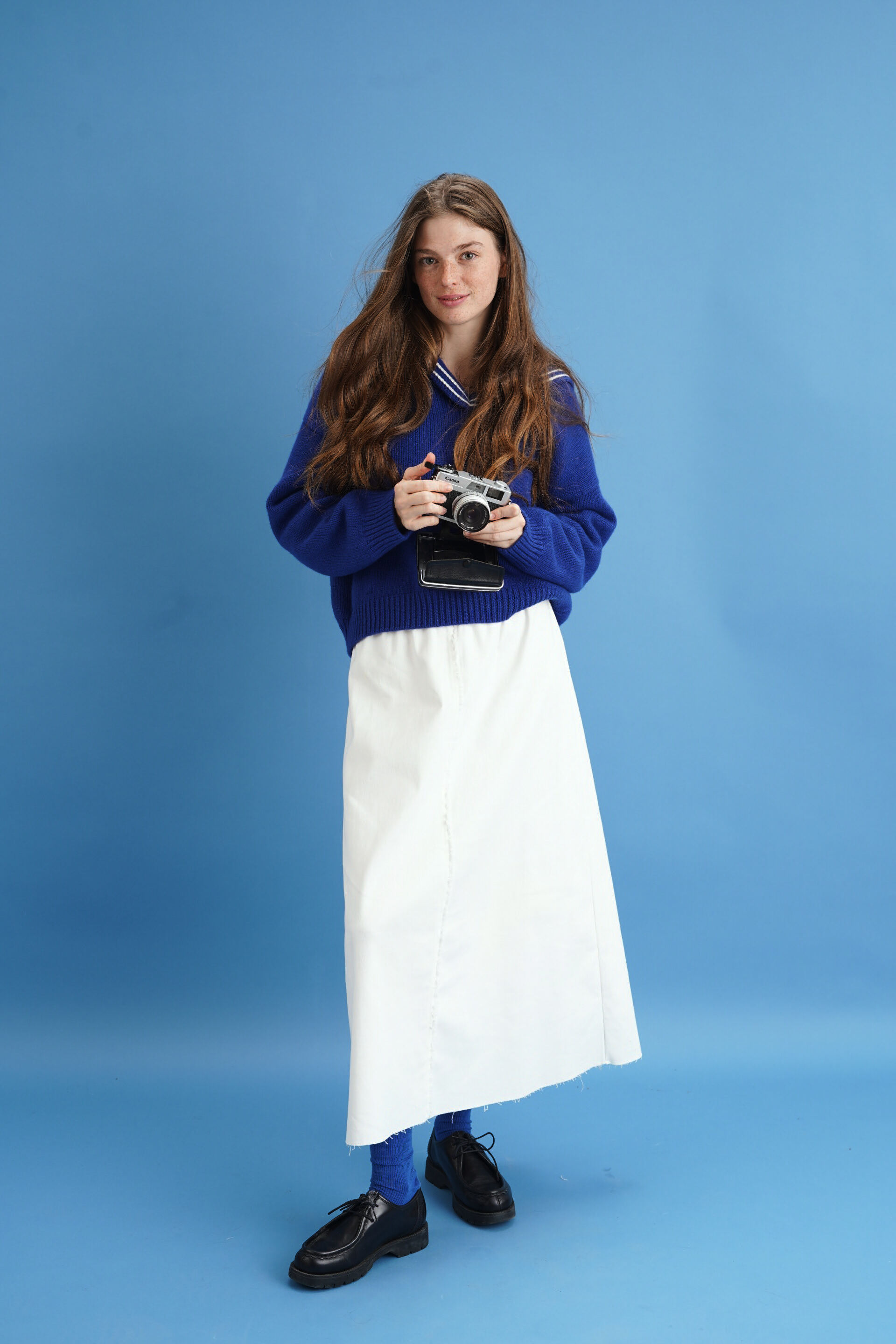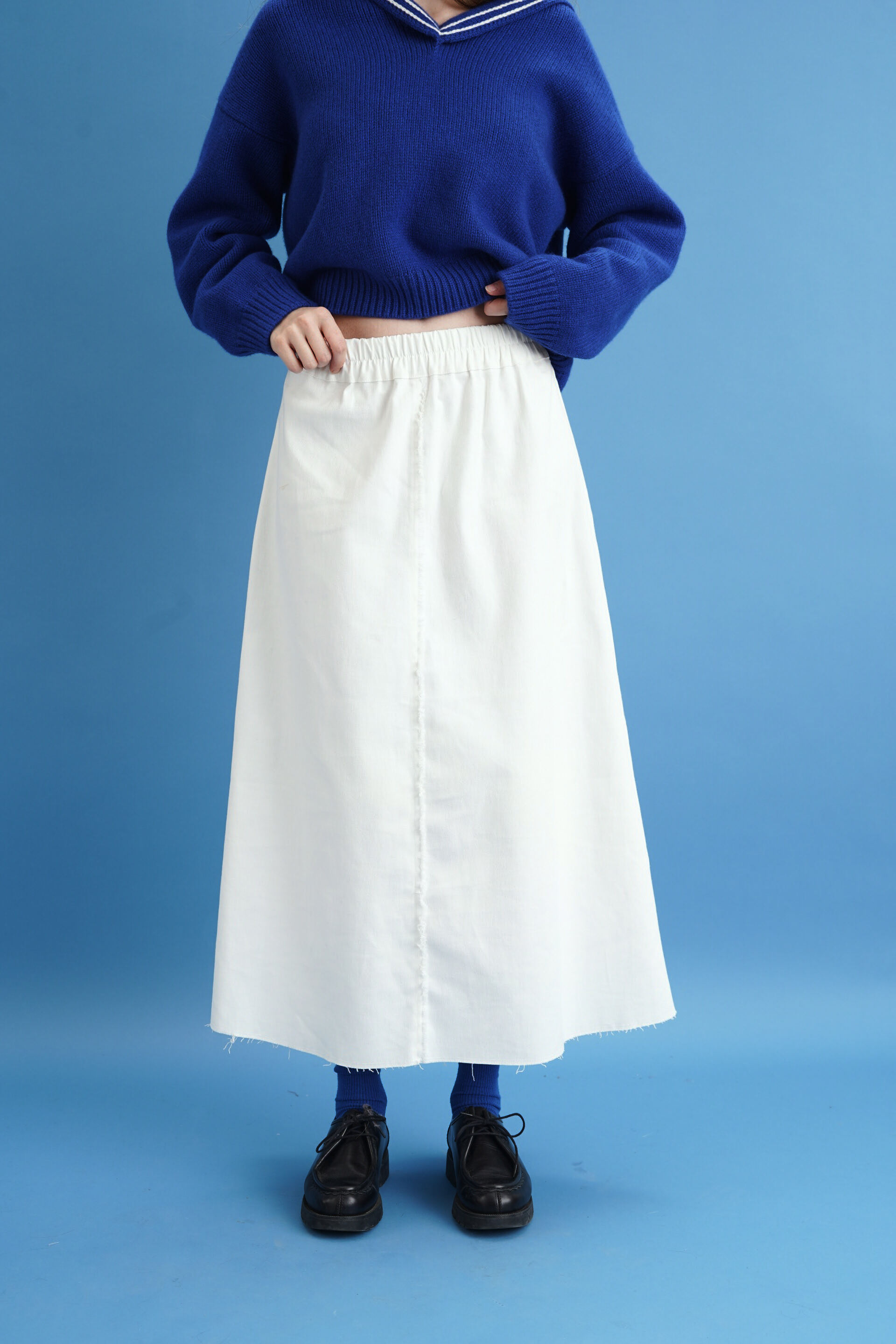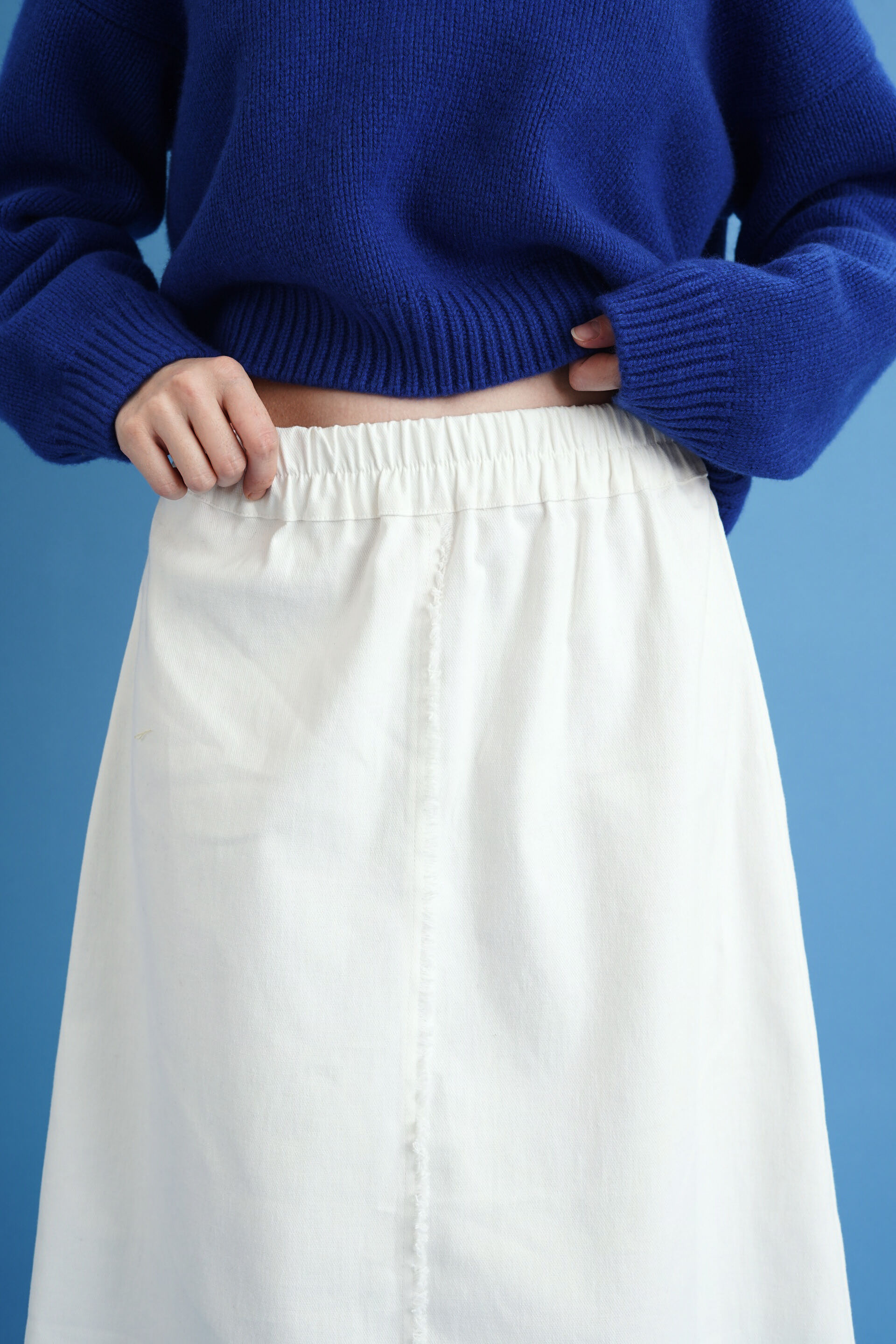 Юбка-трапеция с необработанным краем и декоративным швом по центру из плотной джинсы, ткань держит форму. Пояс резинкой. Без карманов.