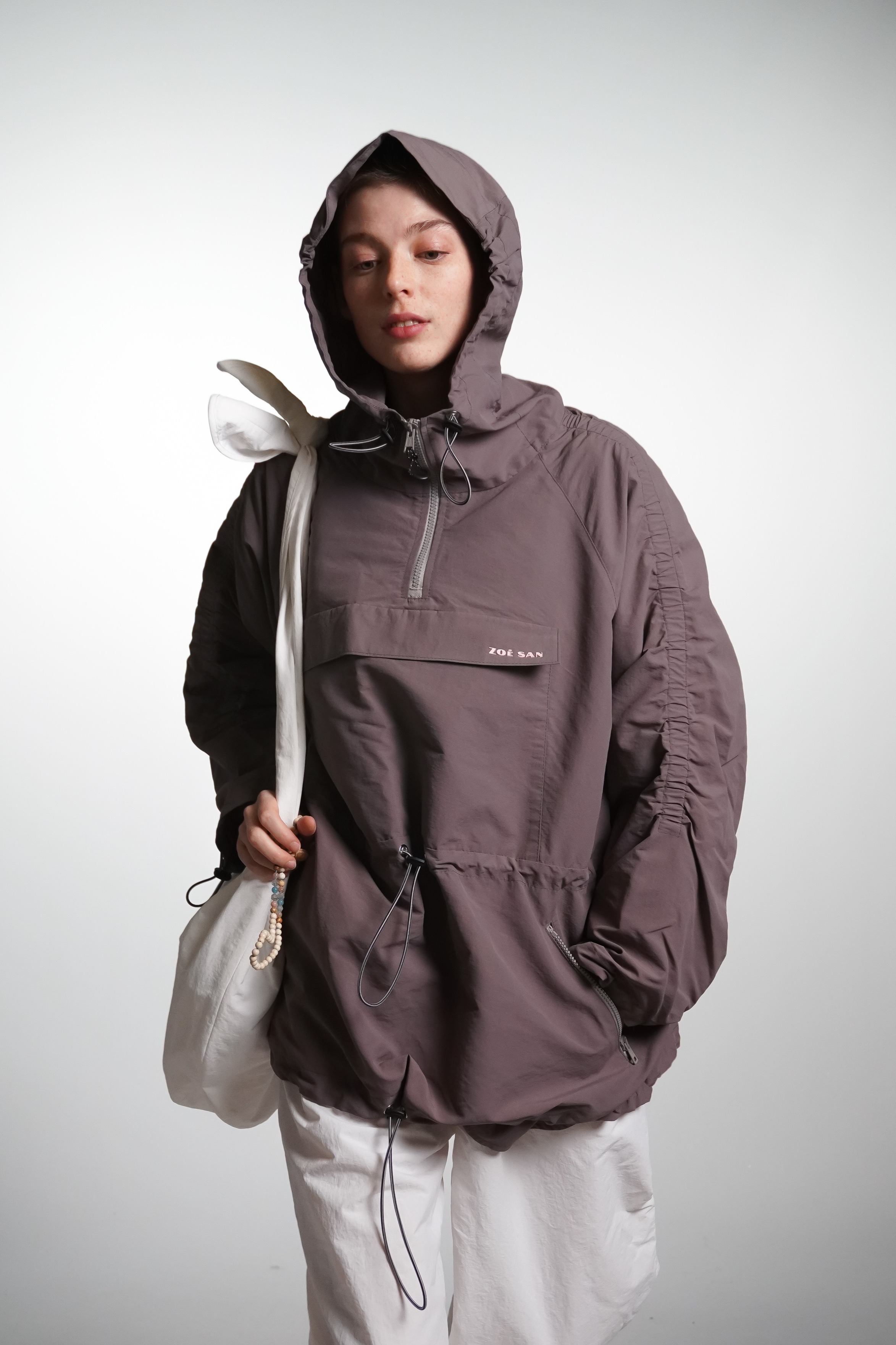 Анорак из водоотталкивающей ткани с капюшоном. Вместительный карман на груди и два кармана по бокам. Есть фиксатор на поясе, можно приталить. Также есть фиксаторы на рукавах и капюшоне, чтобы защититься от ветра в непогоду.
