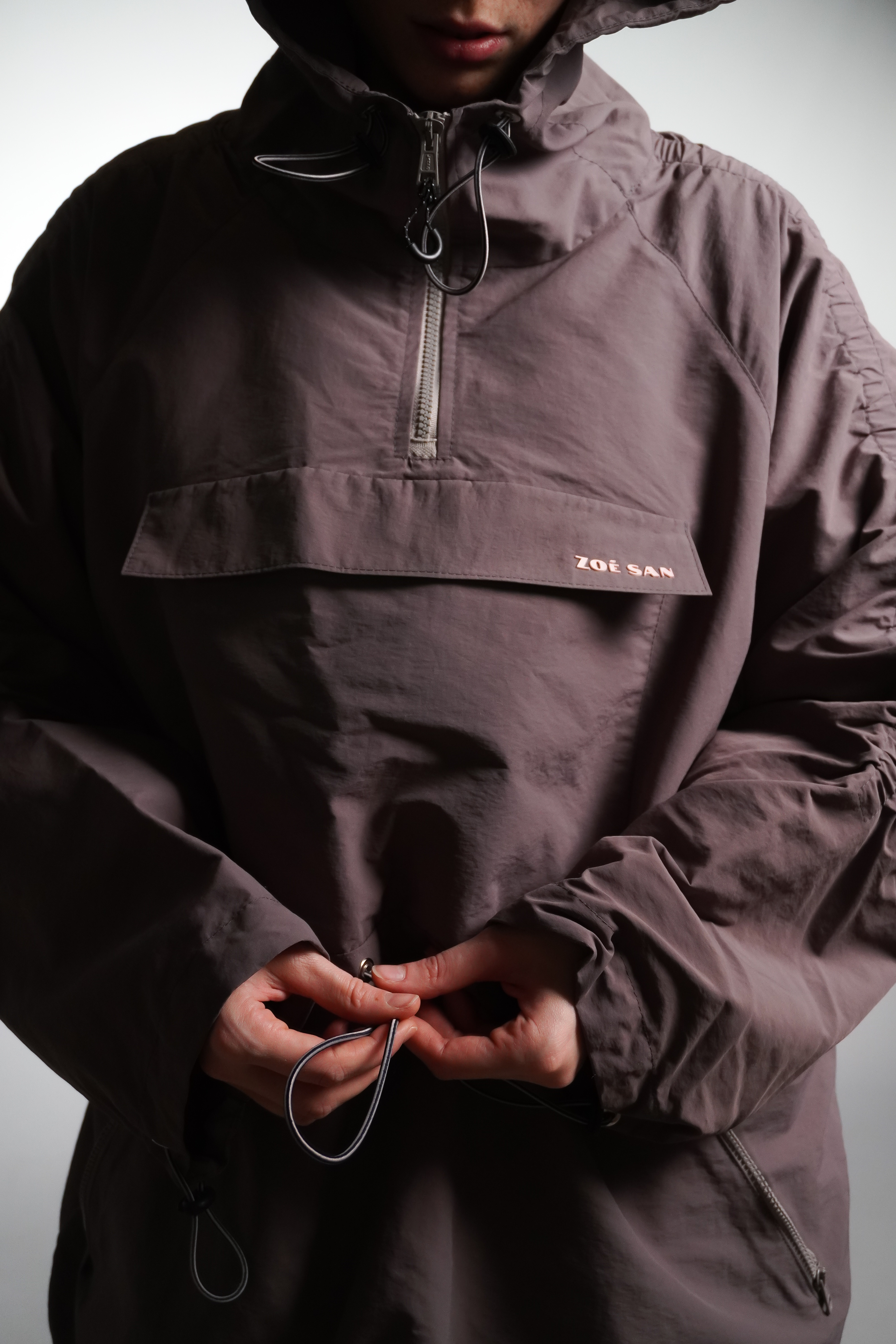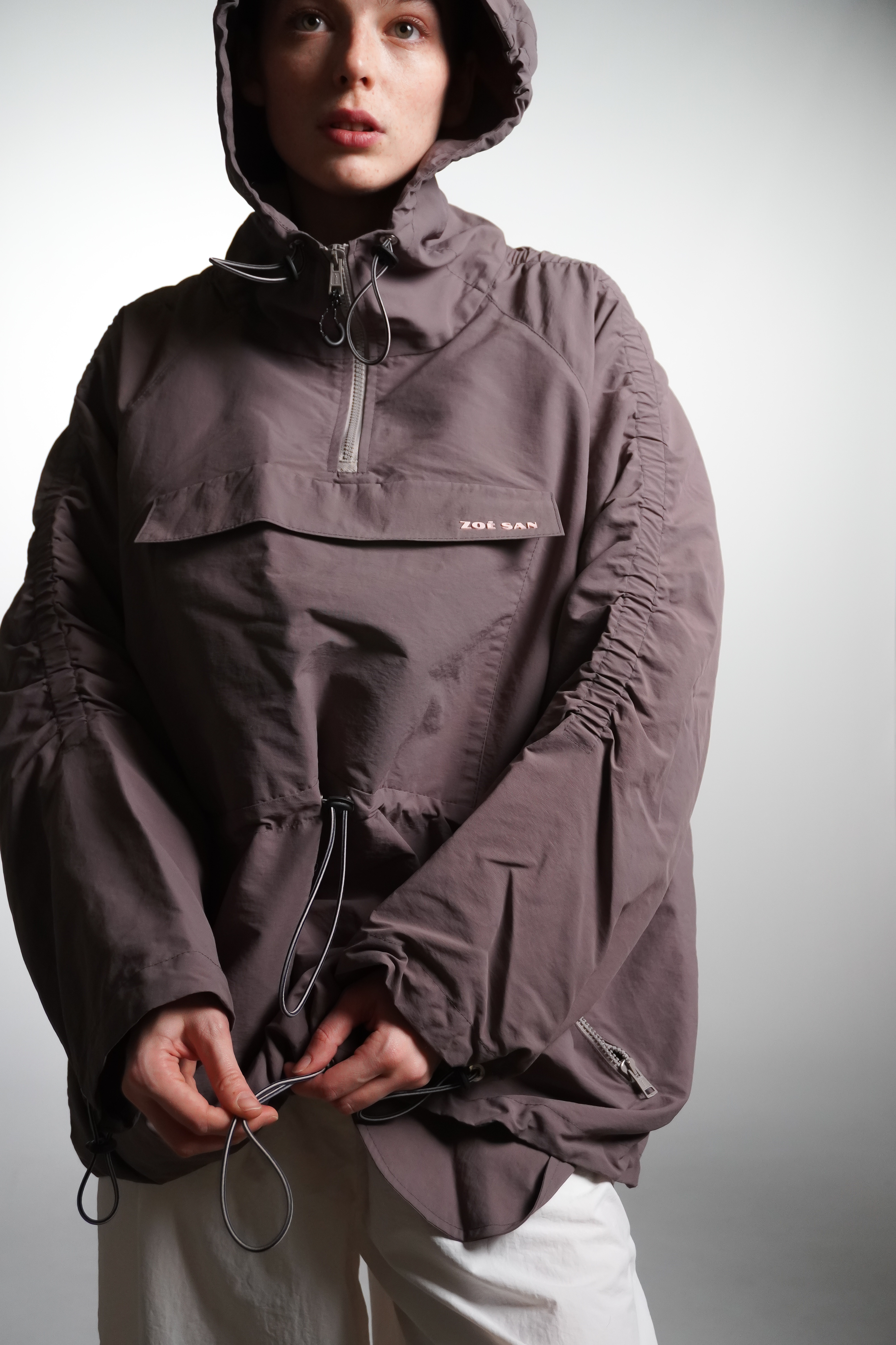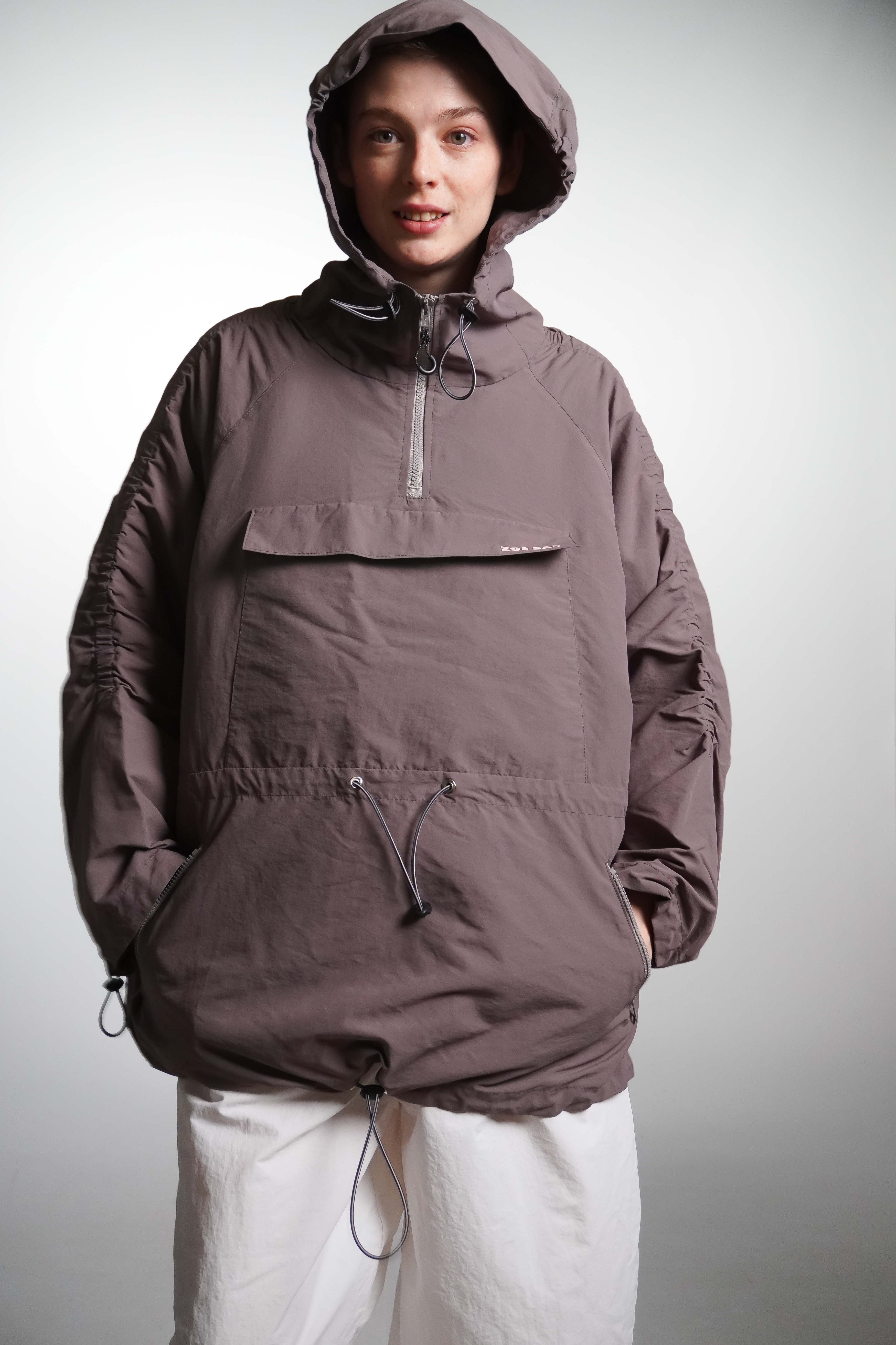 Анорак из водоотталкивающей ткани с капюшоном. Вместительный карман на груди и два кармана по бокам. Есть фиксатор на поясе, можно приталить. Также есть фиксаторы на рукавах и капюшоне, чтобы защититься от ветра в непогоду.