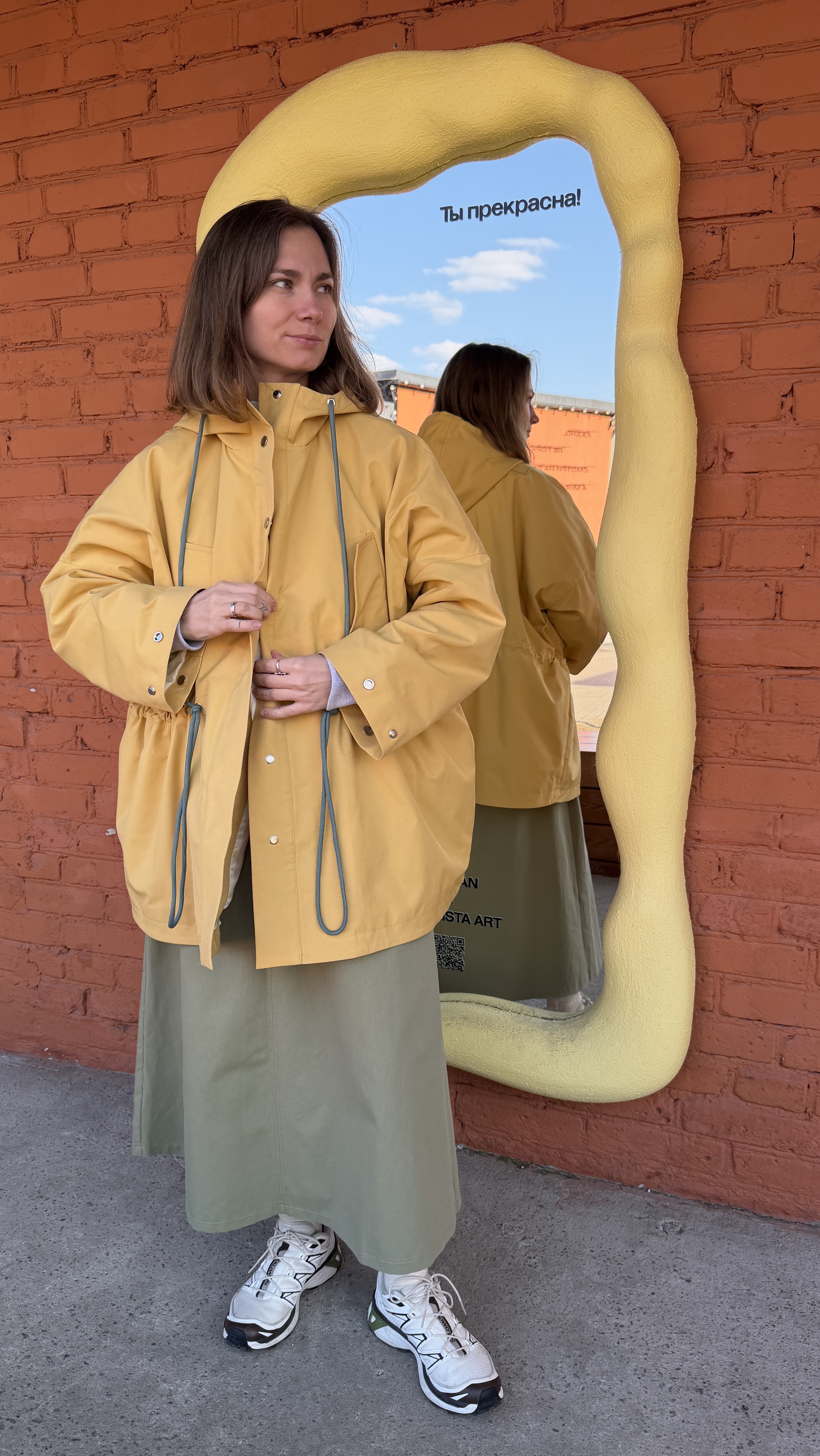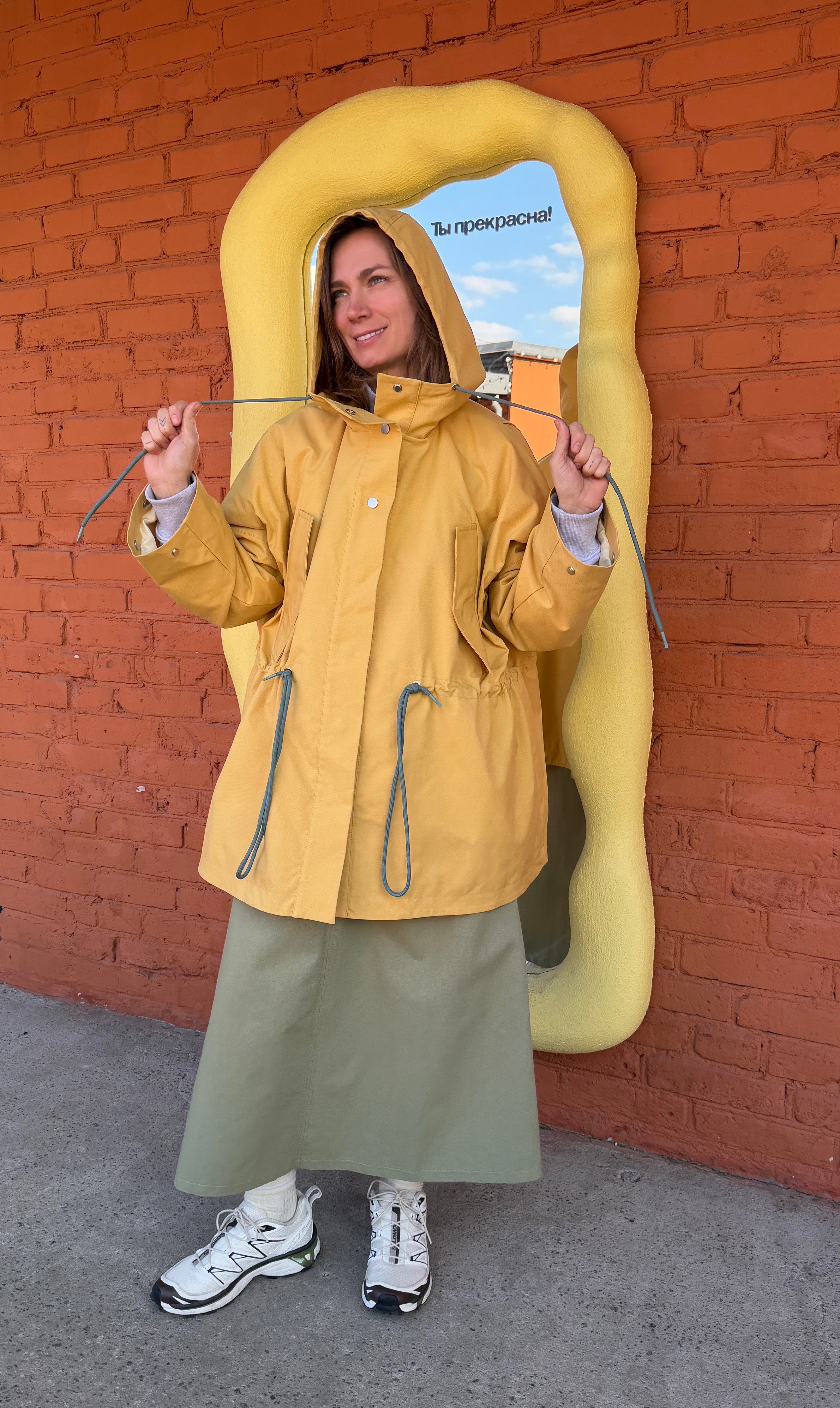 Парка из водоотталкивающей ткани с пропиткой. Изделие идет на подкладке, кулисками можно регулировать посадку. Застегивается на кнопки. Есть капюшон и карманы.
