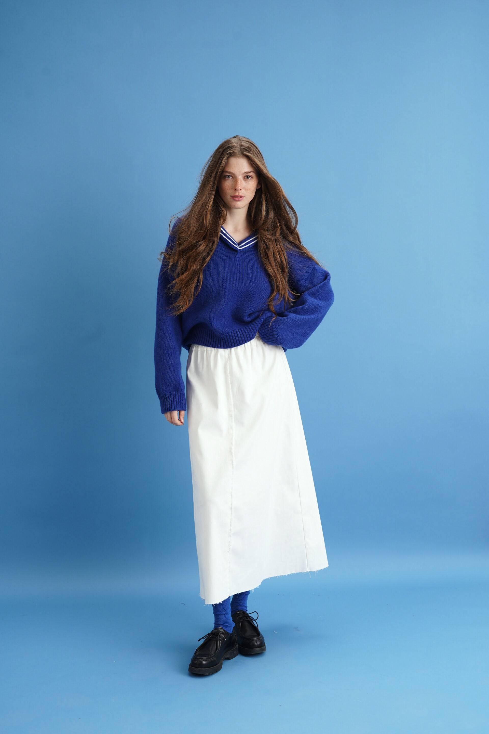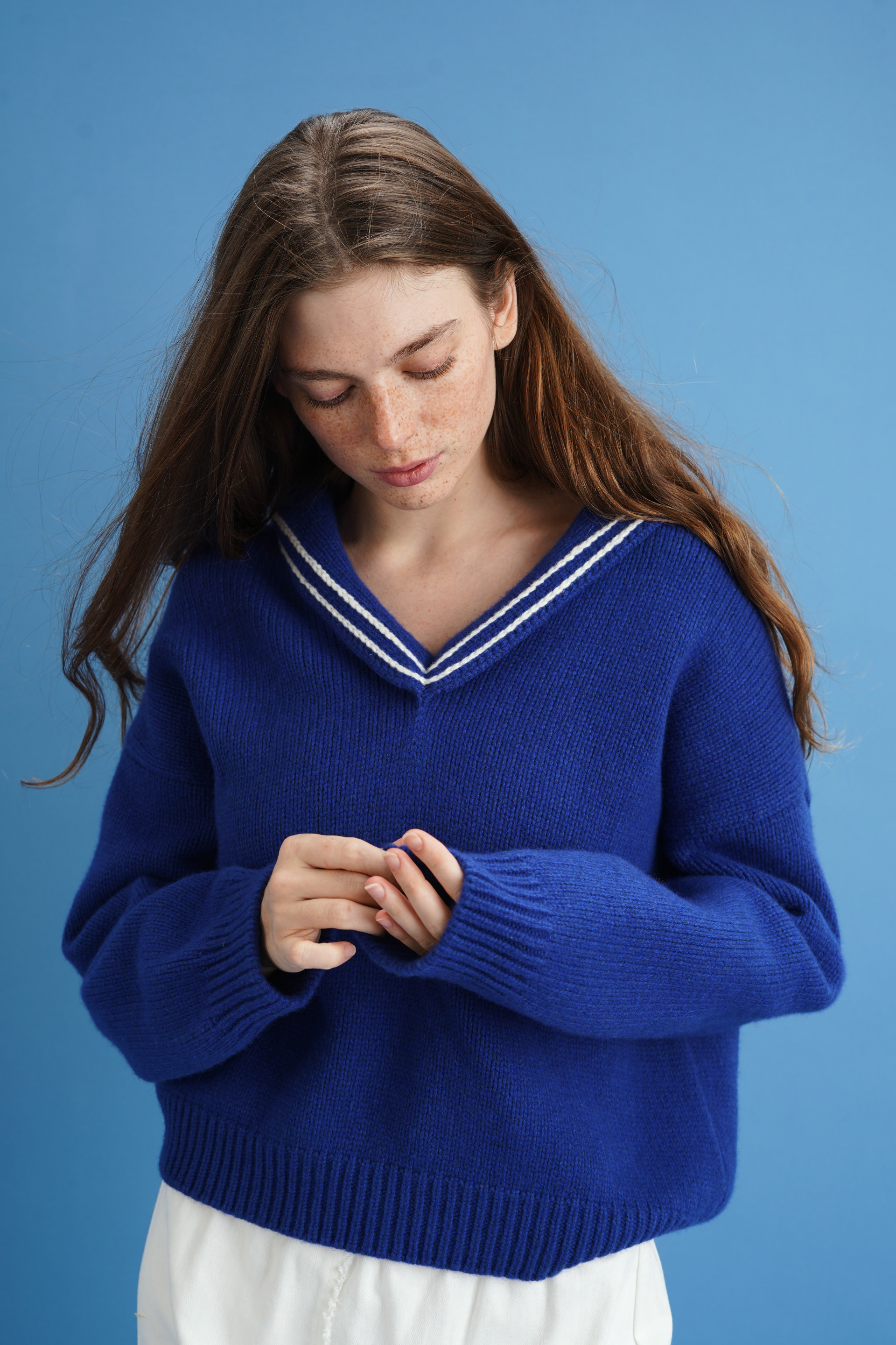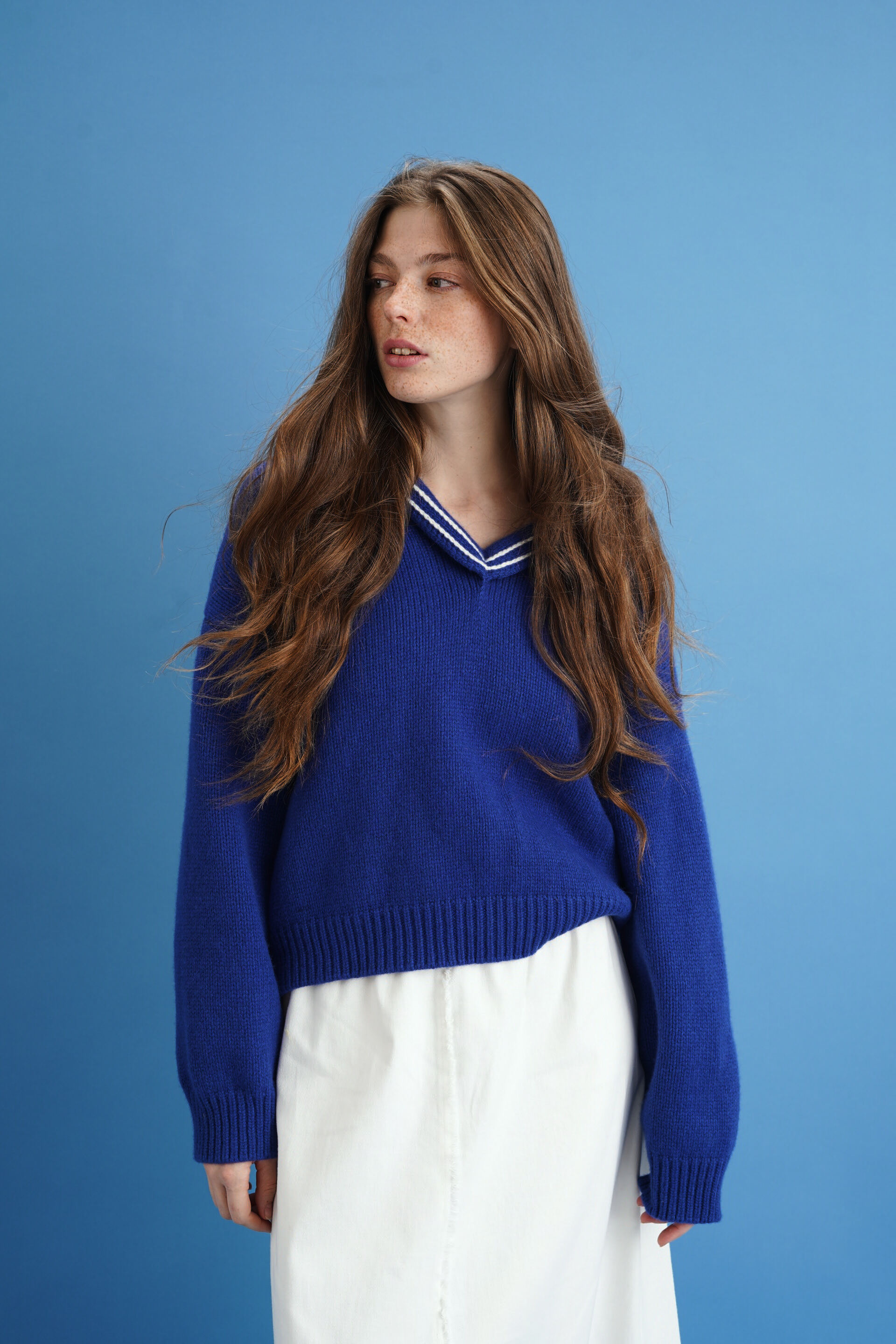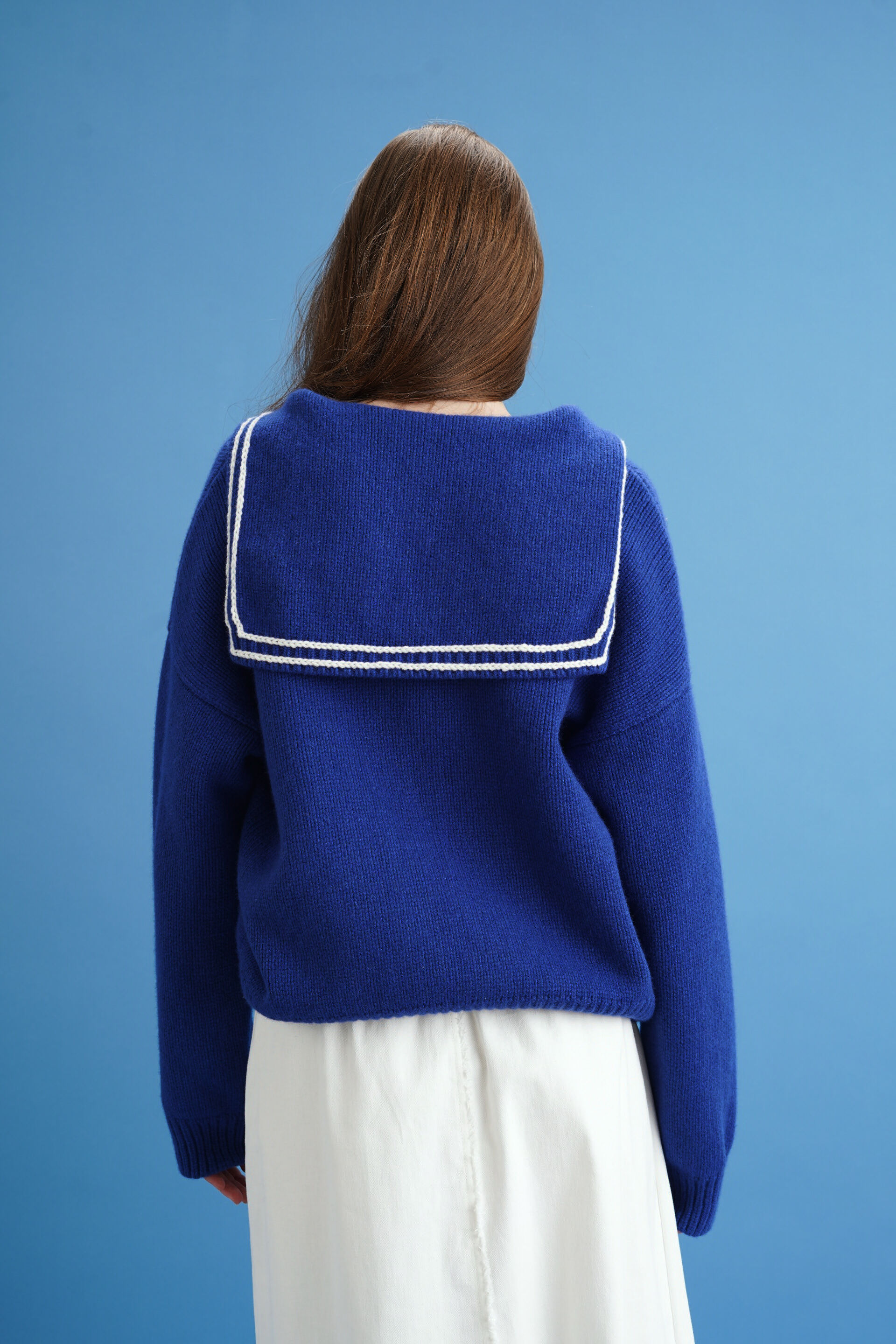 Пуловер с воротником-морячкой из мериноса синего цвета ПРЕДЗАКАЗ