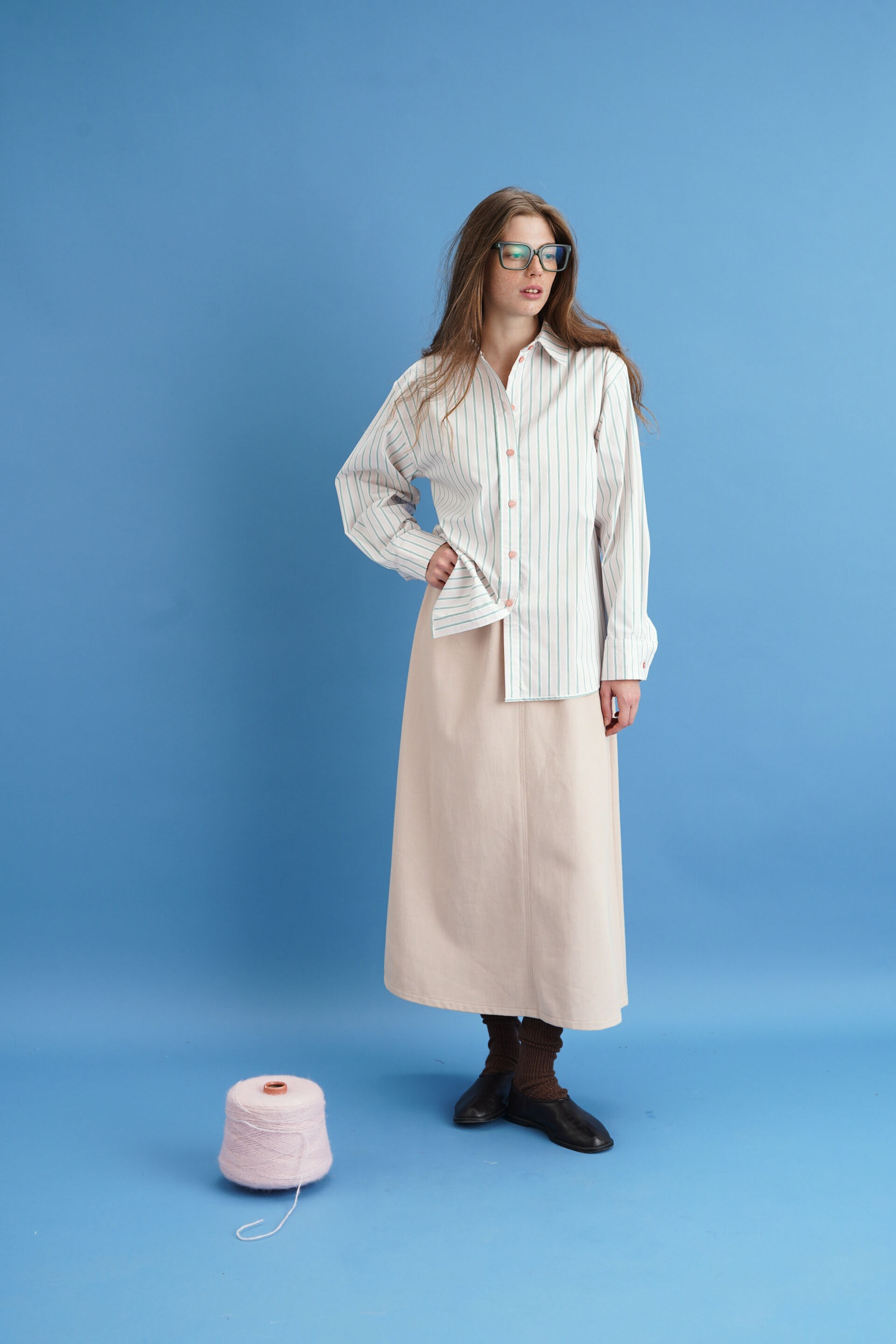 Юбка-трапеция из джинсы, ткань держит форму. Пояс резинкой. Без карманов.