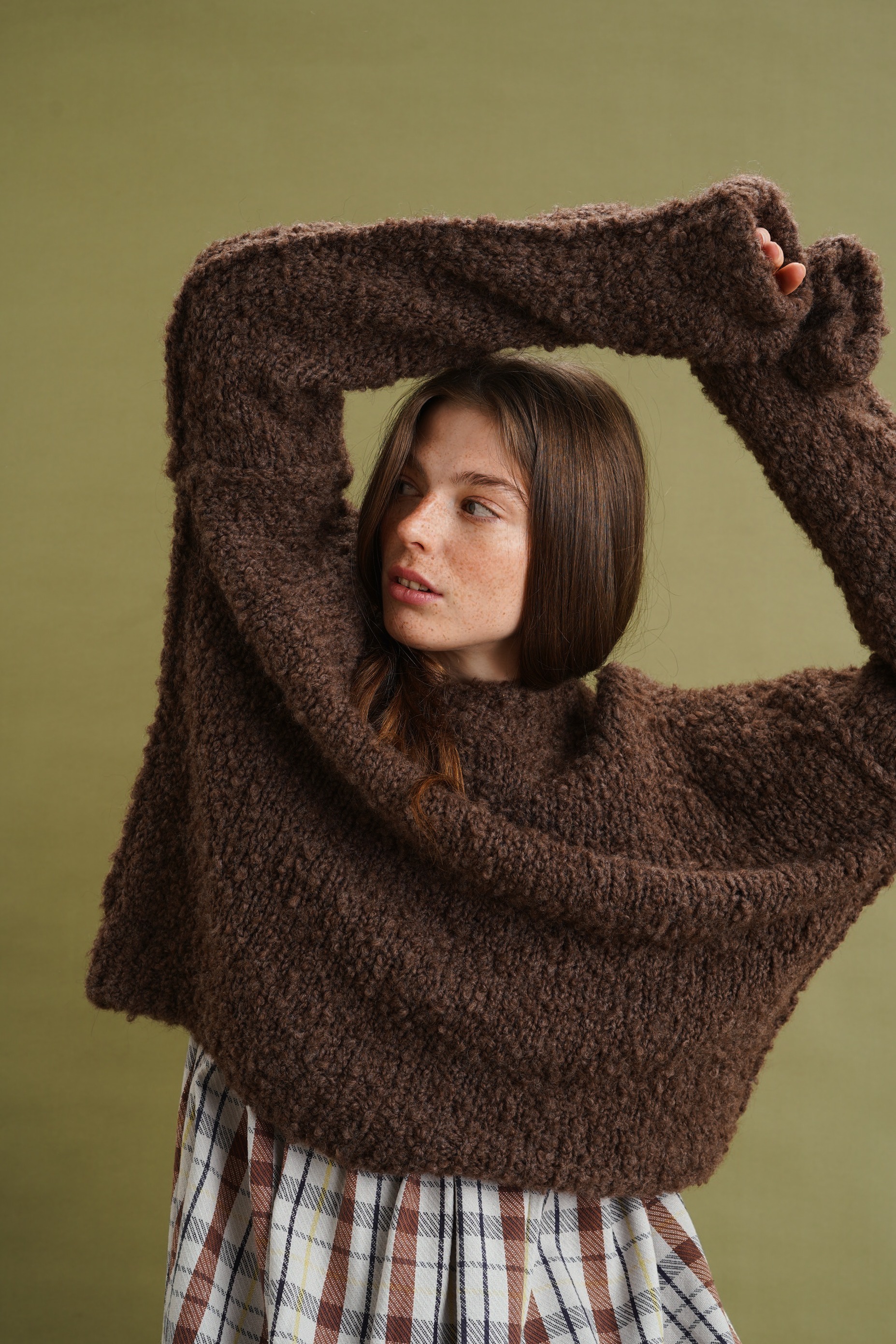 Мягкий объёмный джемпер из полностью натурального бекон альпака. Фактурная пряжа создаёт ощущение воздушности и нежности, а наружные швы добавляют современной ручной эстетики.