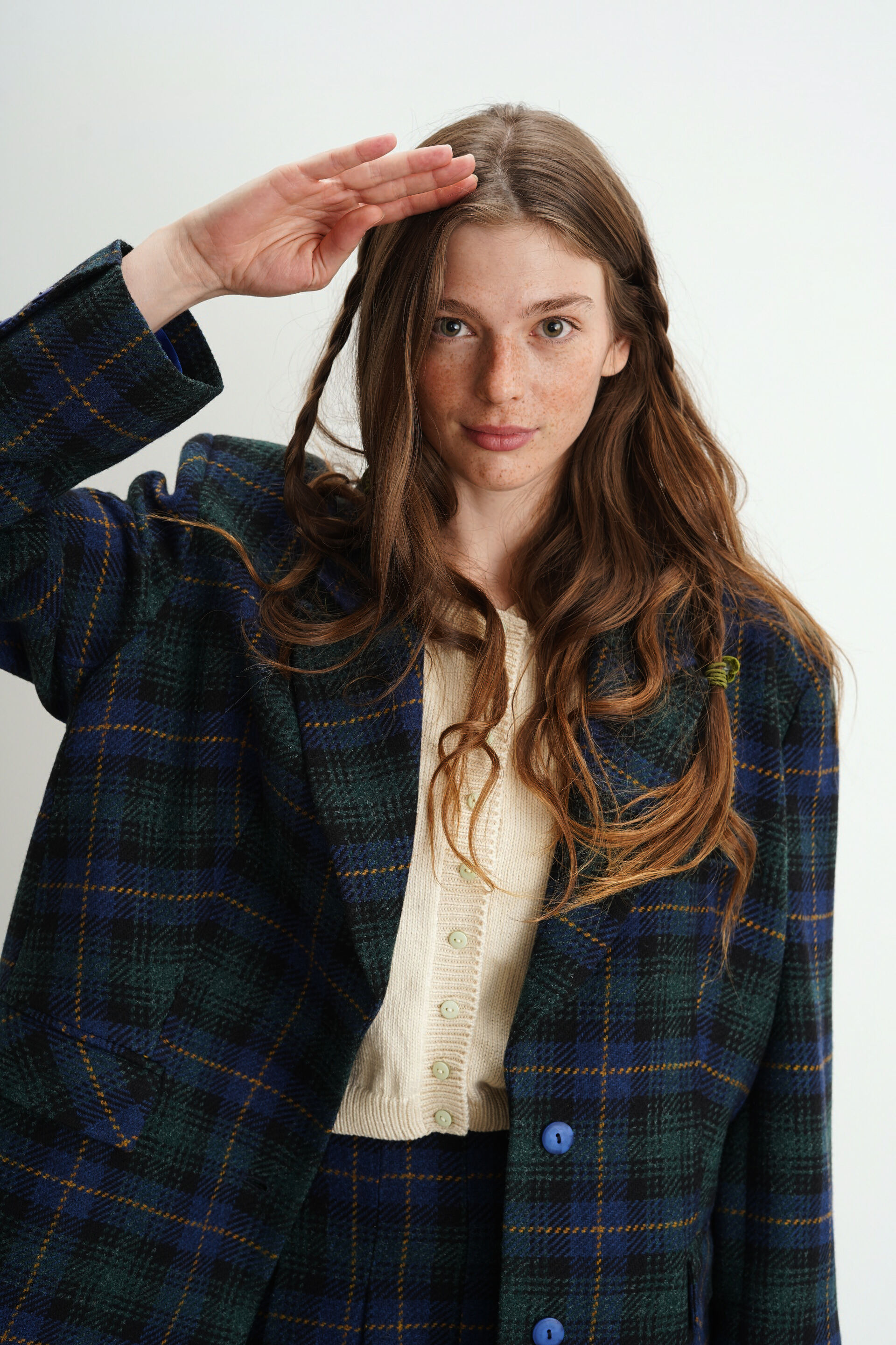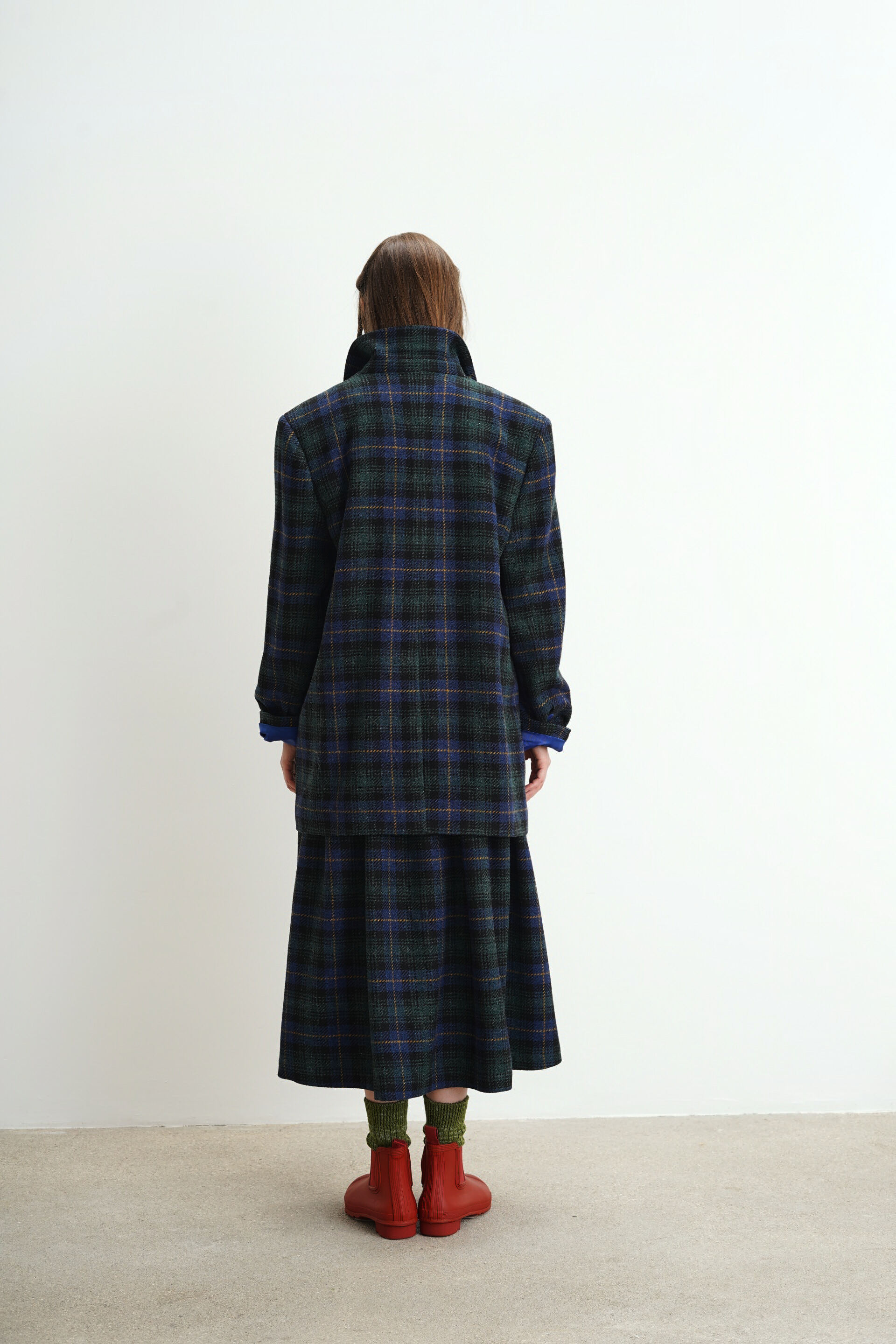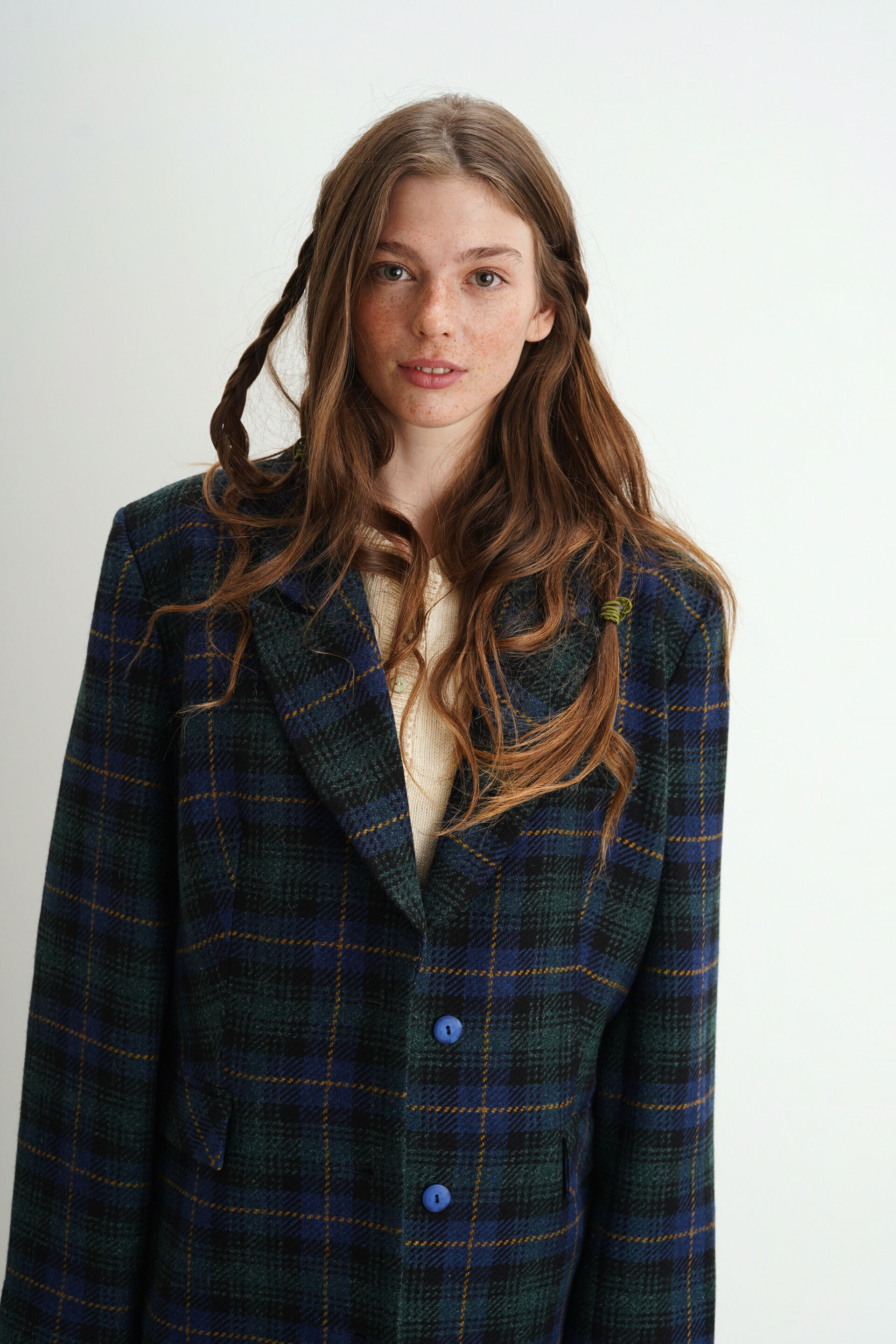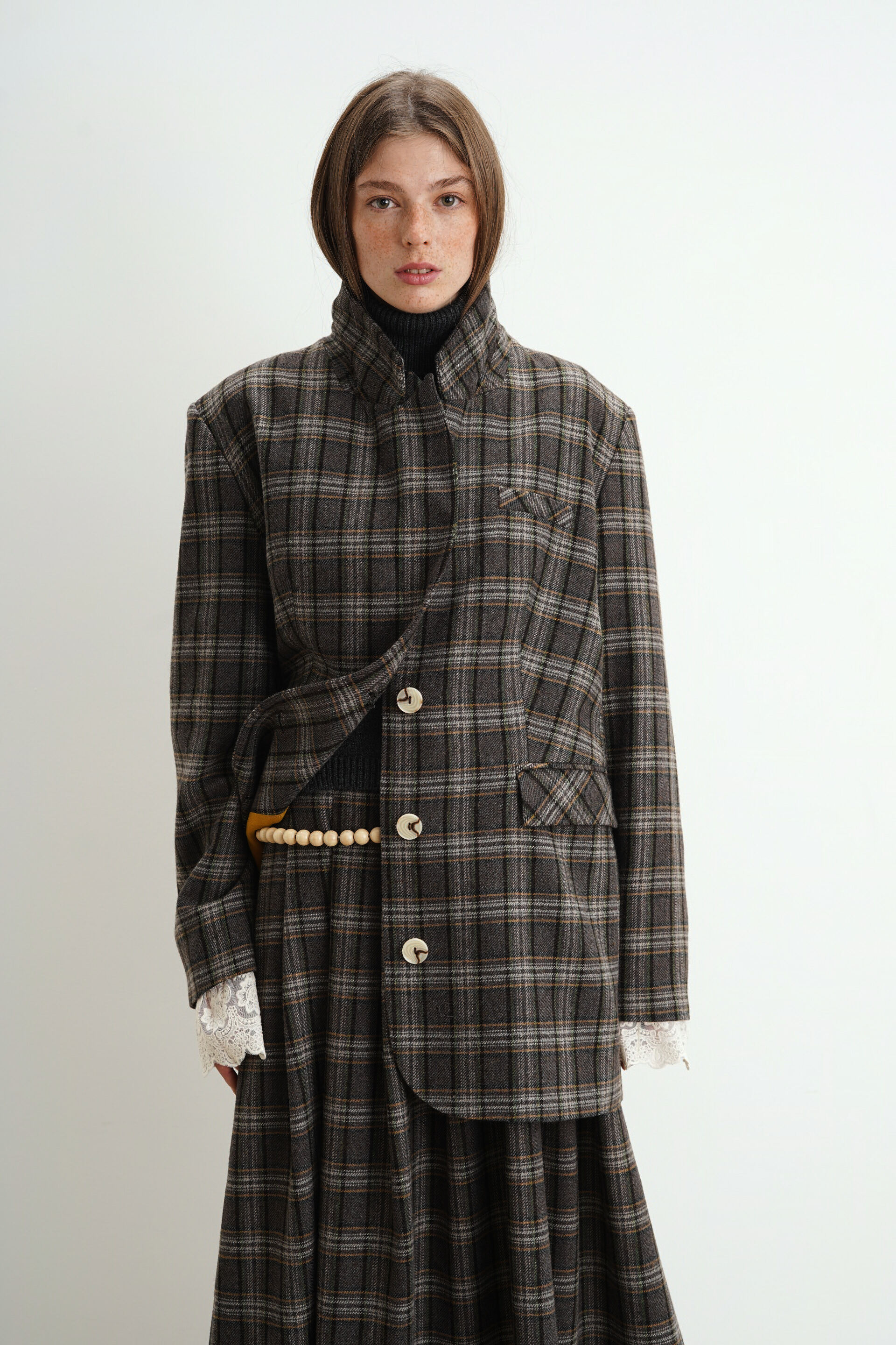 Пиджак однобортный свободного кроя из итальянской смесовой шерсти с контрастной подладкой. Есть карманы.