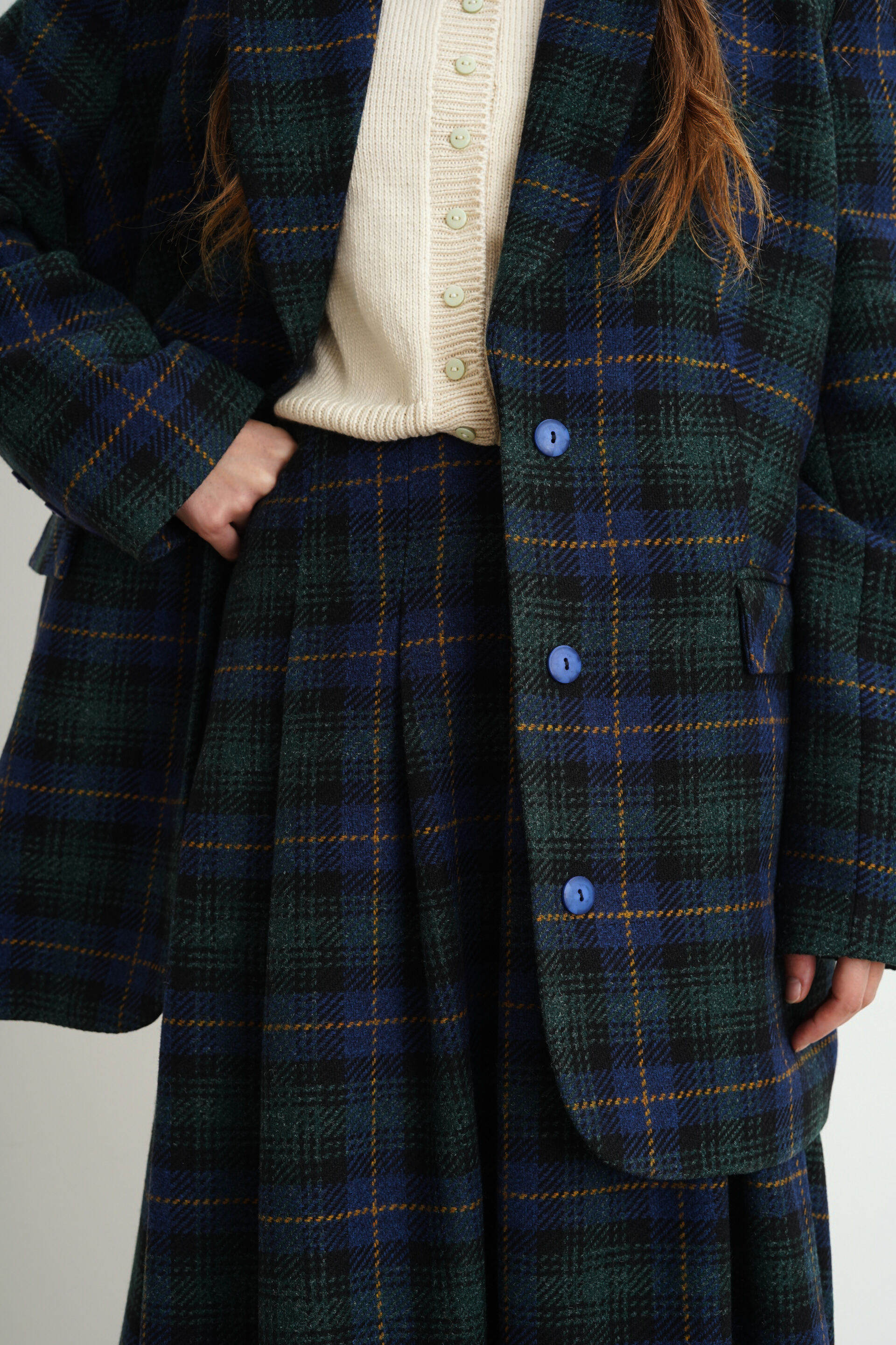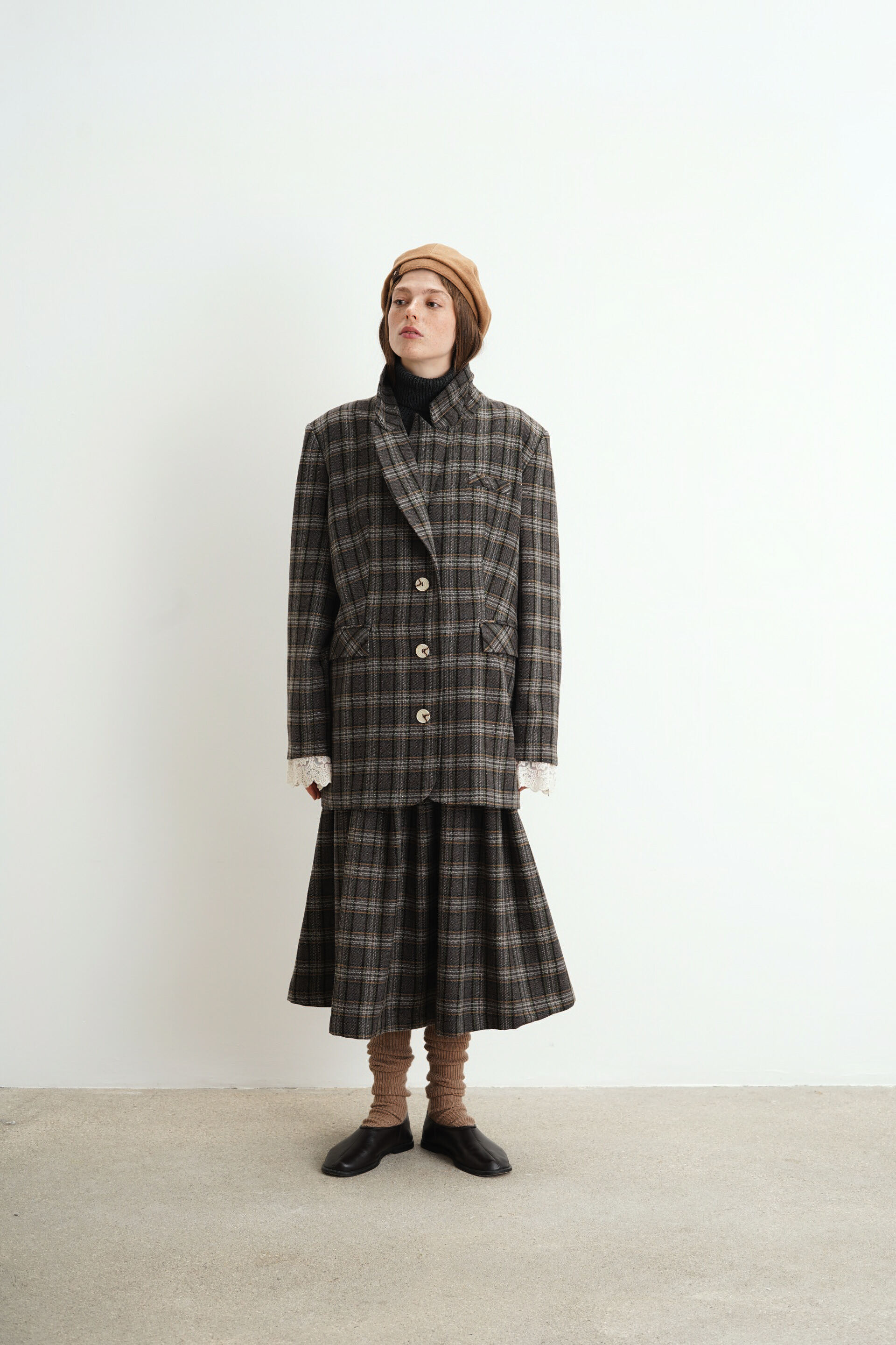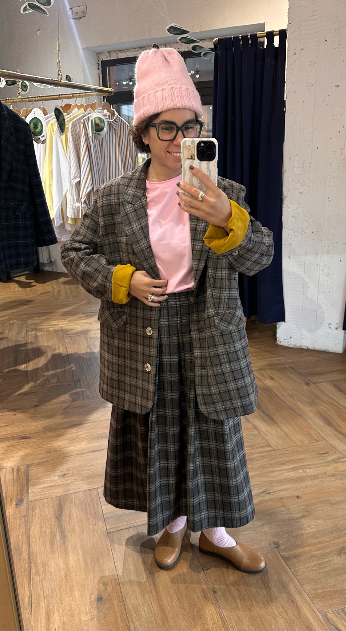 Пиджак однобортный свободного кроя из итальянской смесовой шерсти с контрастной подладкой. Есть карманы.
