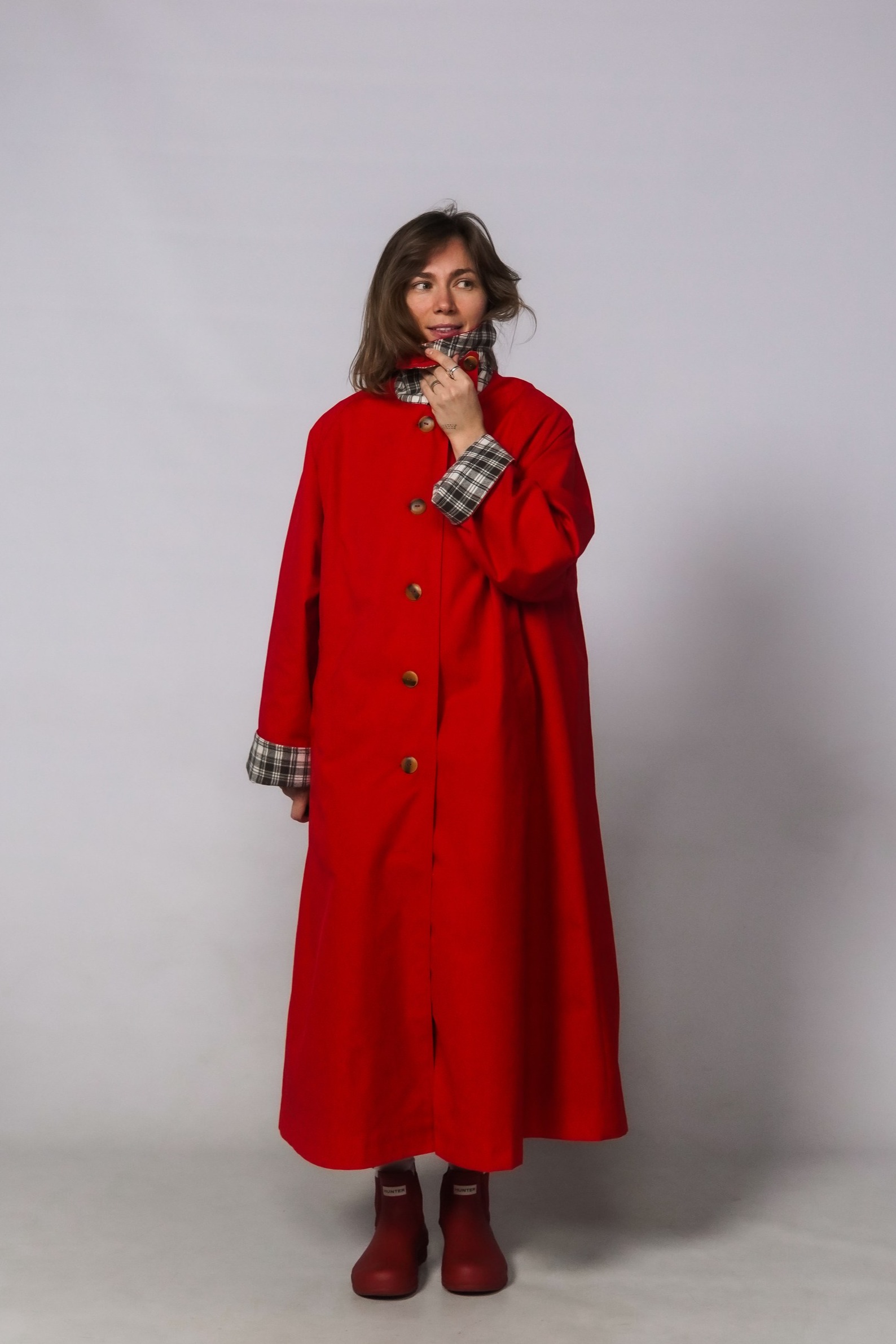 Плащ свободного кроя из ткани с пропиткой c водоотталкивающим эффектом. Плащ идет с подкладом, имеет закрытые швы, есть карманы. На горле перемычка.