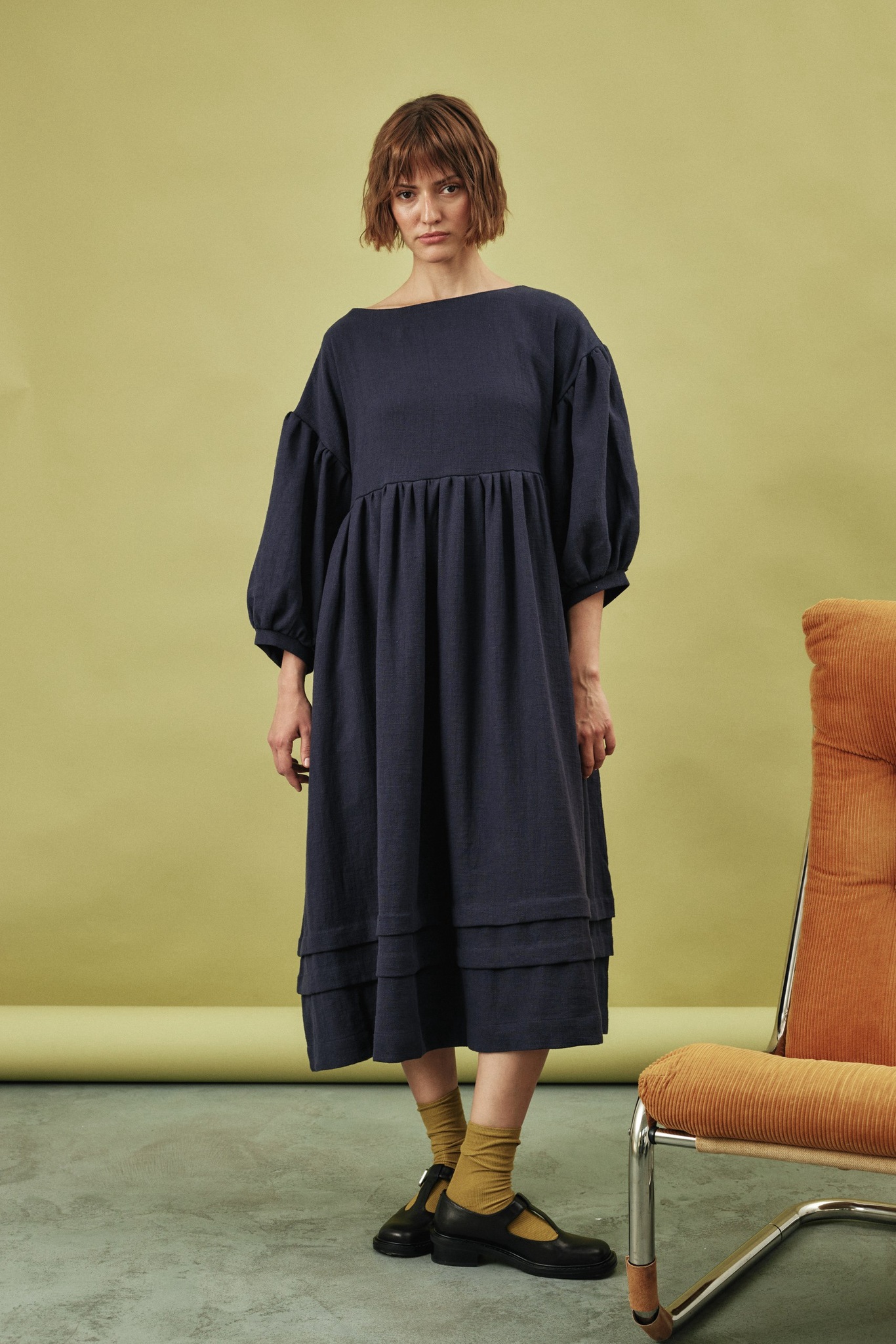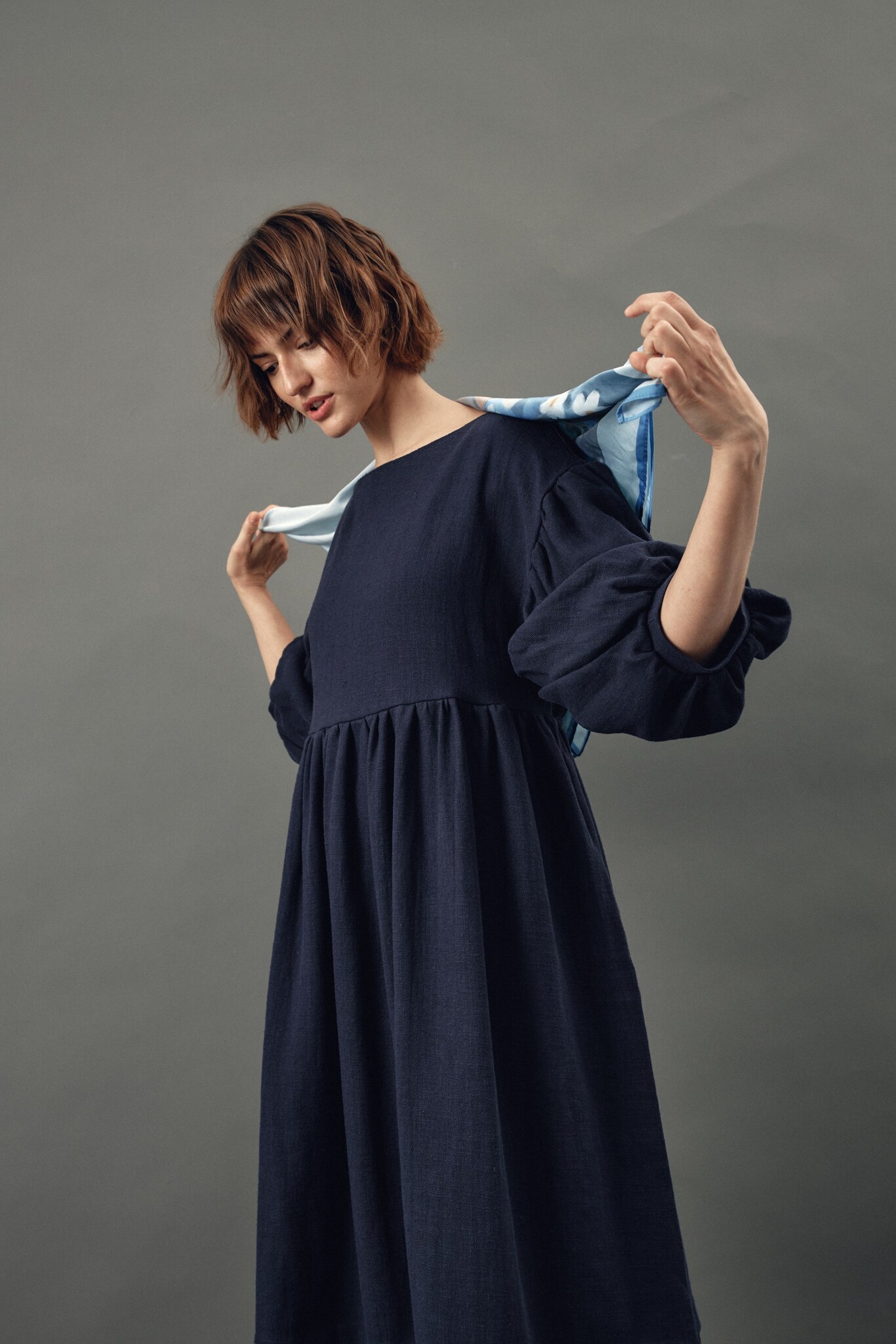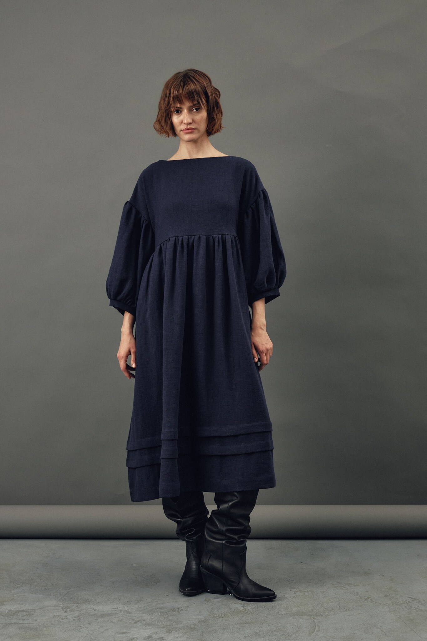 Платье свободного кроя с вырезом-лодочкой и горизонтальными защипами на юбке. Есть карманы.