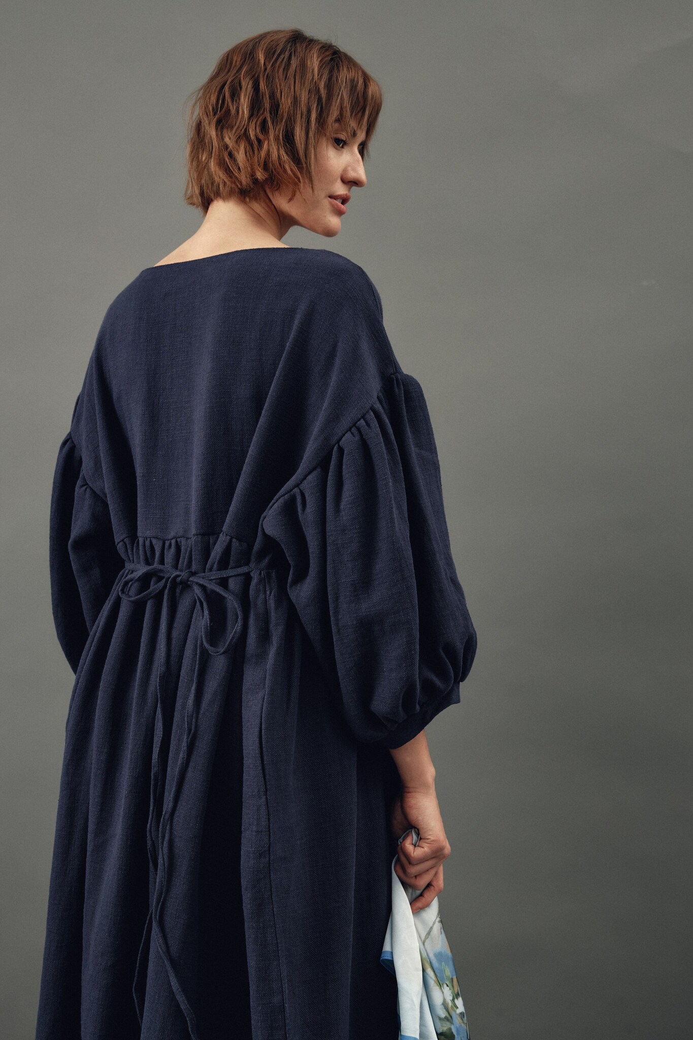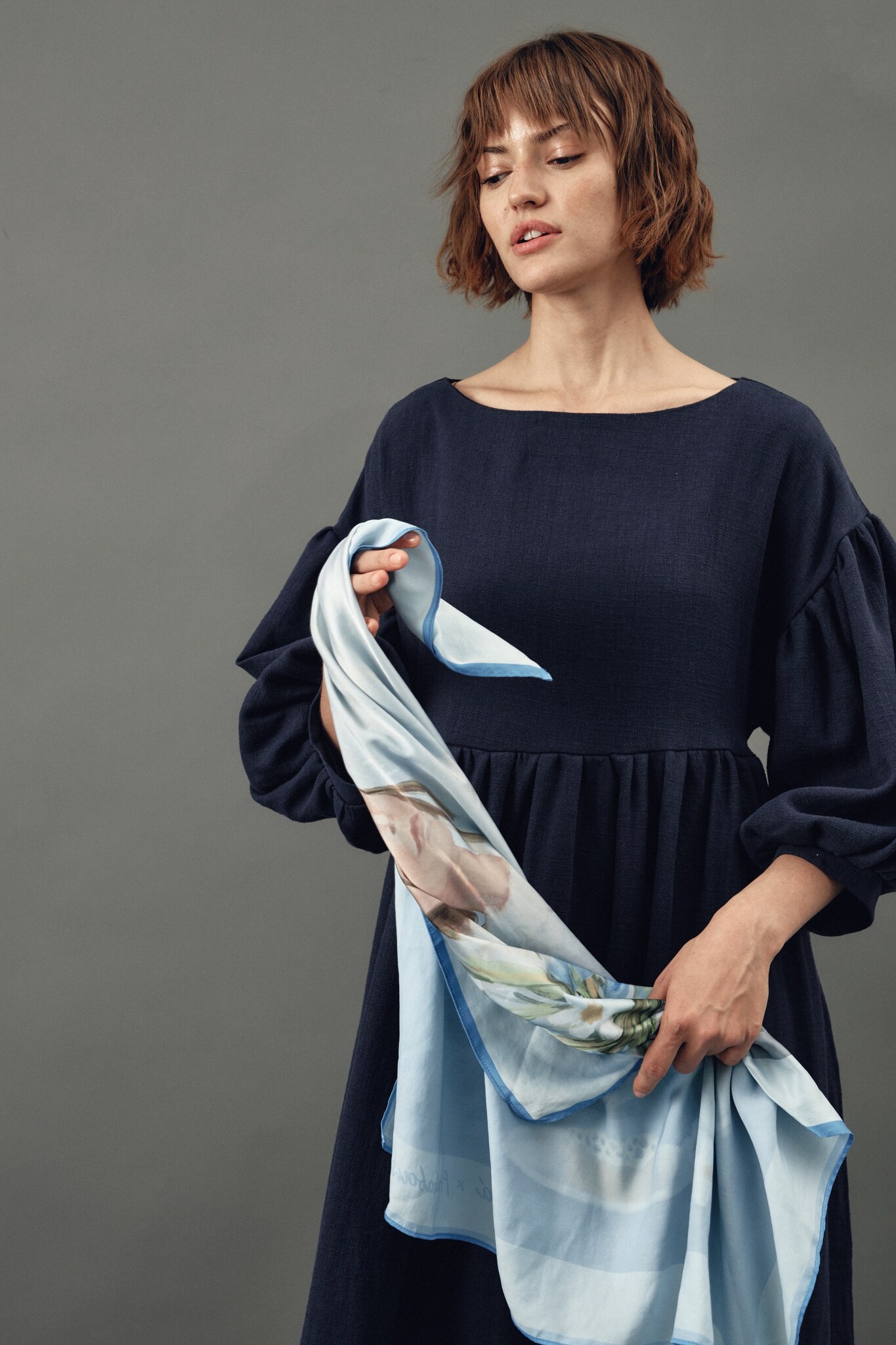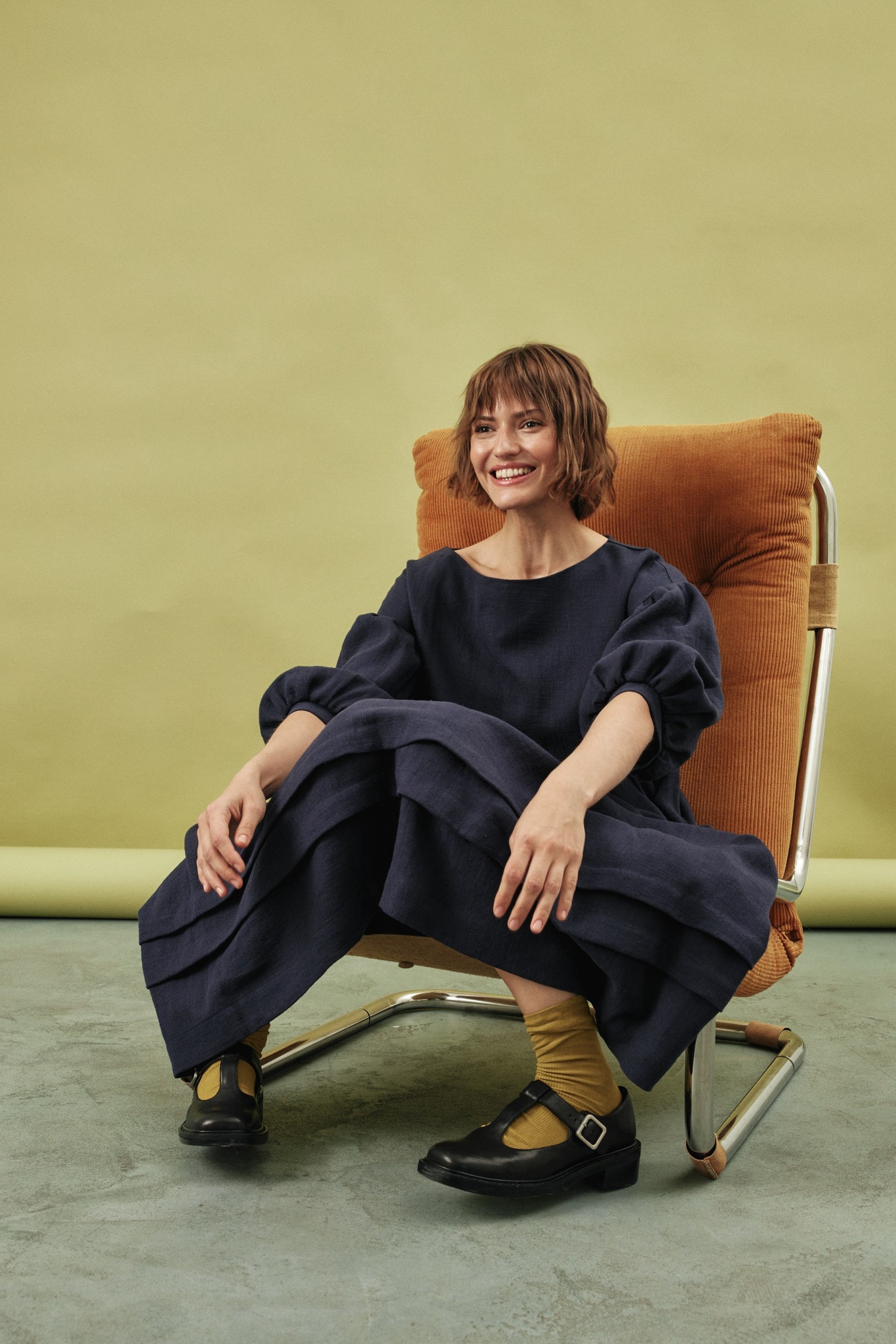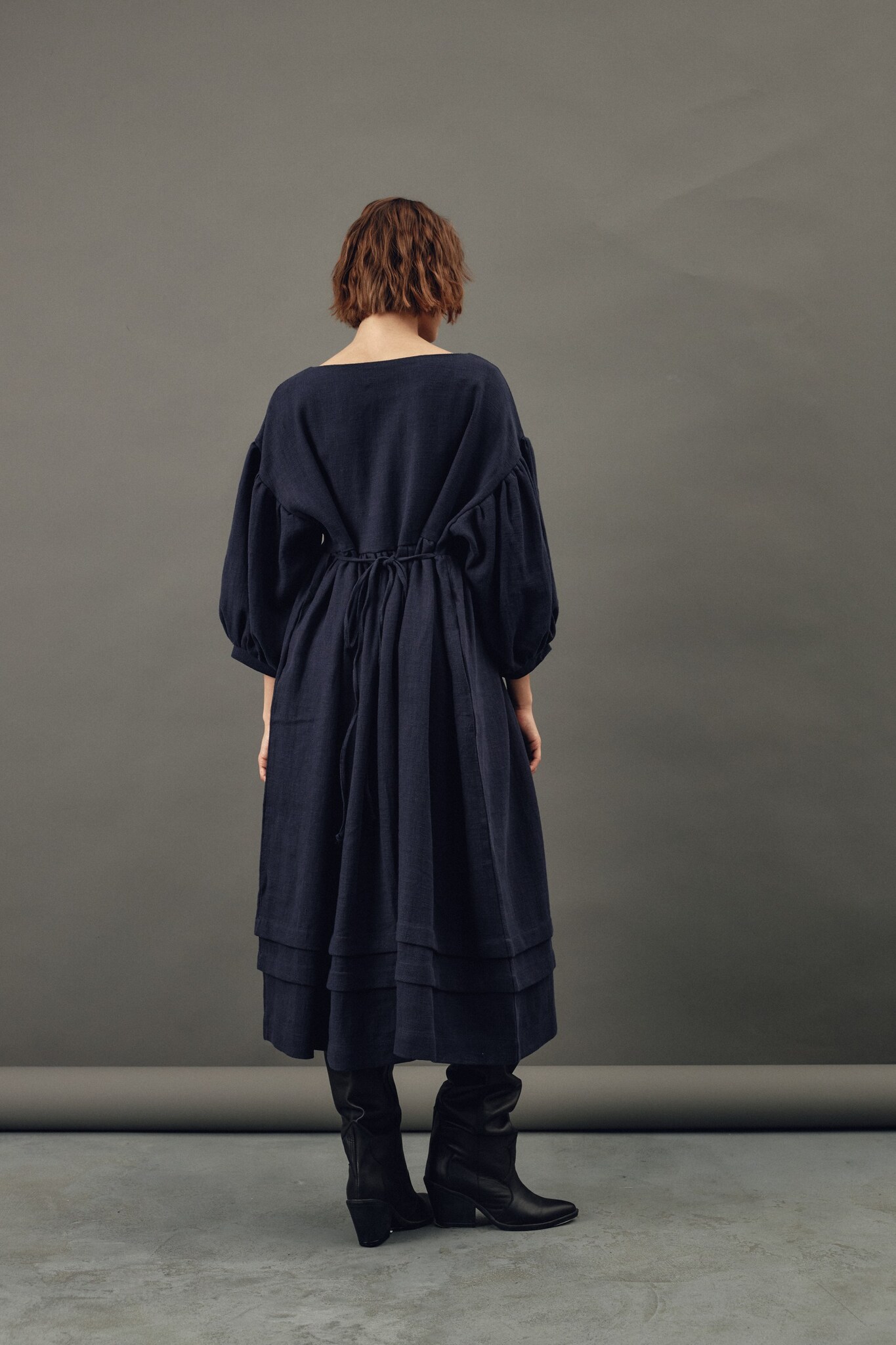 Платье свободного кроя с вырезом-лодочкой и горизонтальными защипами на юбке. Есть карманы.