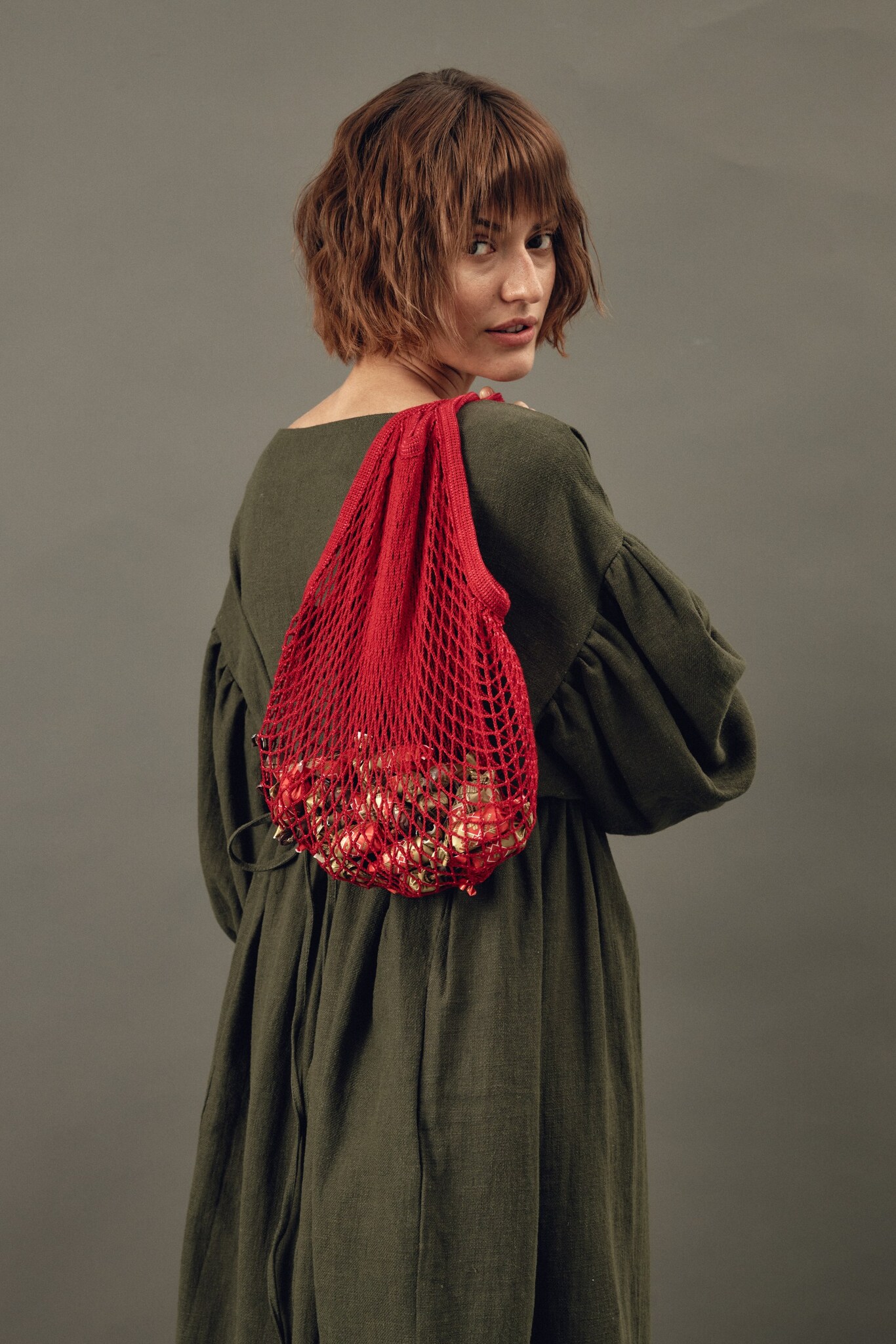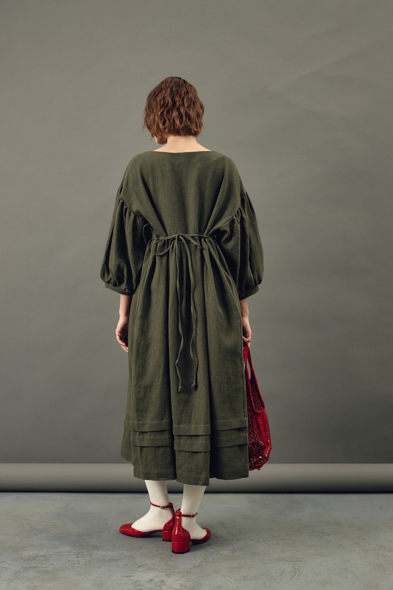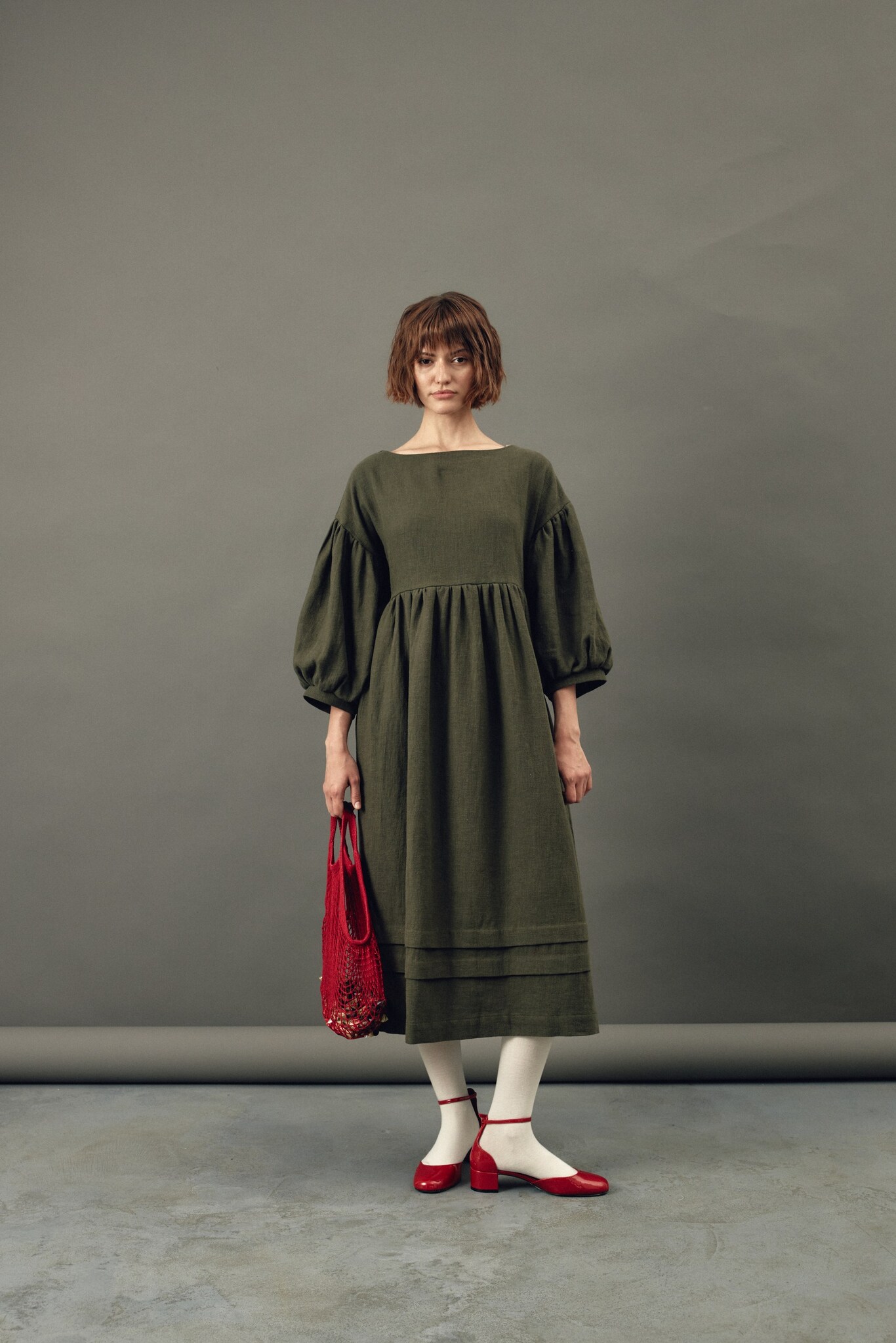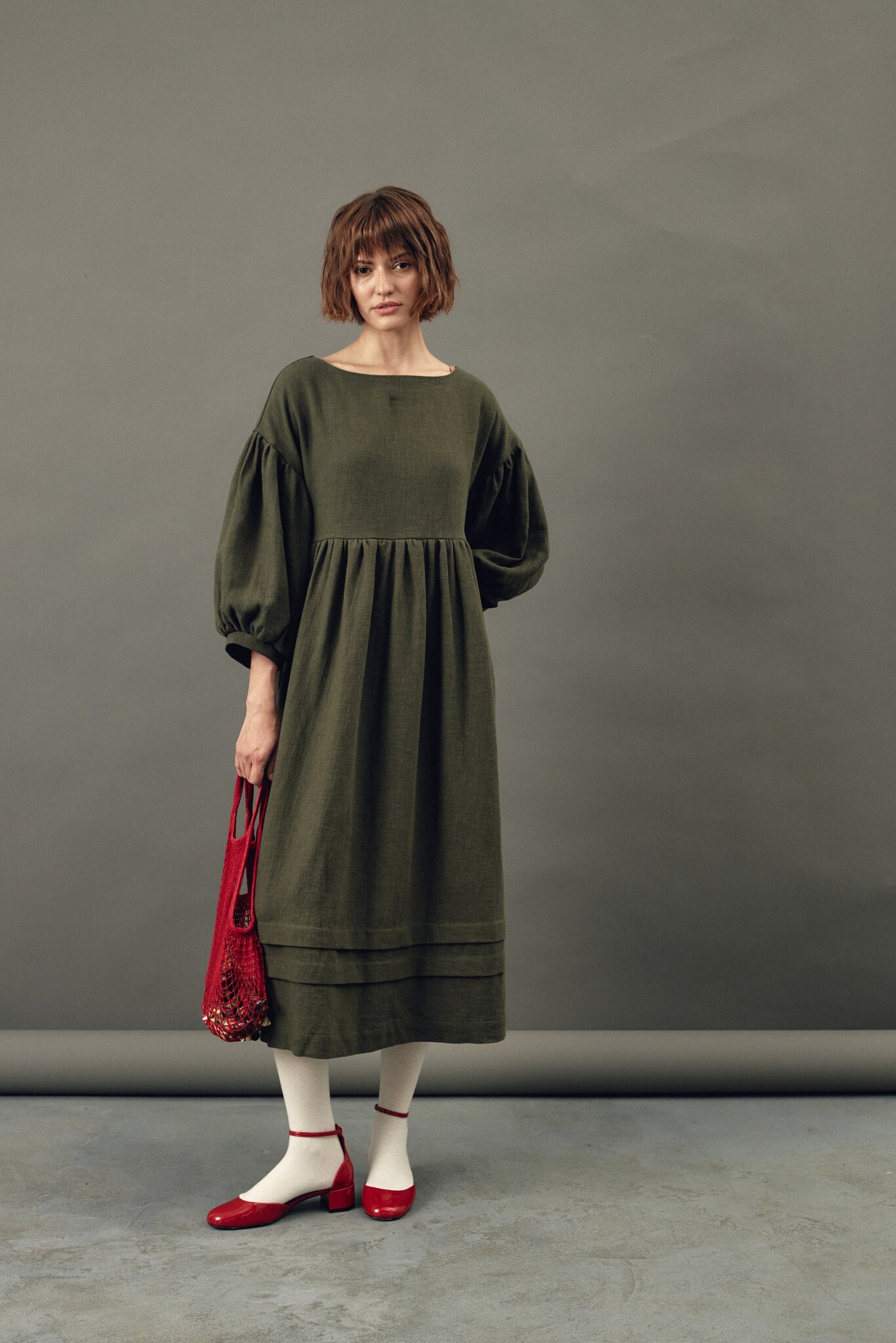 Платье свободного кроя с вырезом-лодочкой и горизонтальными защипами на юбке. Есть карманы.