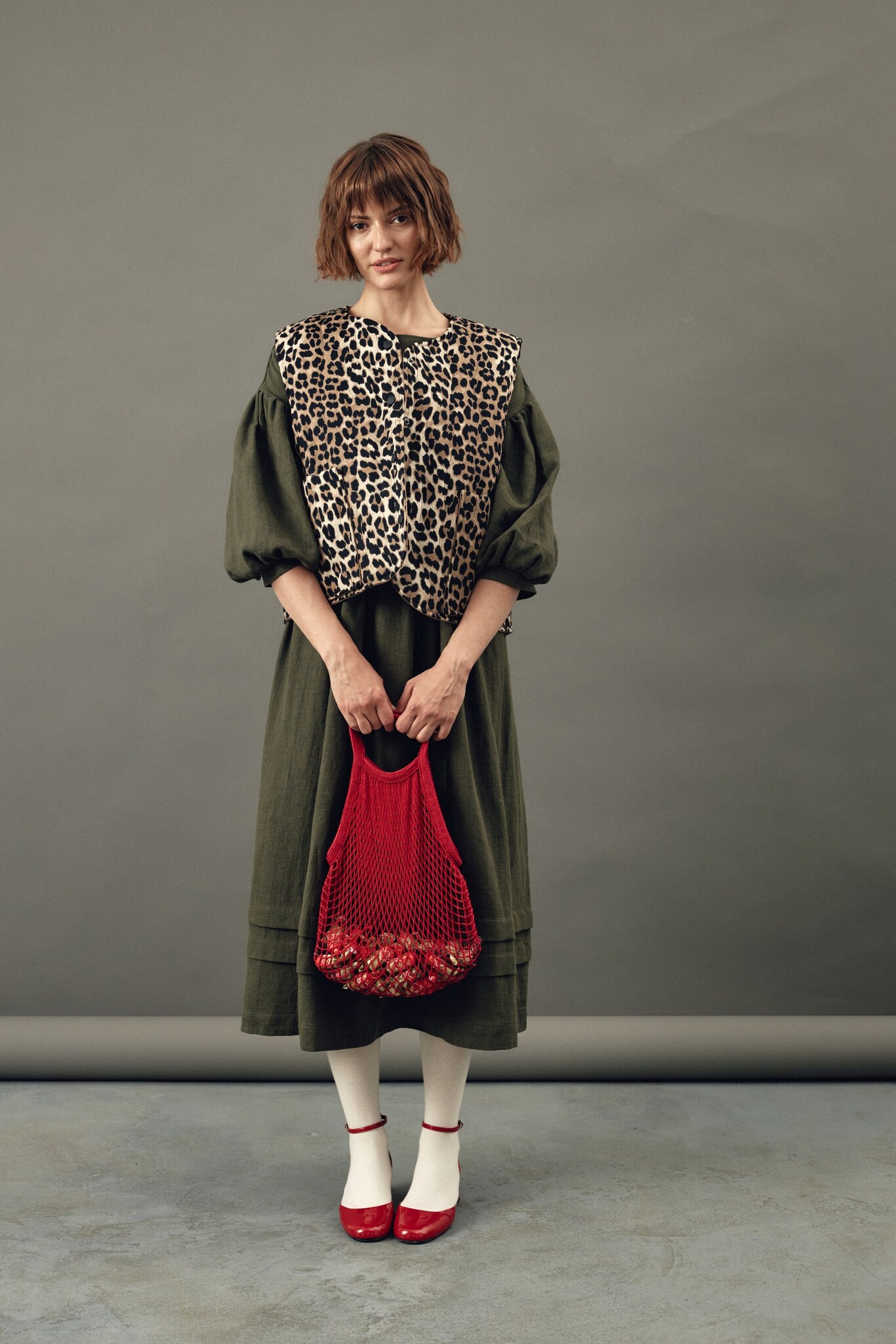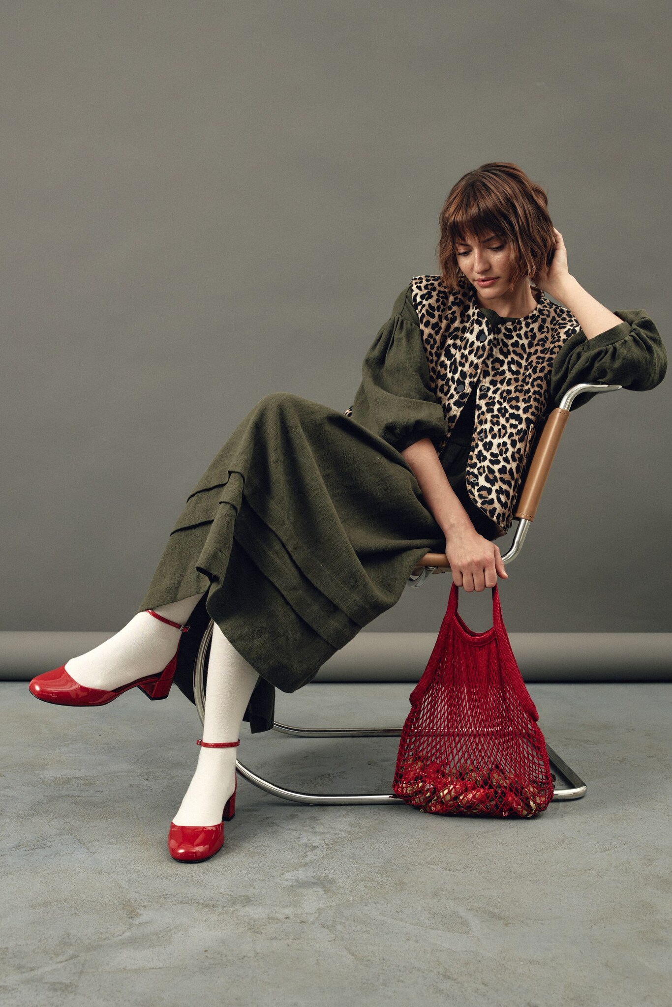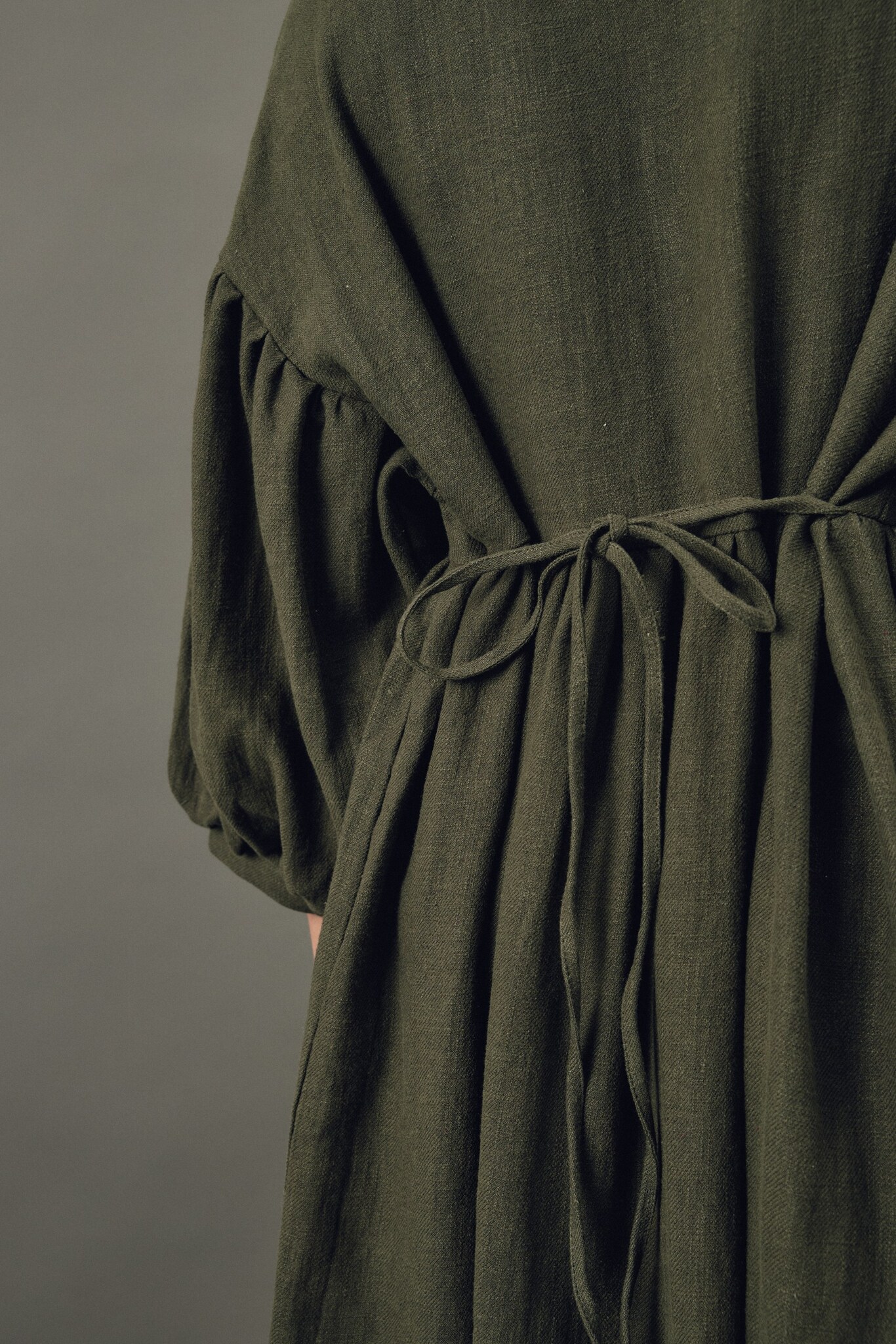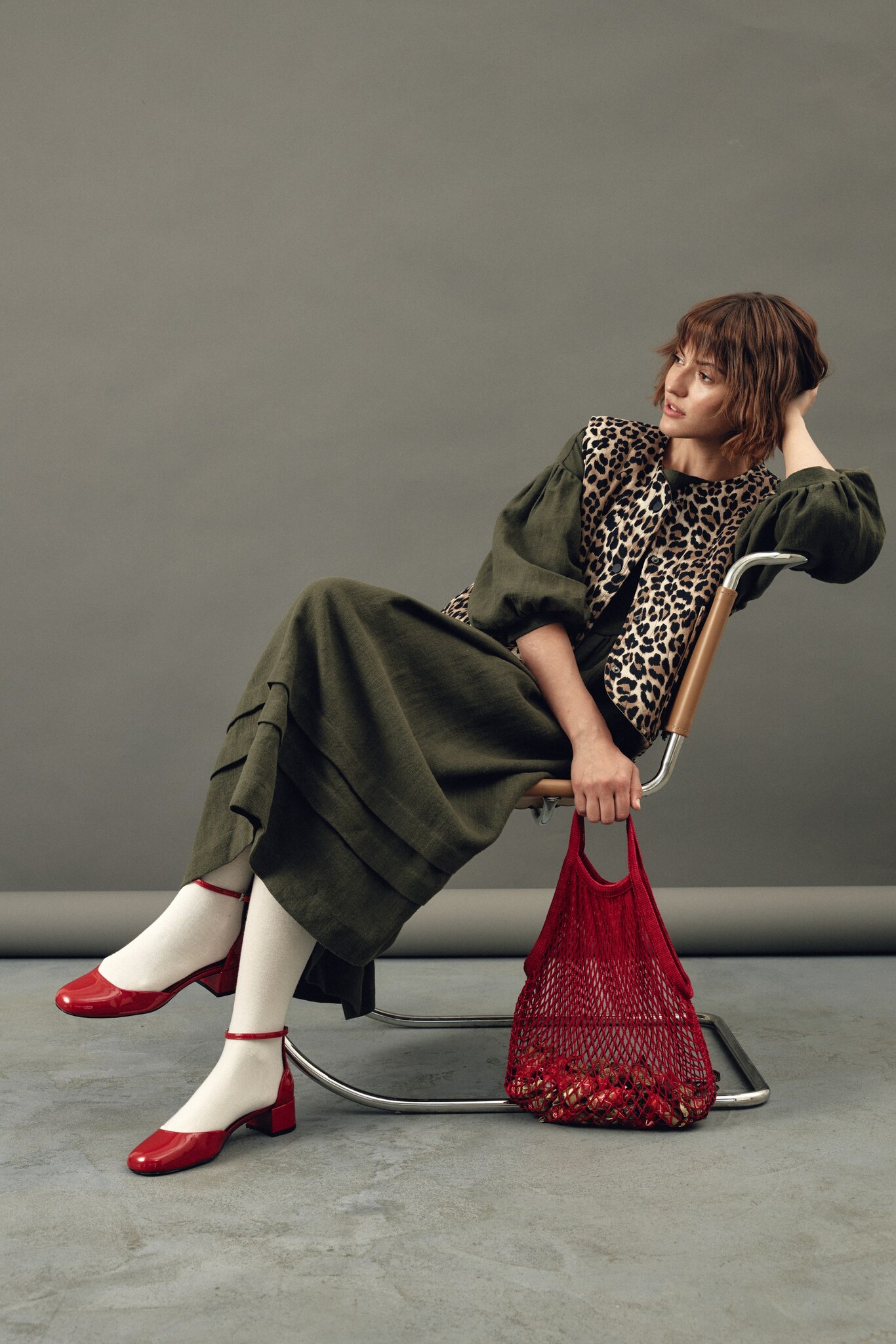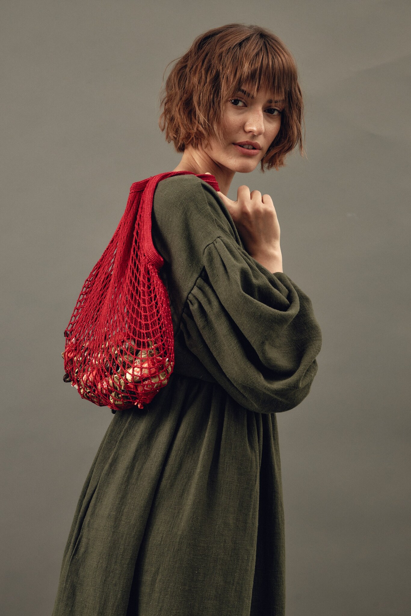 Платье свободного кроя с вырезом-лодочкой и горизонтальными защипами на юбке. Есть карманы.