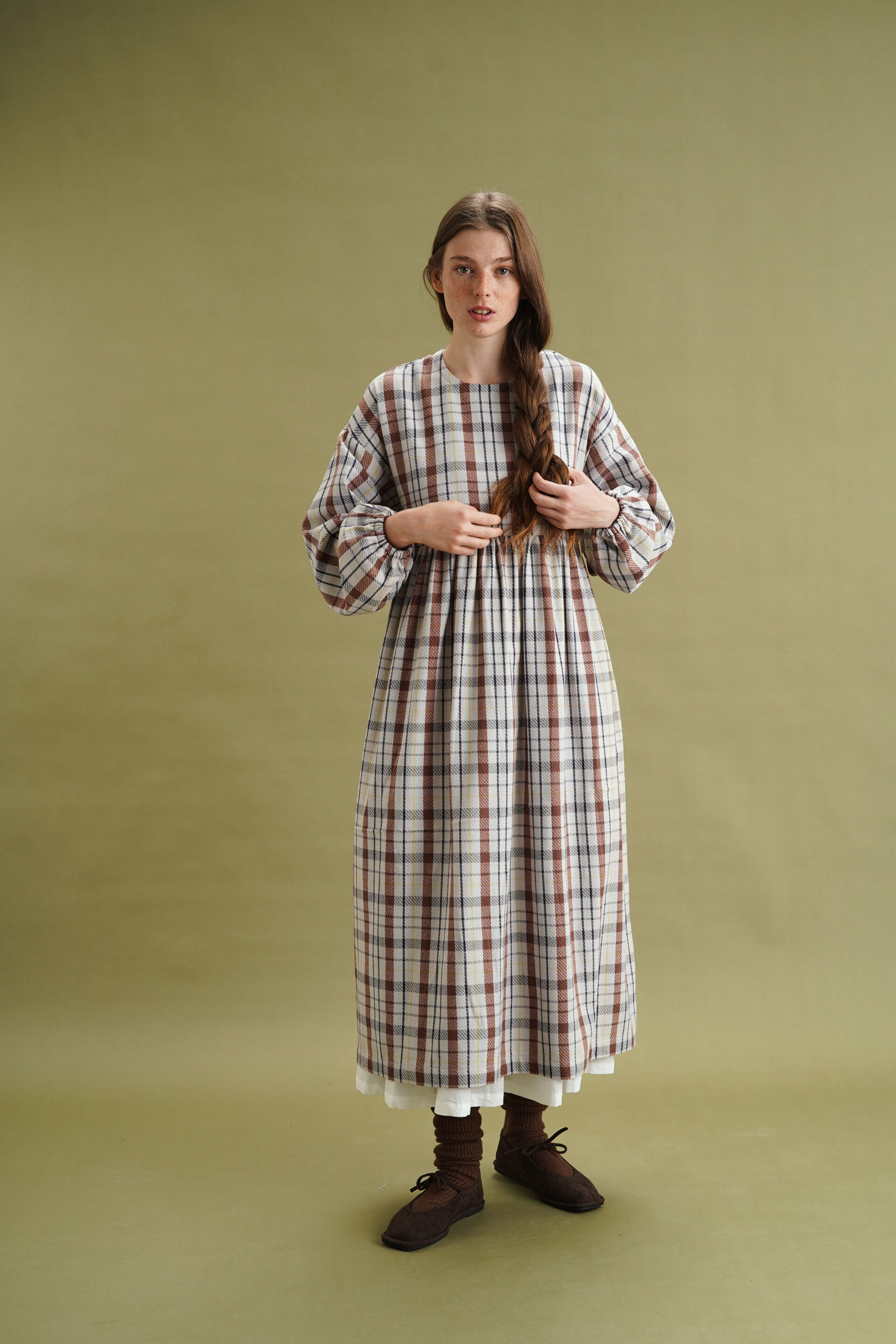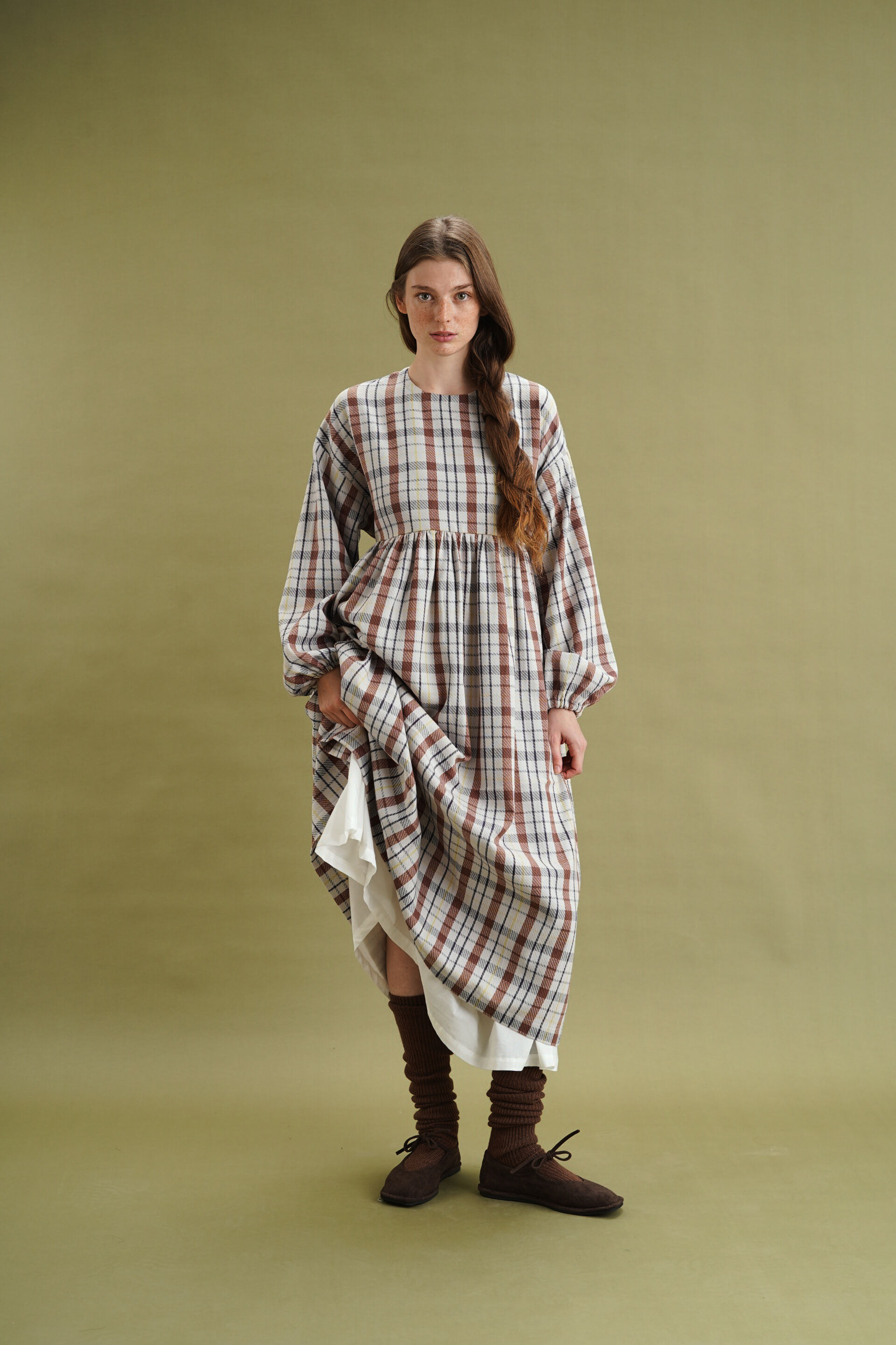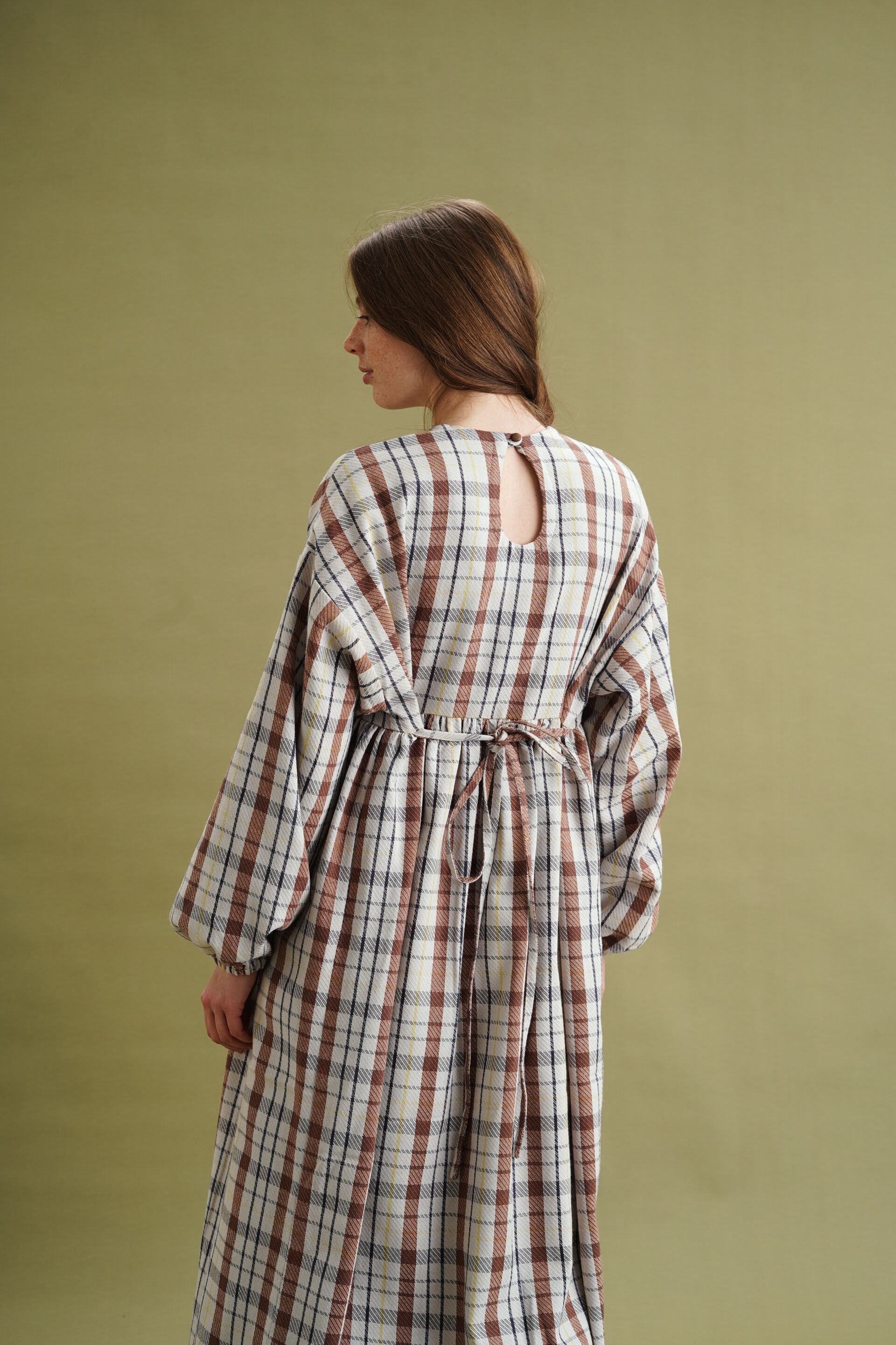 Платье оверсайз с круглым воротом и длинным рукавом на резинке. Есть завязки для регулировки посадки и карманы.