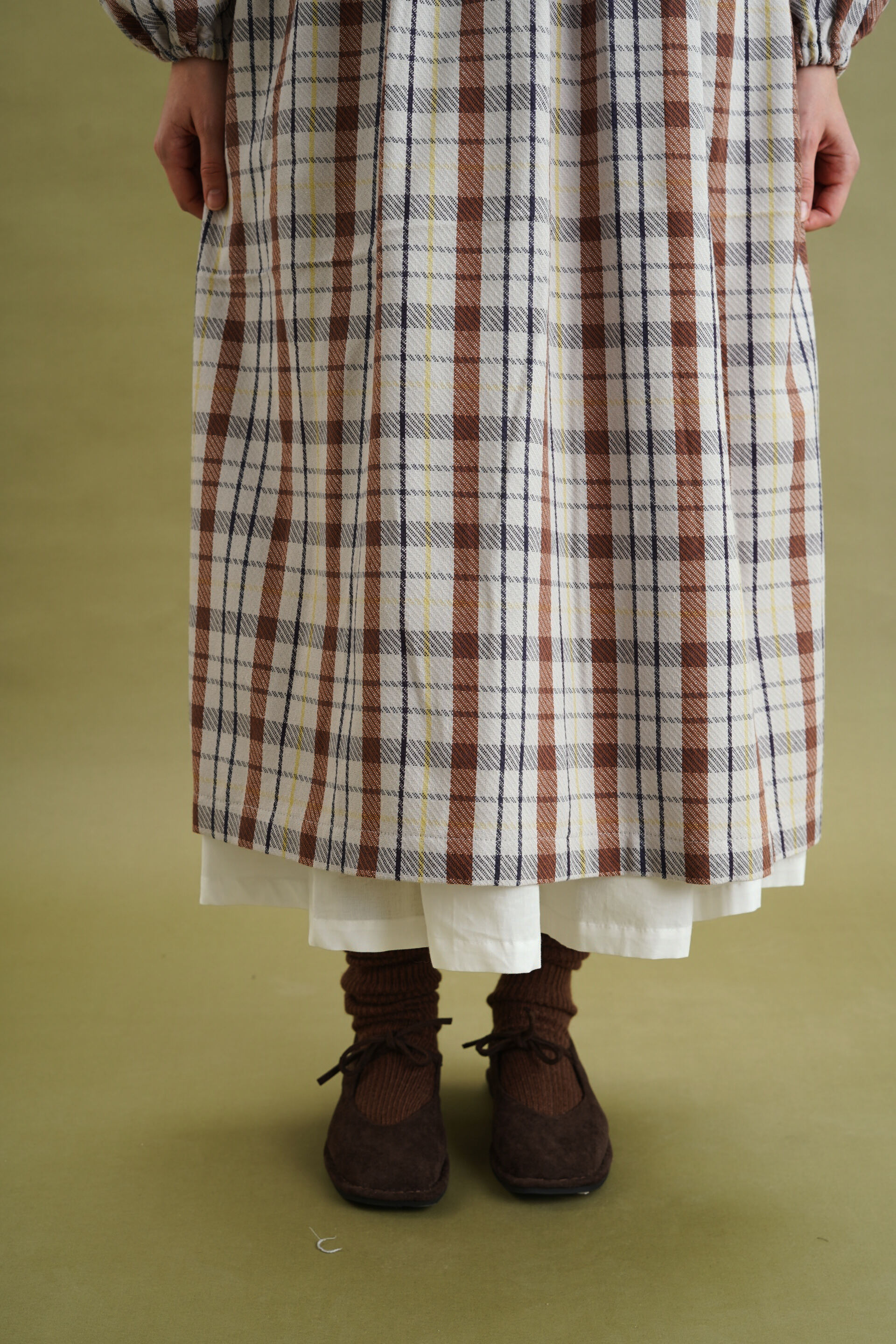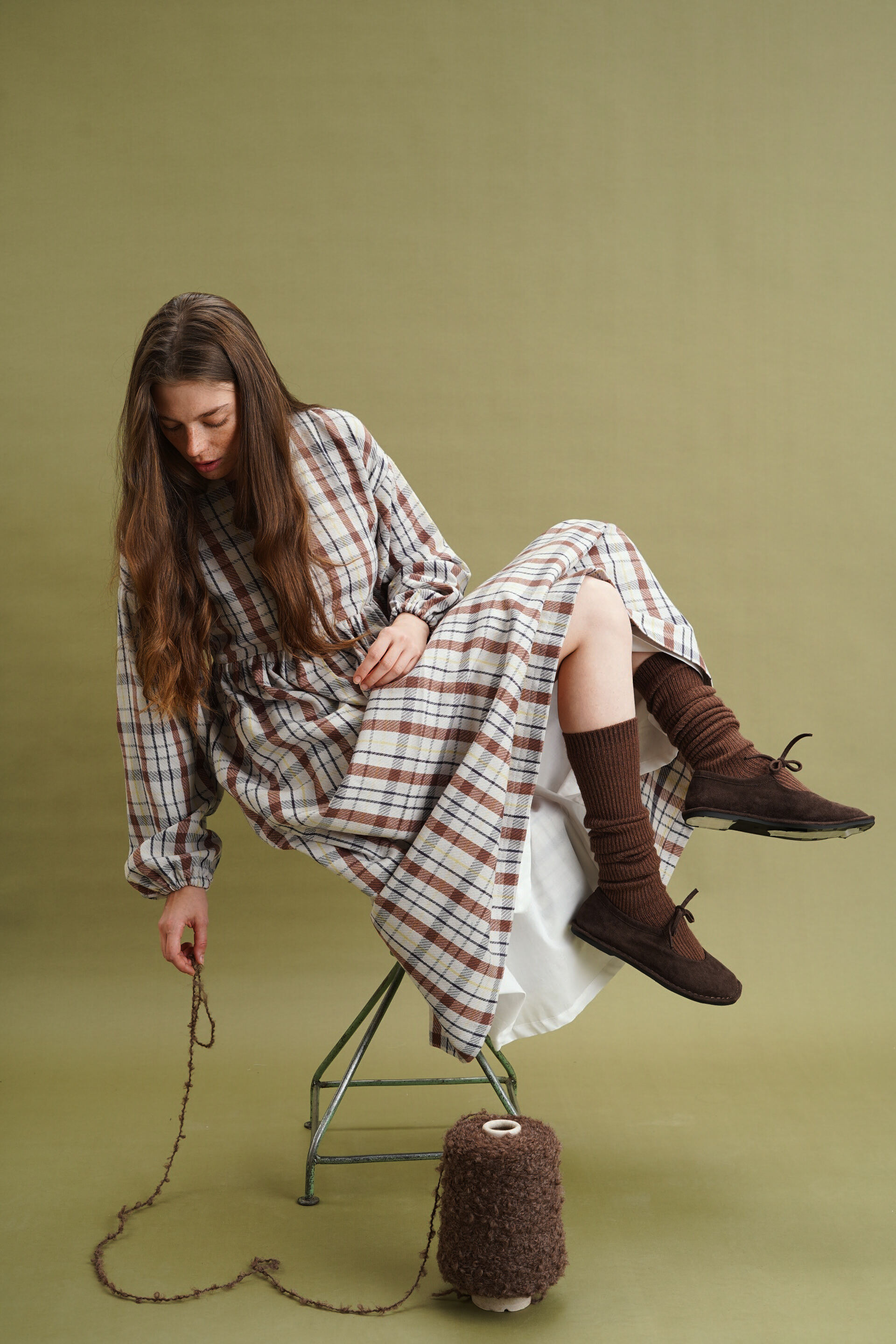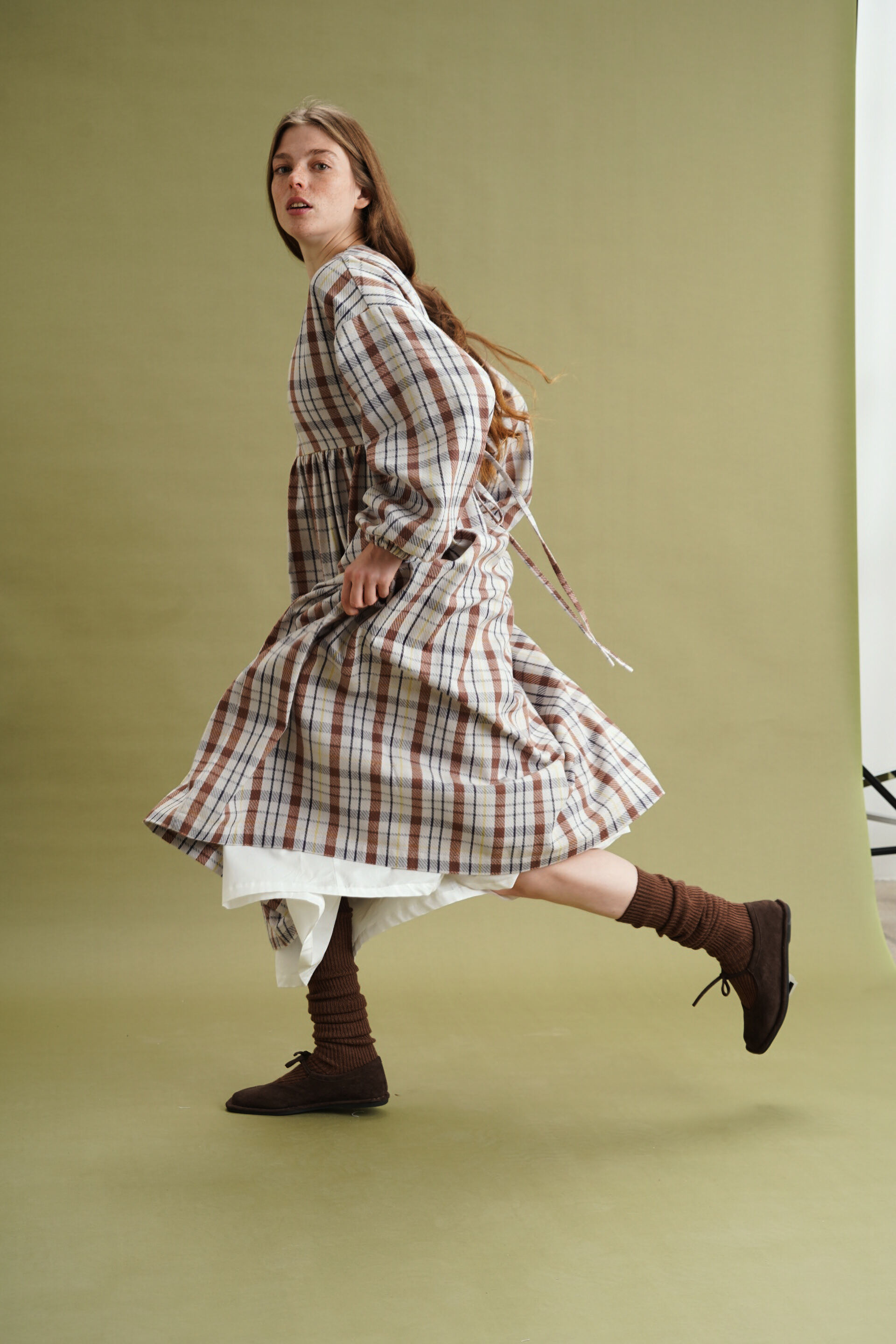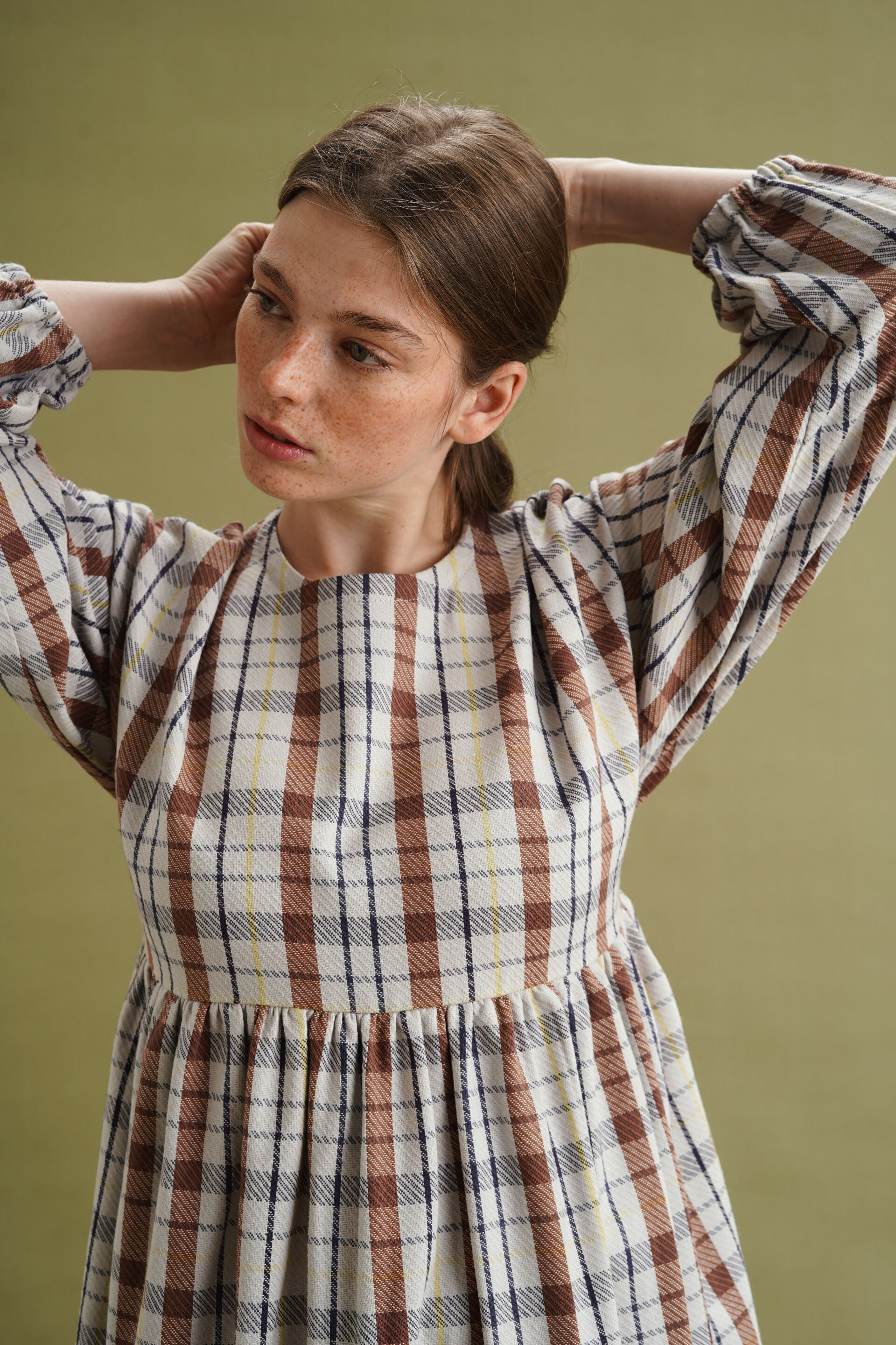 Платье оверсайз с круглым воротом и длинным рукавом на резинке. Есть завязки для регулировки посадки и карманы.