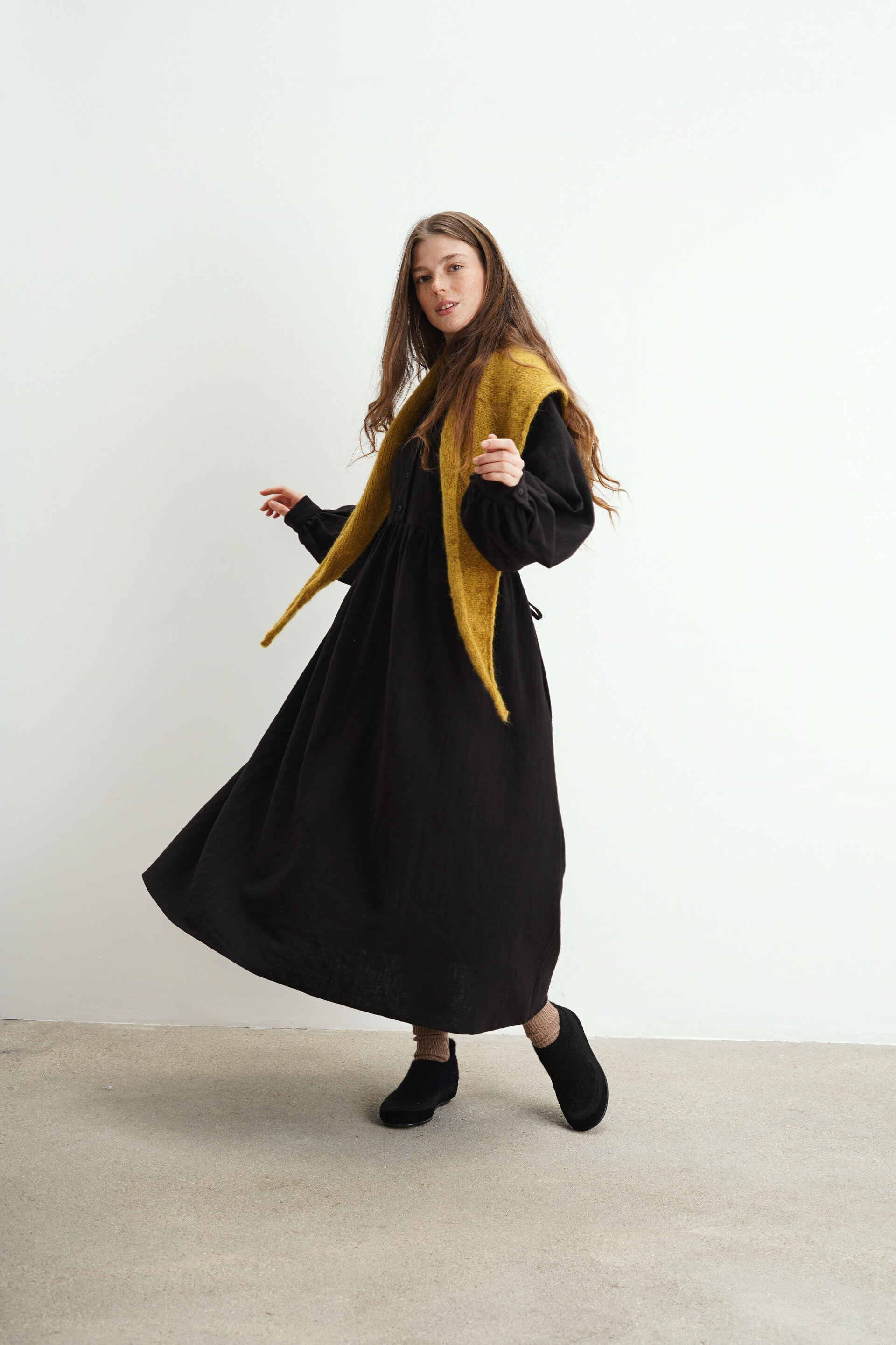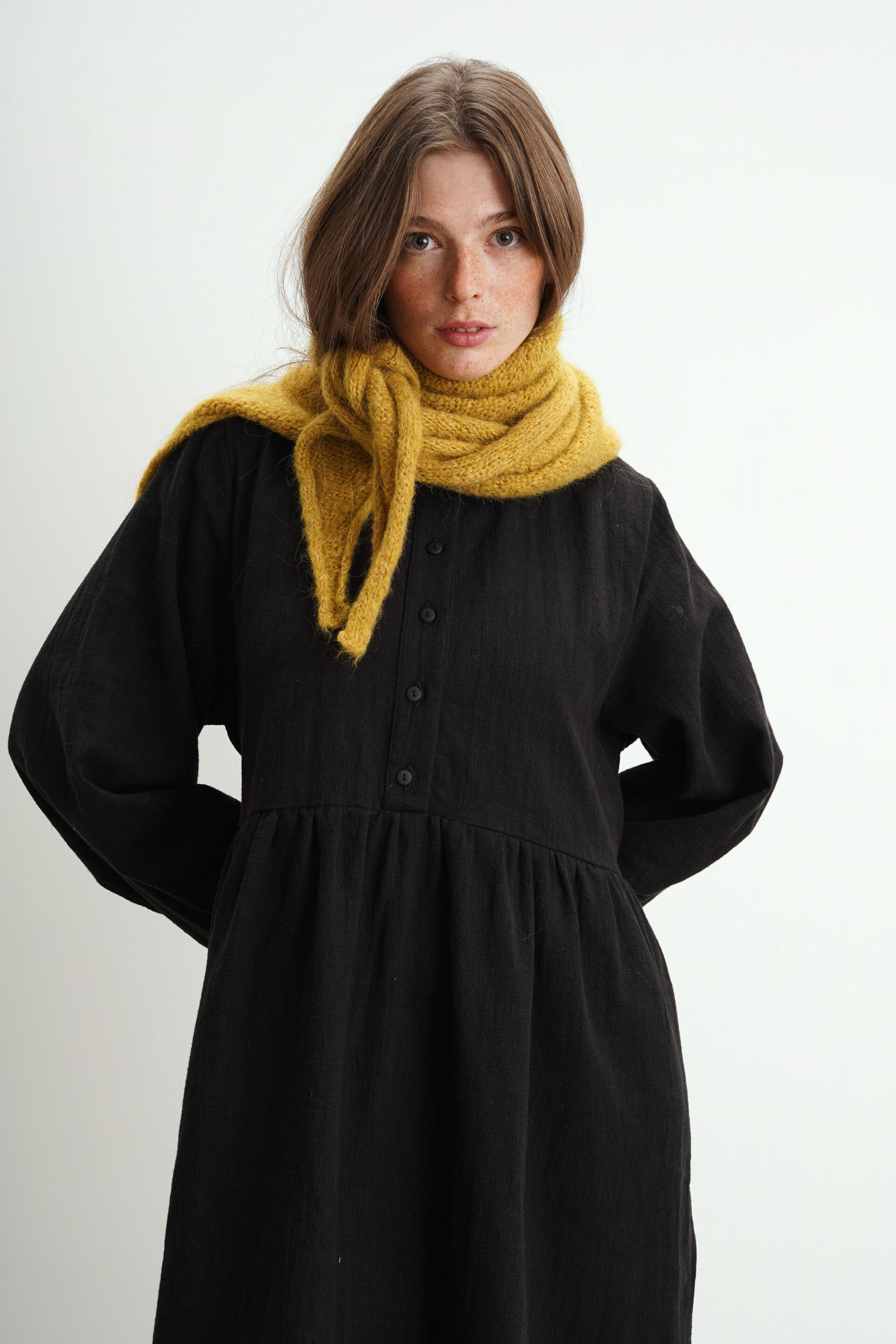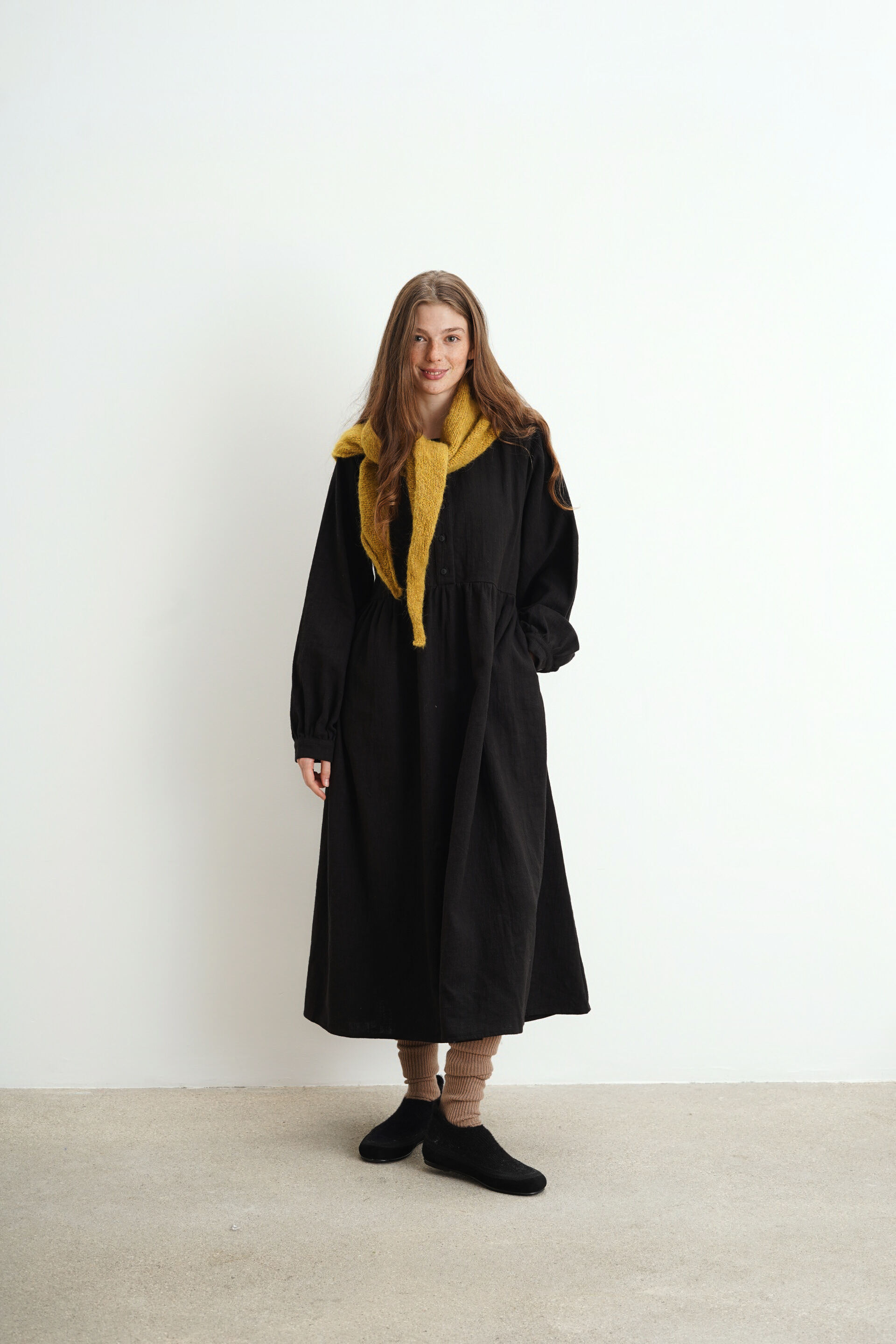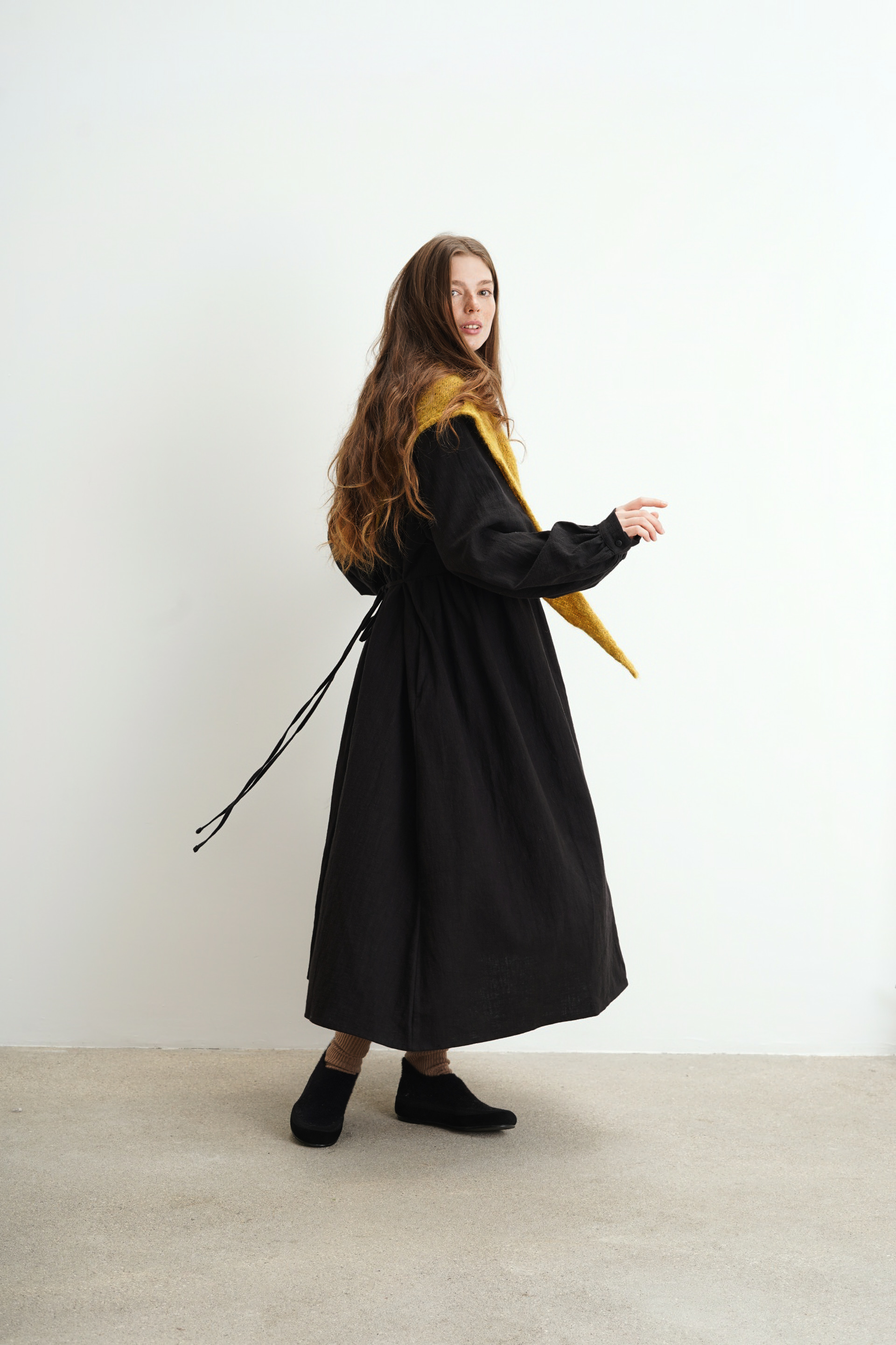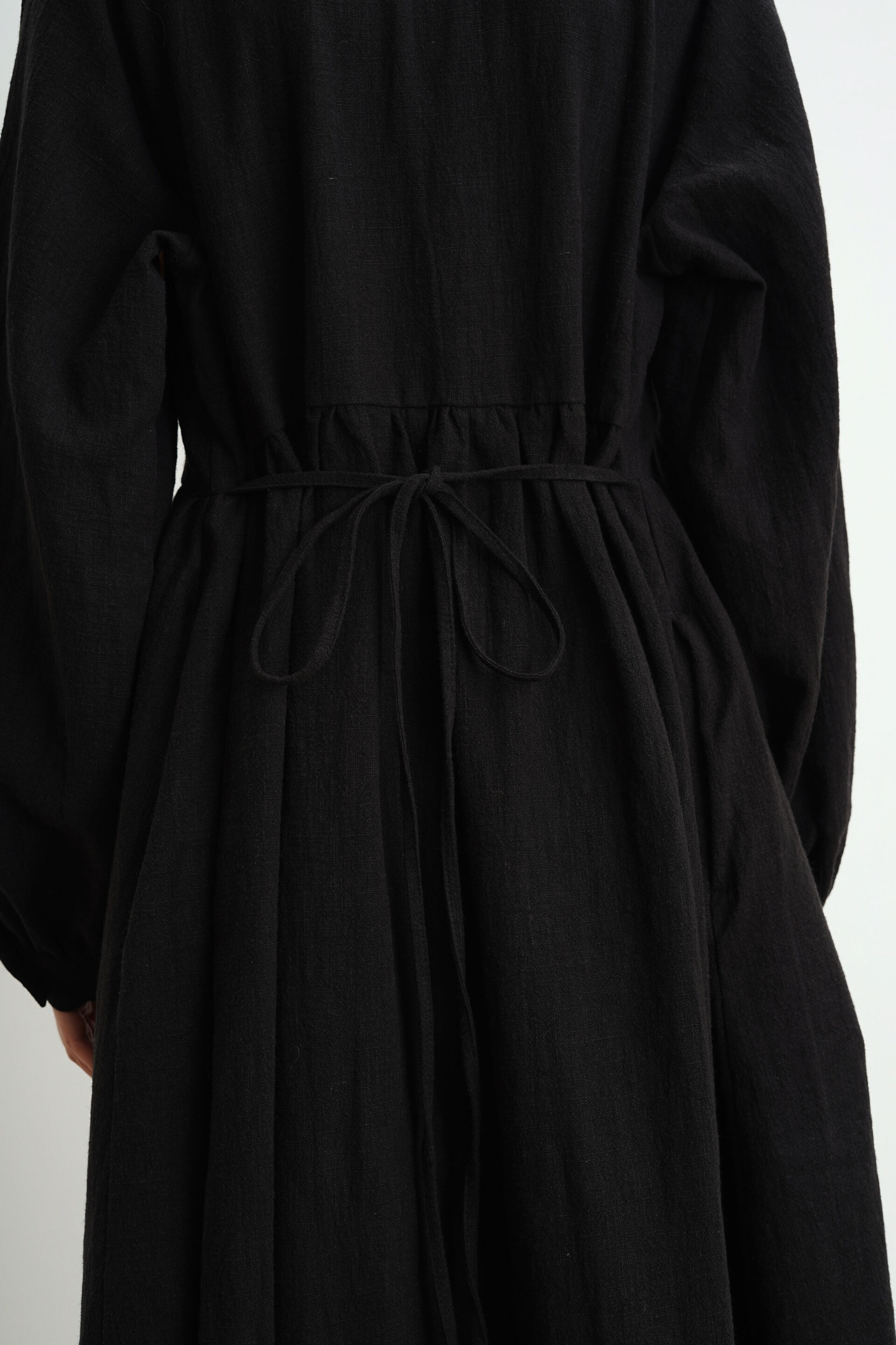 Платье свободного кроя с пуговицами на груди из крапивы. Есть карманы и завязки на поясе, с помощью которых можно регулировать посадку изделия.