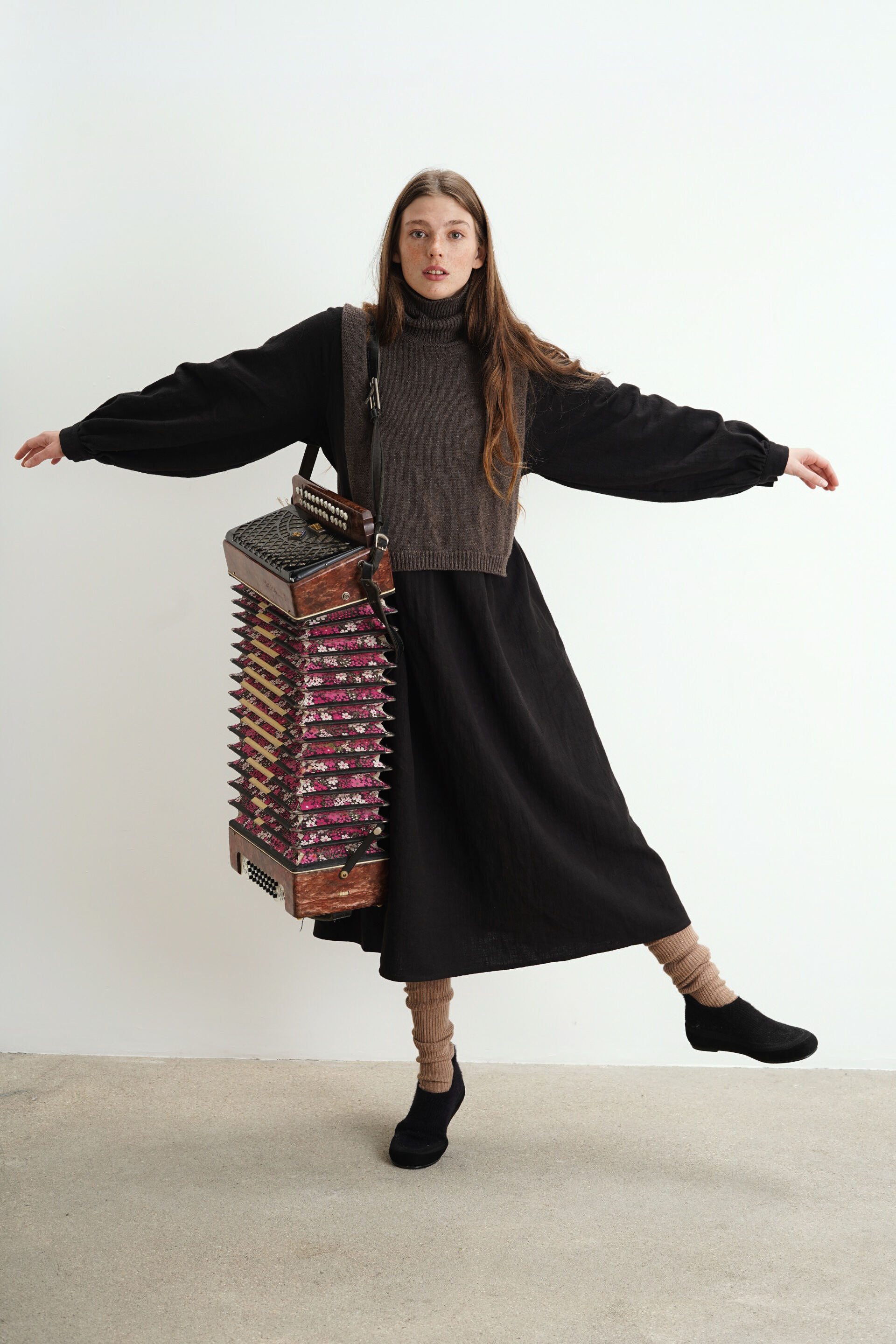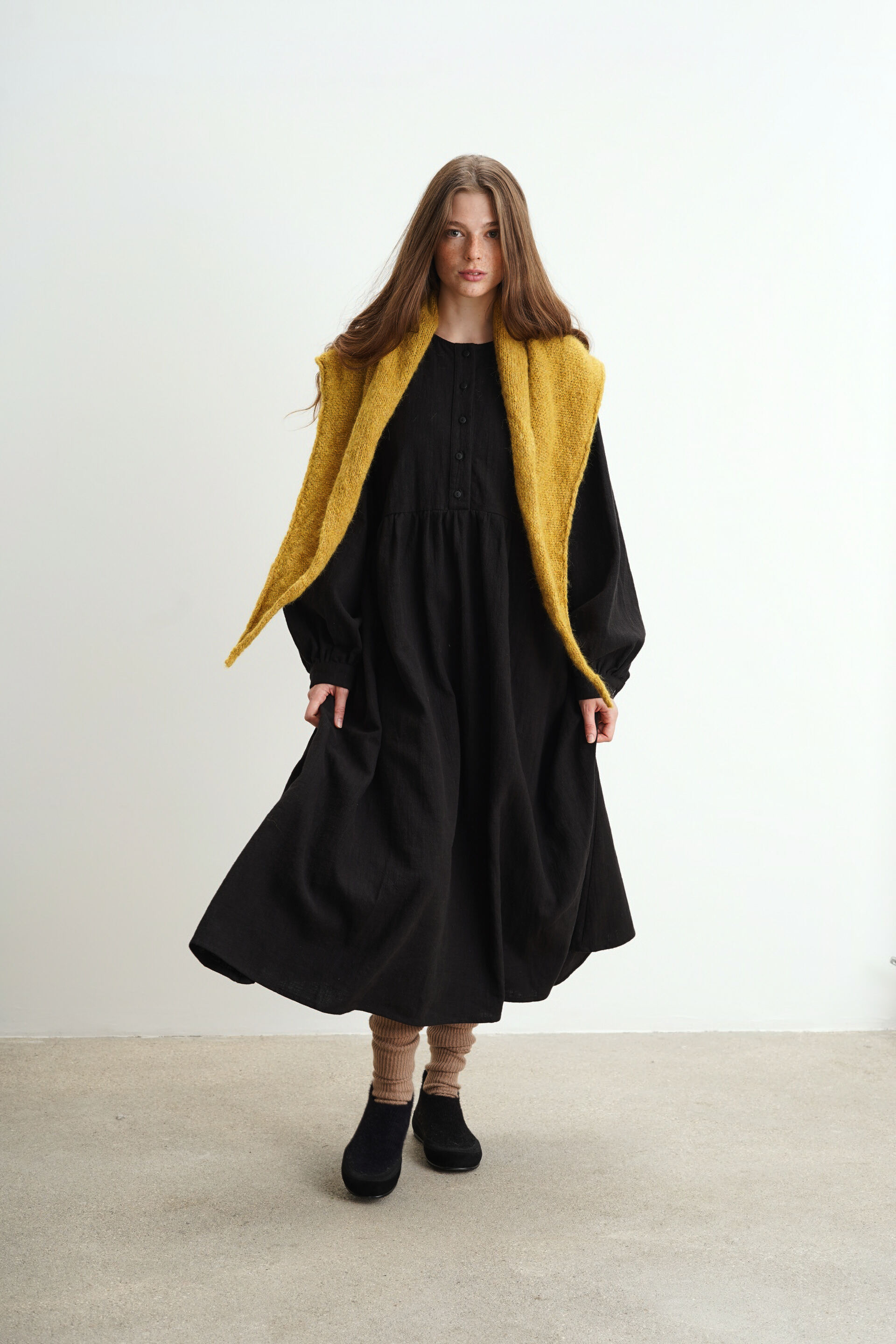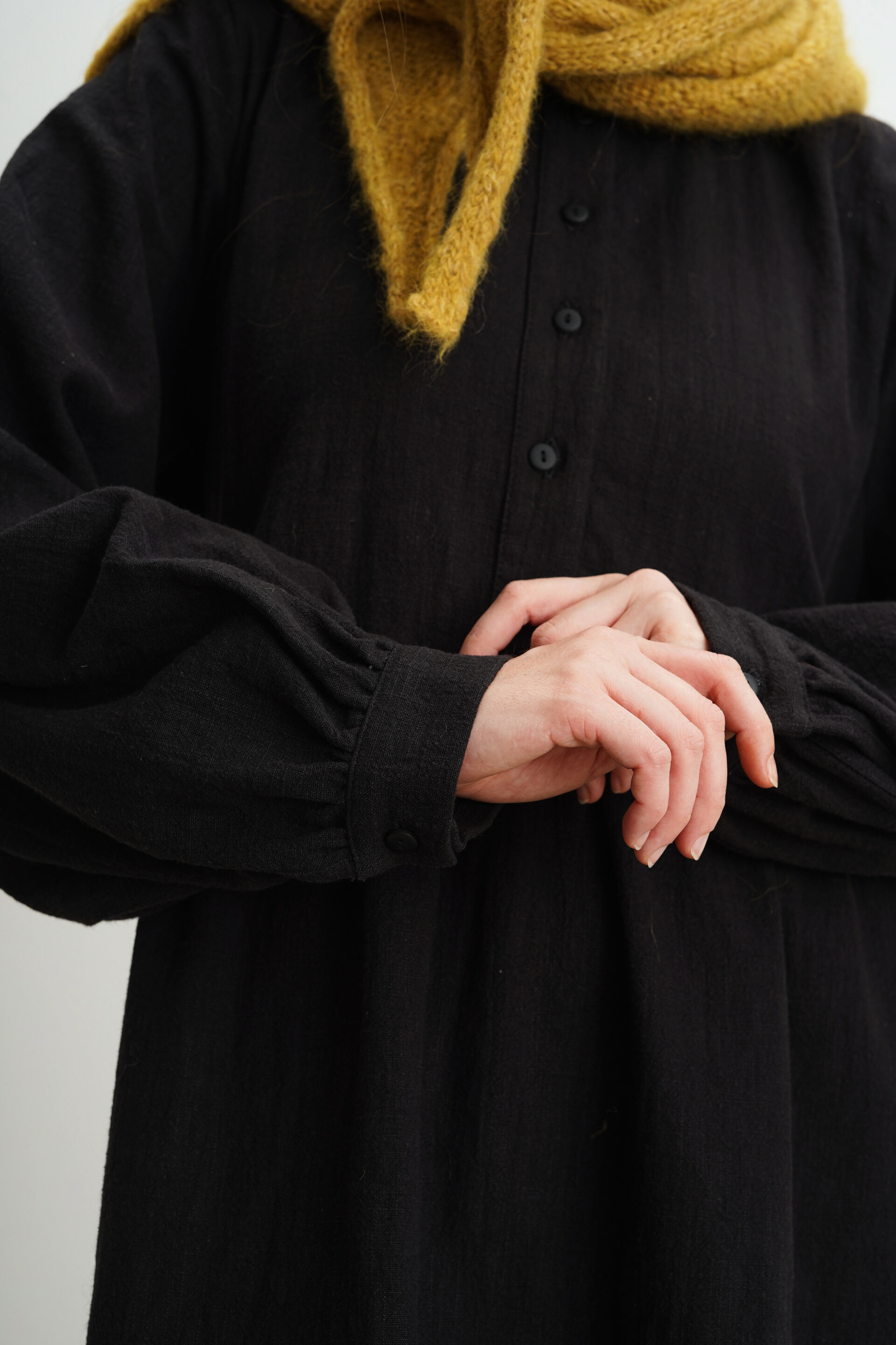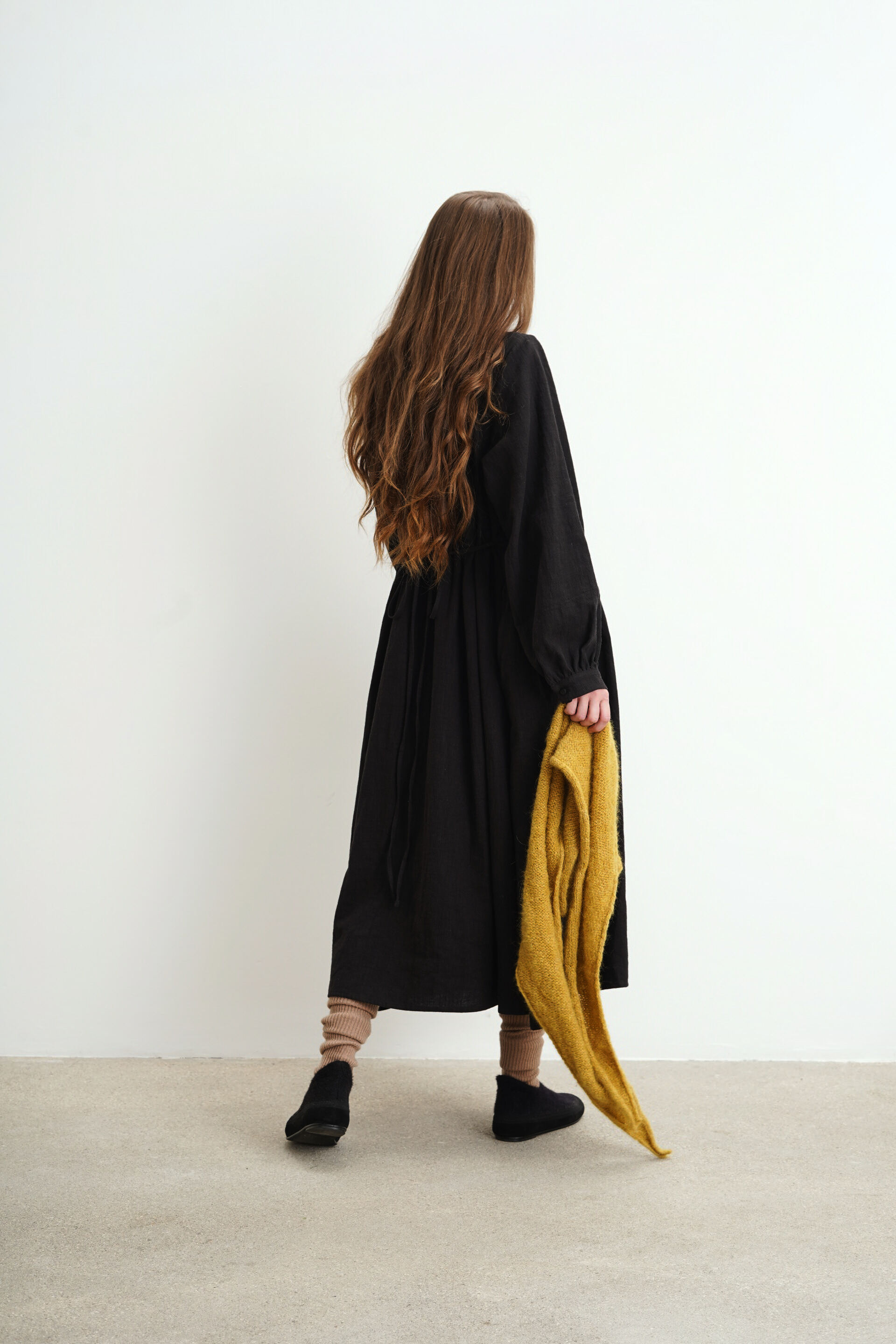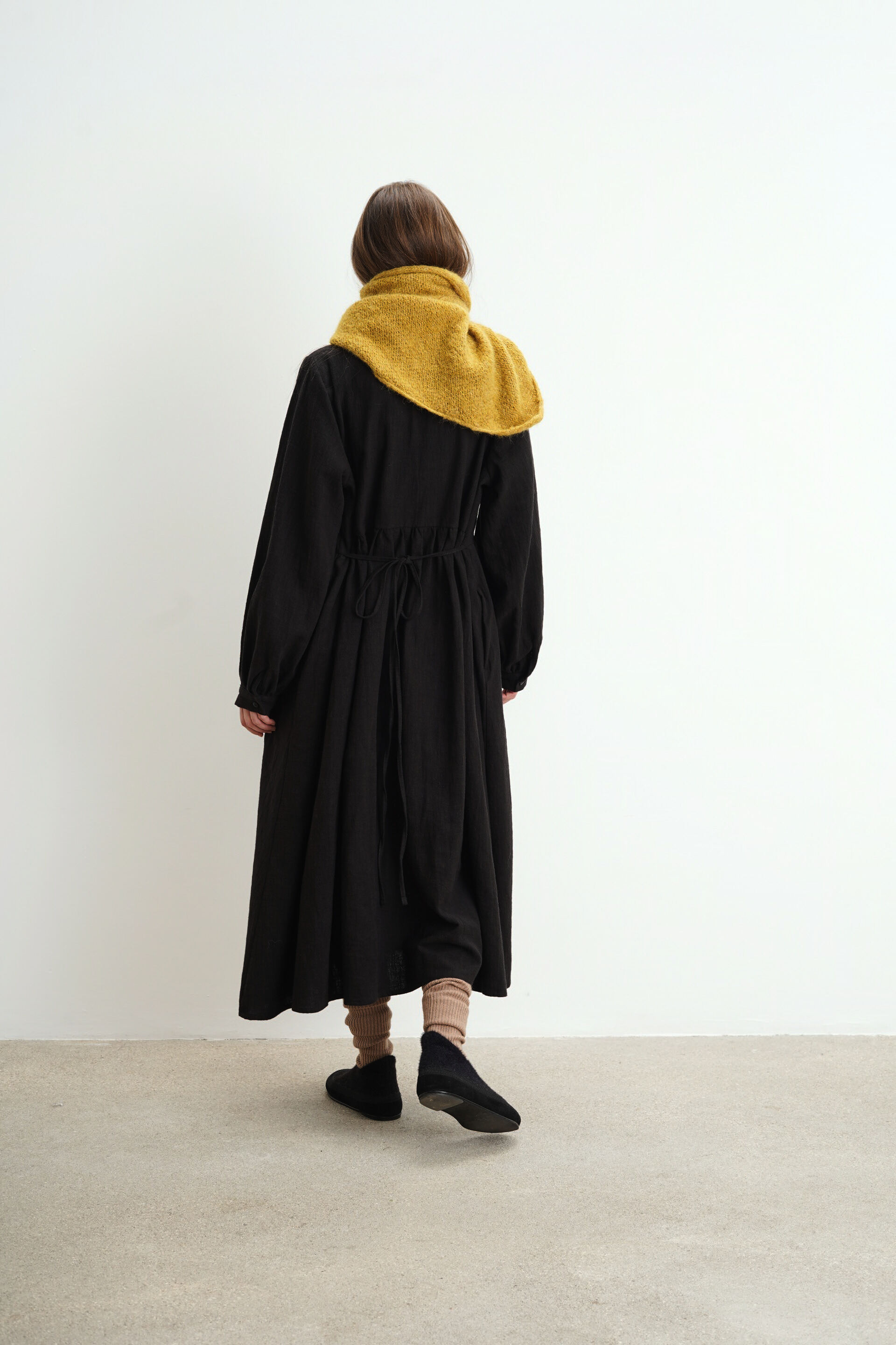 Платье свободного кроя с пуговицами на груди из крапивы. Есть карманы и завязки на поясе, с помощью которых можно регулировать посадку изделия.