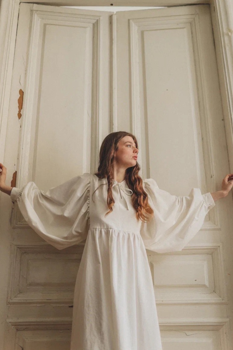 Платье свободного кроя с пышным рукавом, завязками и хлопковым подкладом.