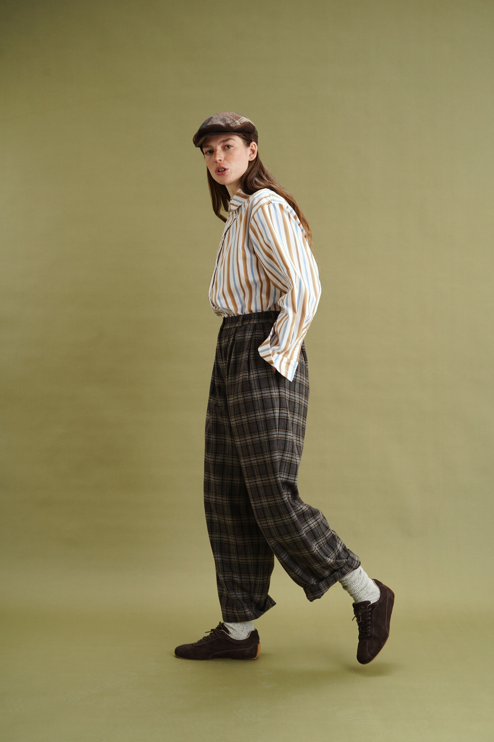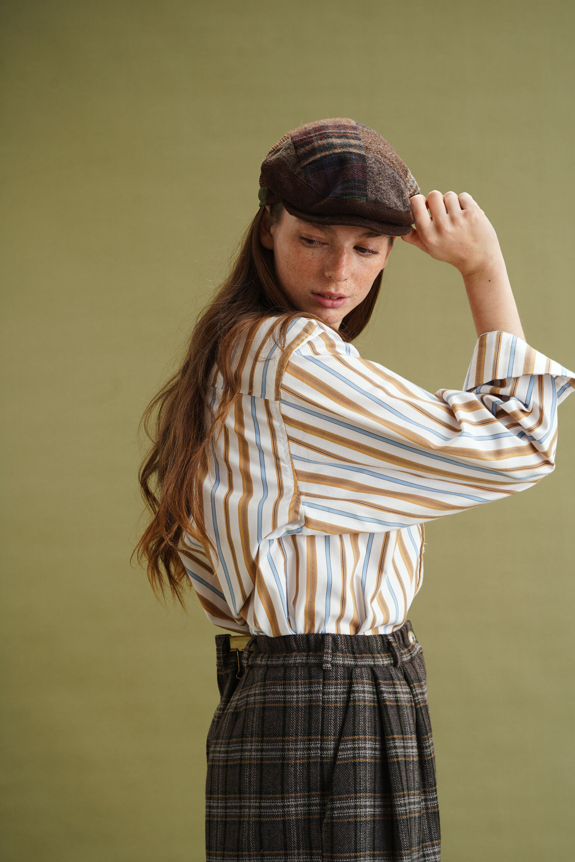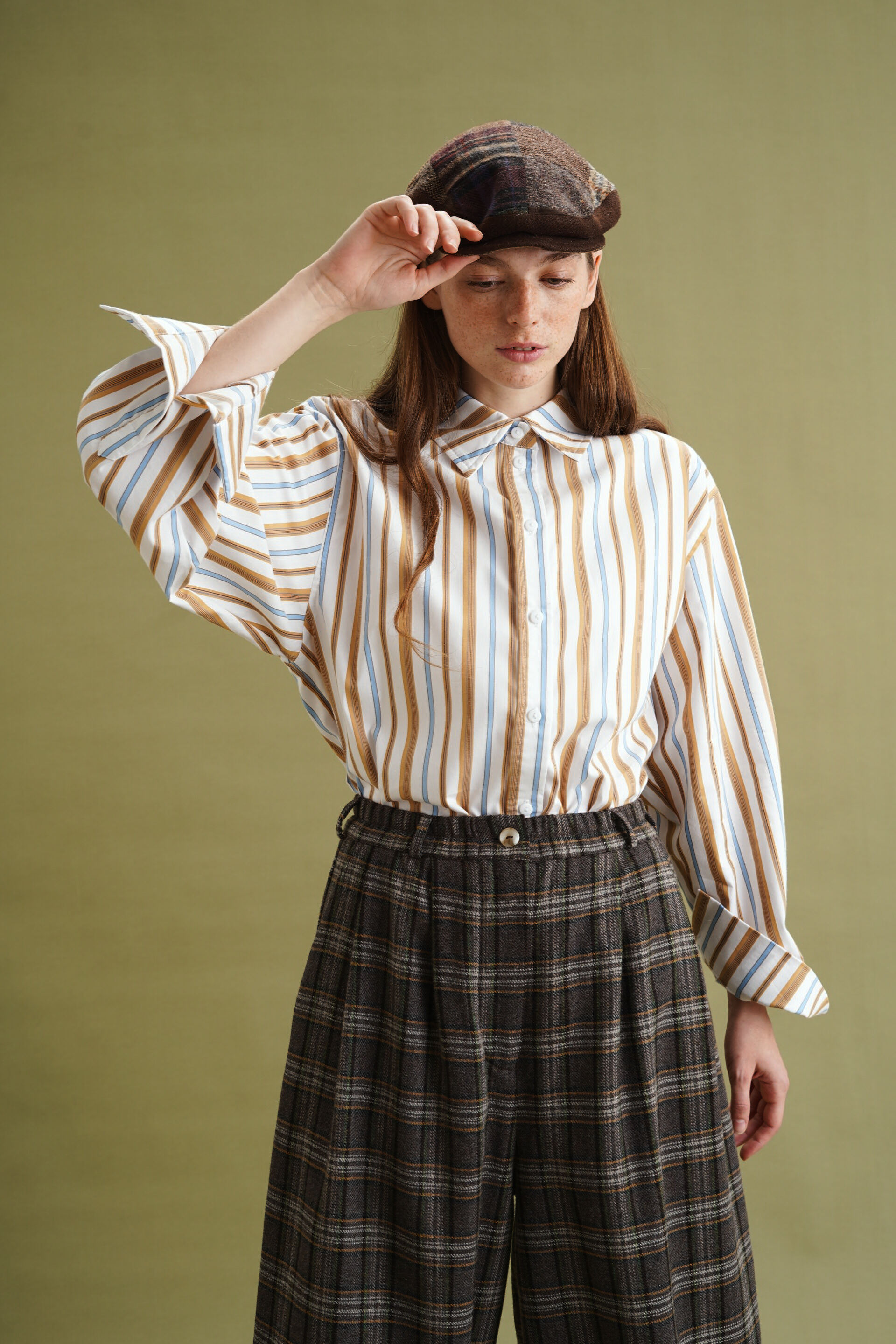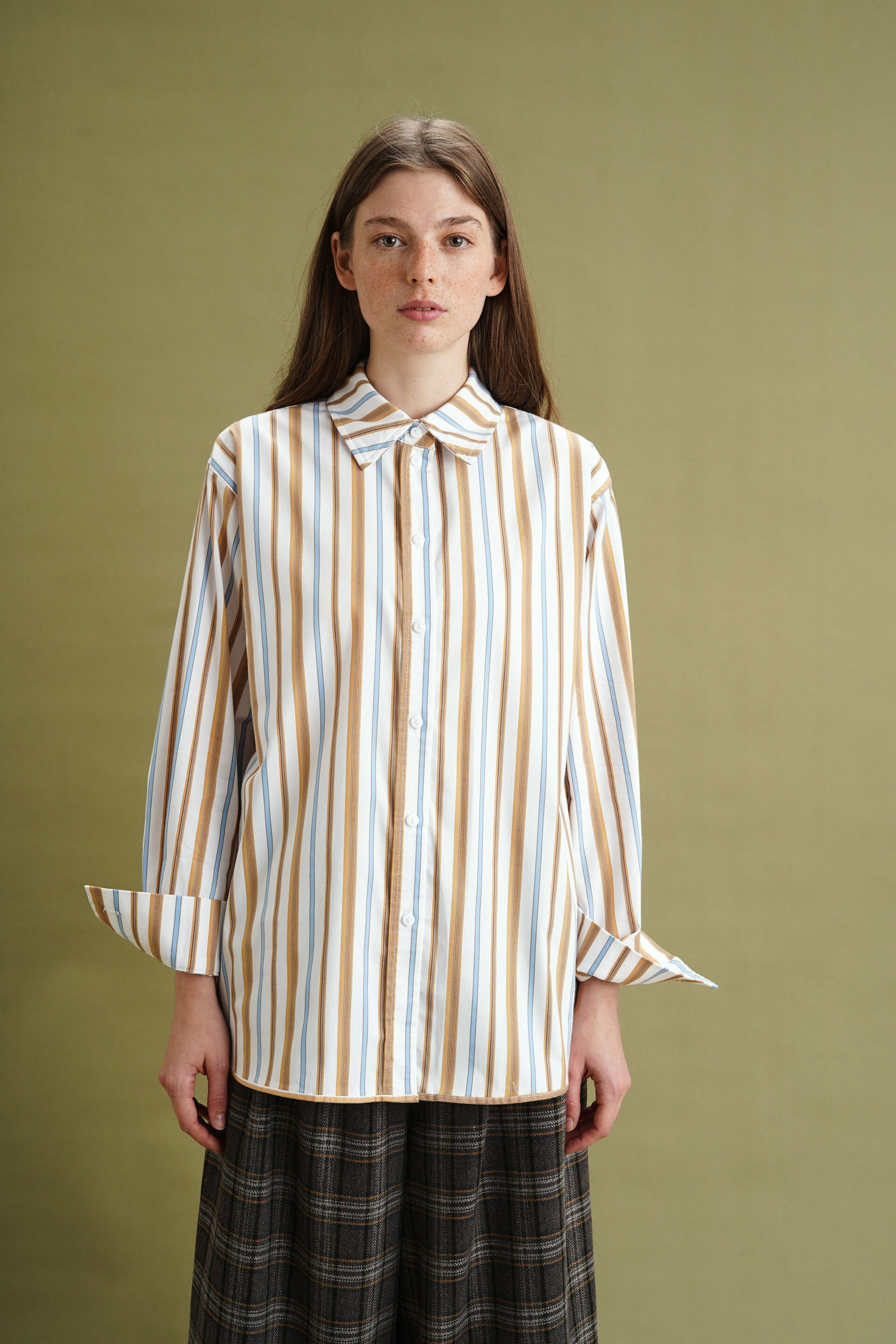Рубашка классического кроя, голубая и коричневая полоска на айвори