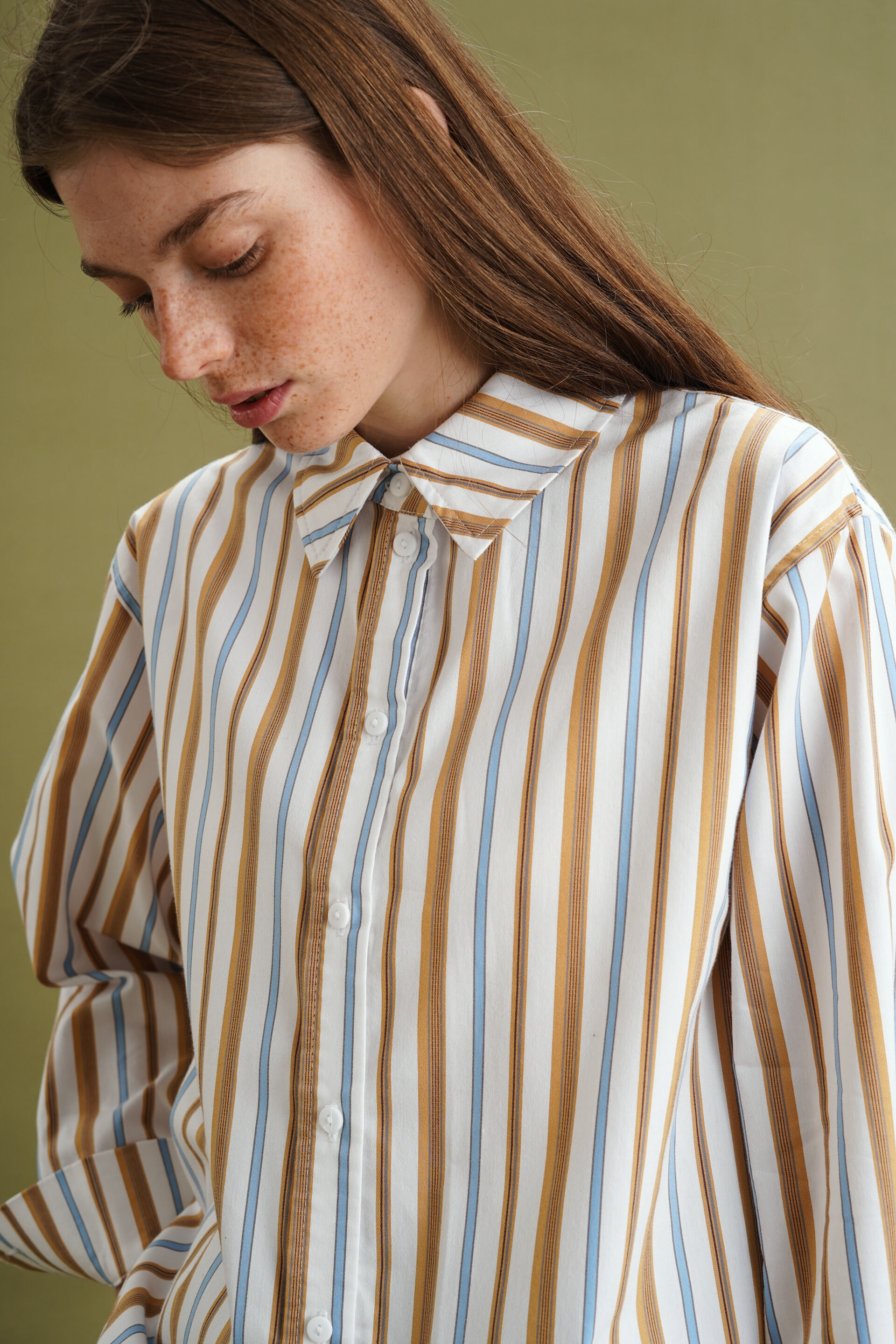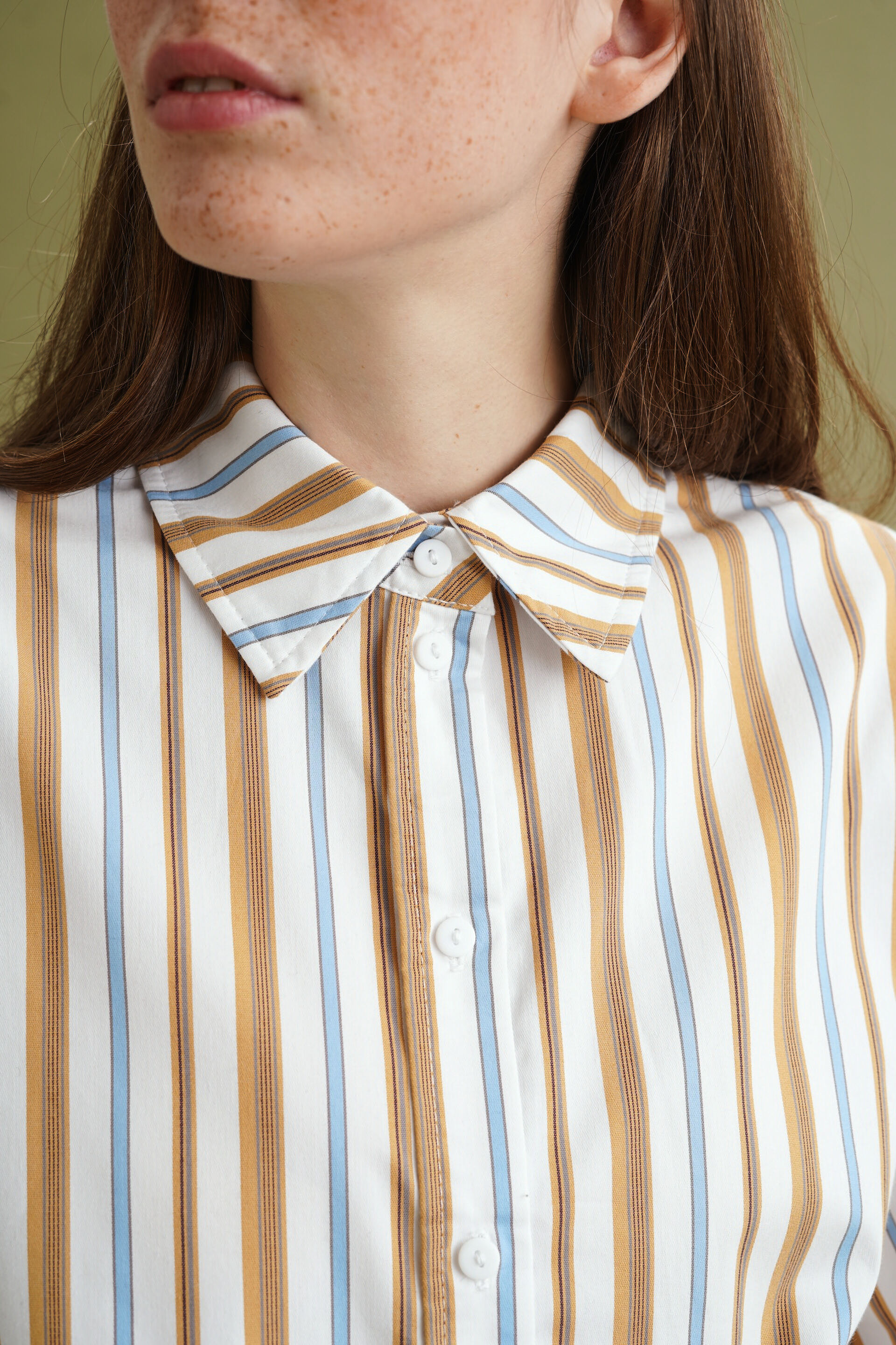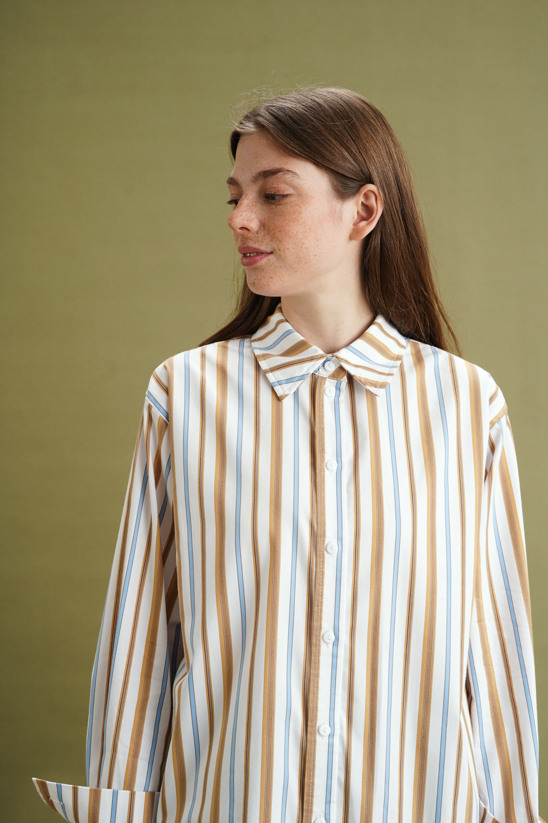 Рубашка классического кроя. Пуговицы полностью расстегиваются.