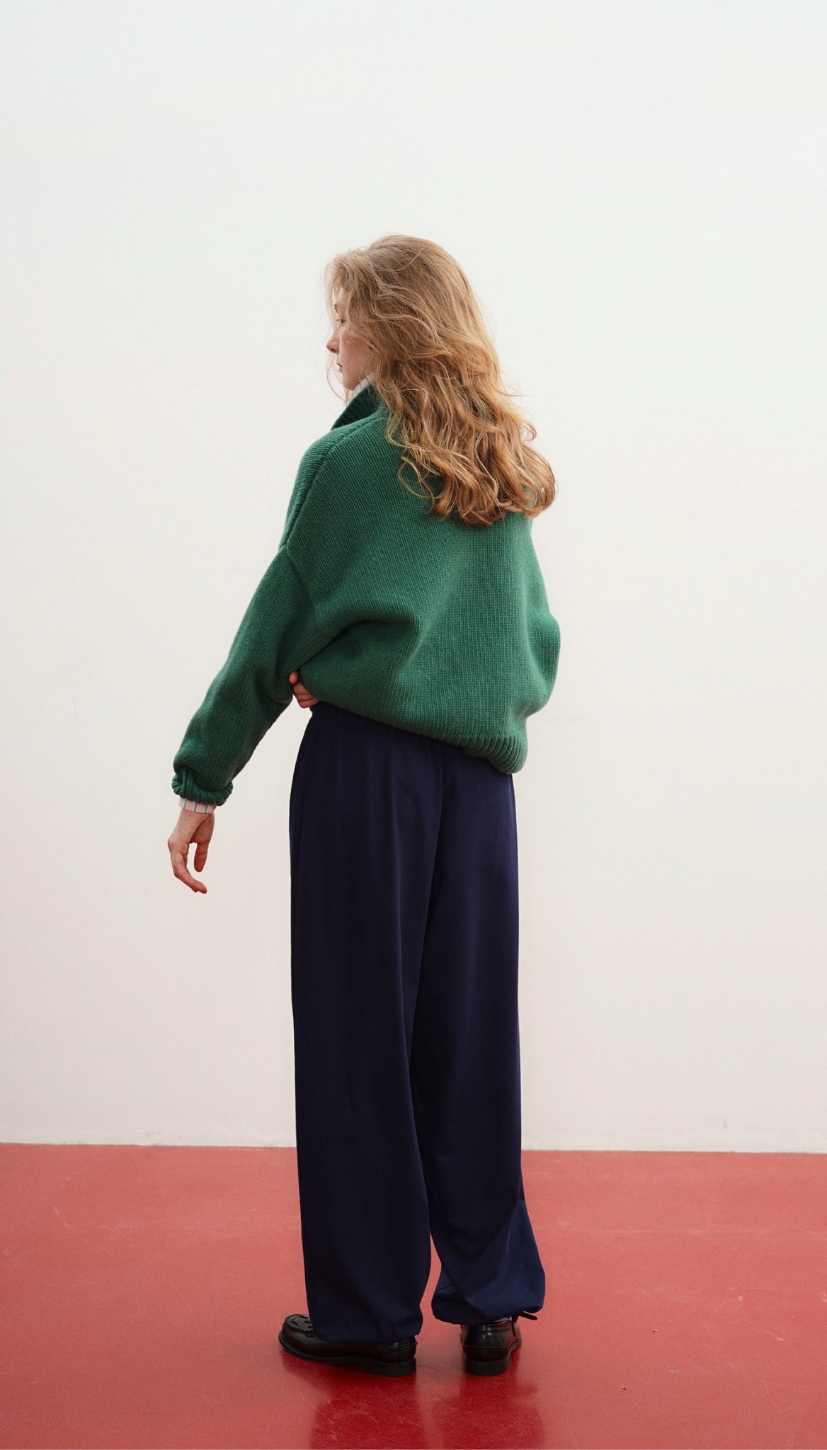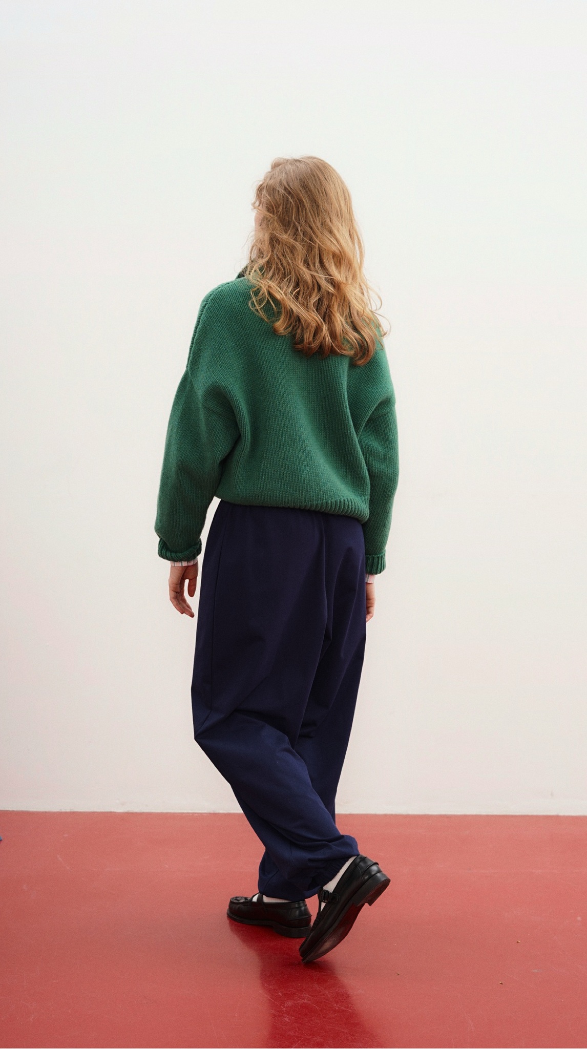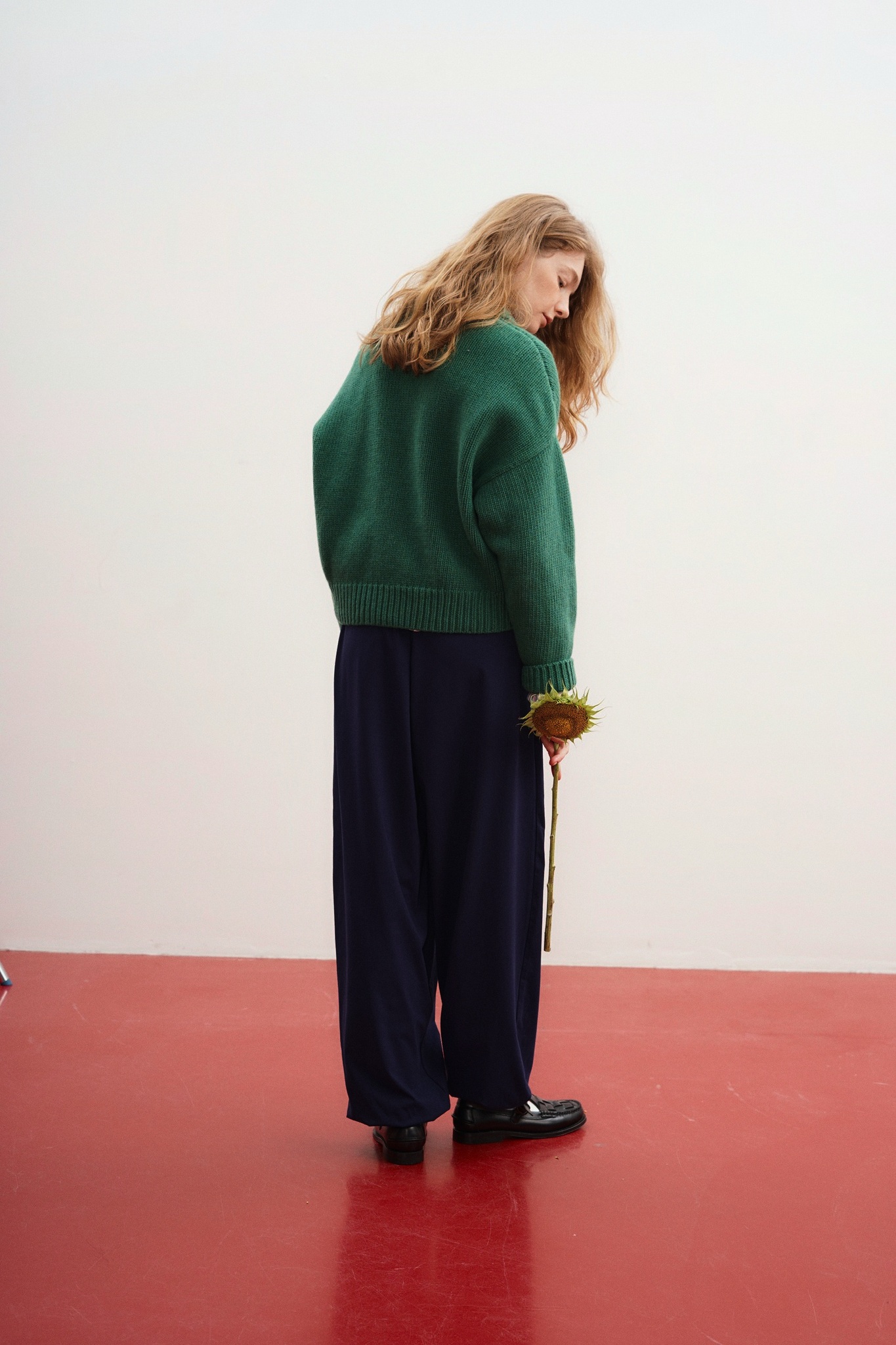 Брюки свободного кроя, пояс на резинке, внизу штанин сборка на резинке.