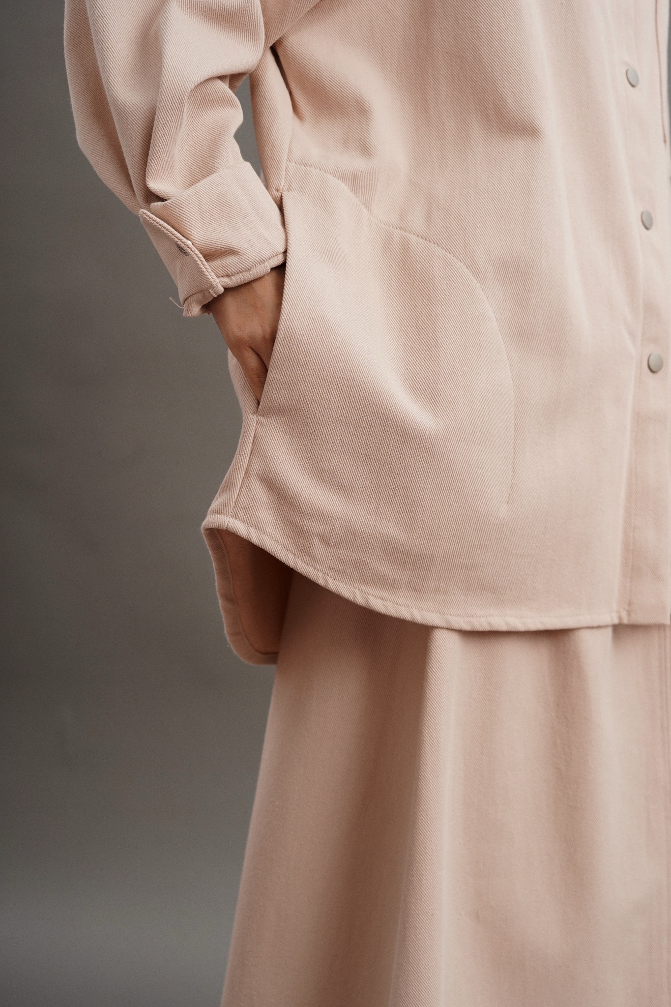 Юбка-трапеция из джинсы, ткань держит форму. Пояс резинкой. Без карманов.